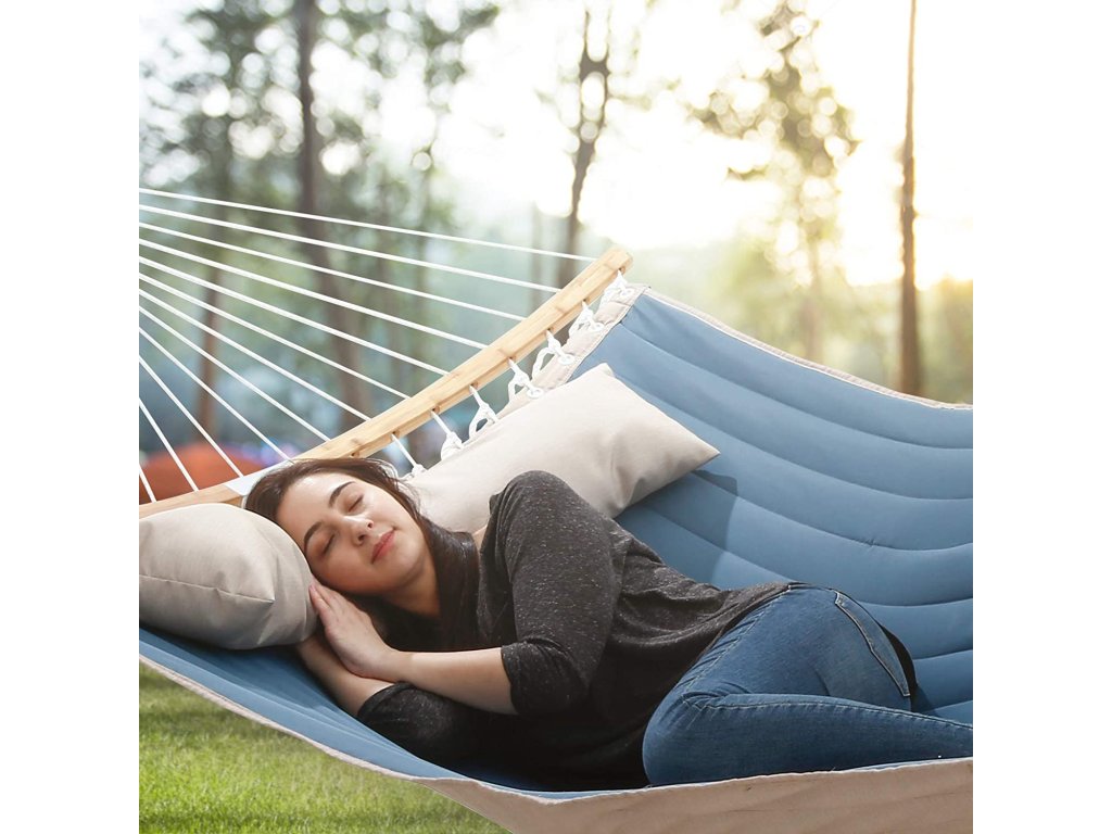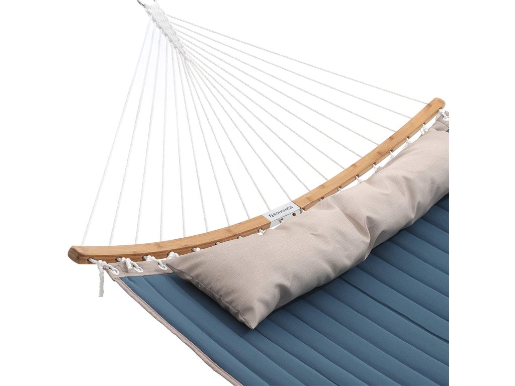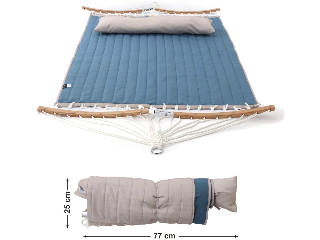 Polstrovaná dvojitá houpací síť, prošívaná houpací síť s odnímatelnými zakřivenými bambusovými rozpěrnými tyčemi, houpací lůžko s polštářem, tkanina Oxford, 200 x 140 cm, nosnost 225 kg, modrá a béžová.