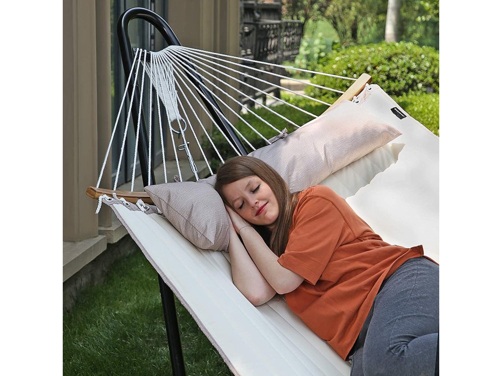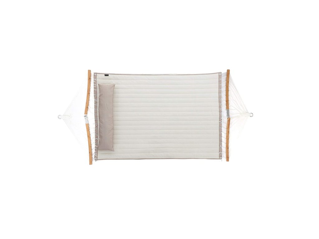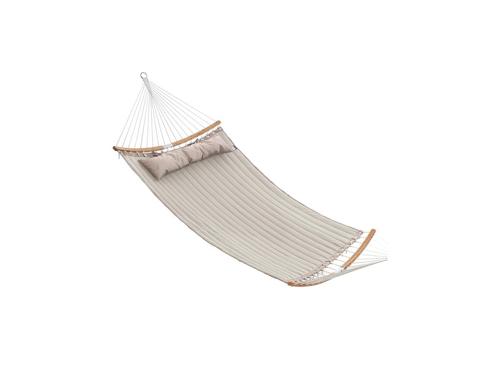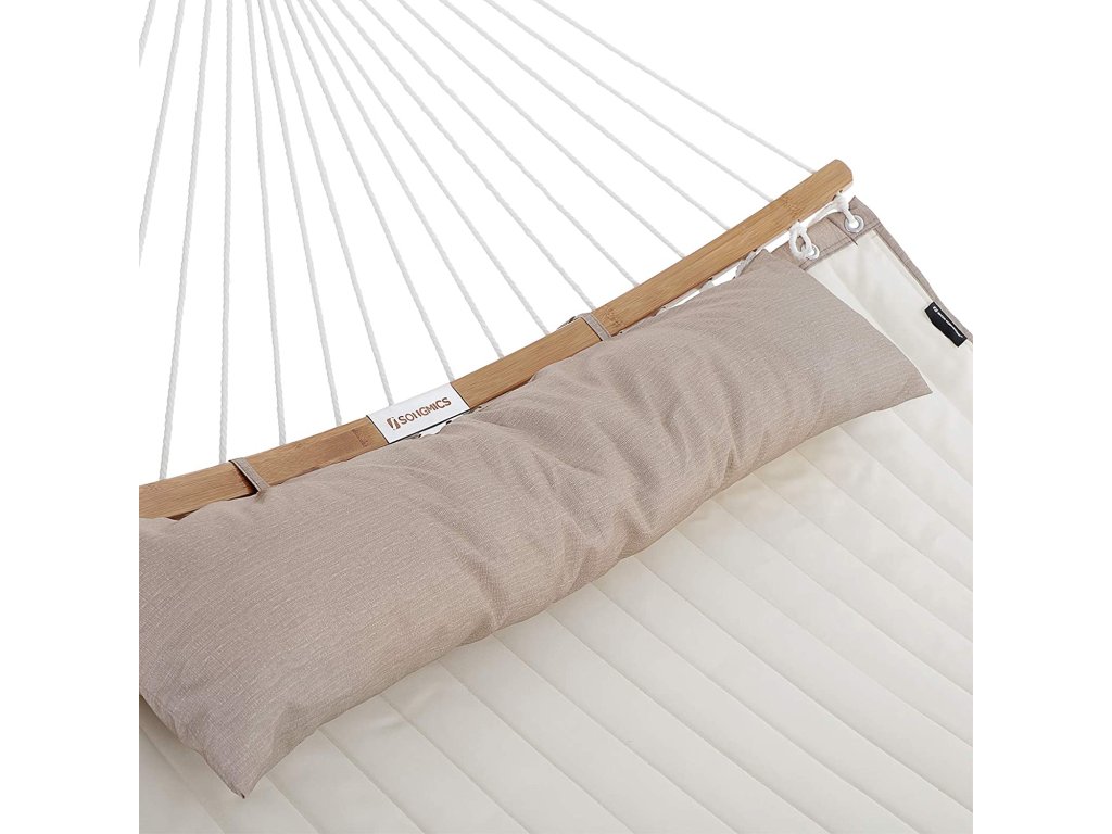 Polstrovaná dvojitá houpací síť, prošívaná houpací síť s odnímatelnými zakřivenými bambusovými tyčemi, houpací lůžko s polštářem, tkanina Oxford, 200 x 140 cm, nosnost 225 kg, krémová a béžová.