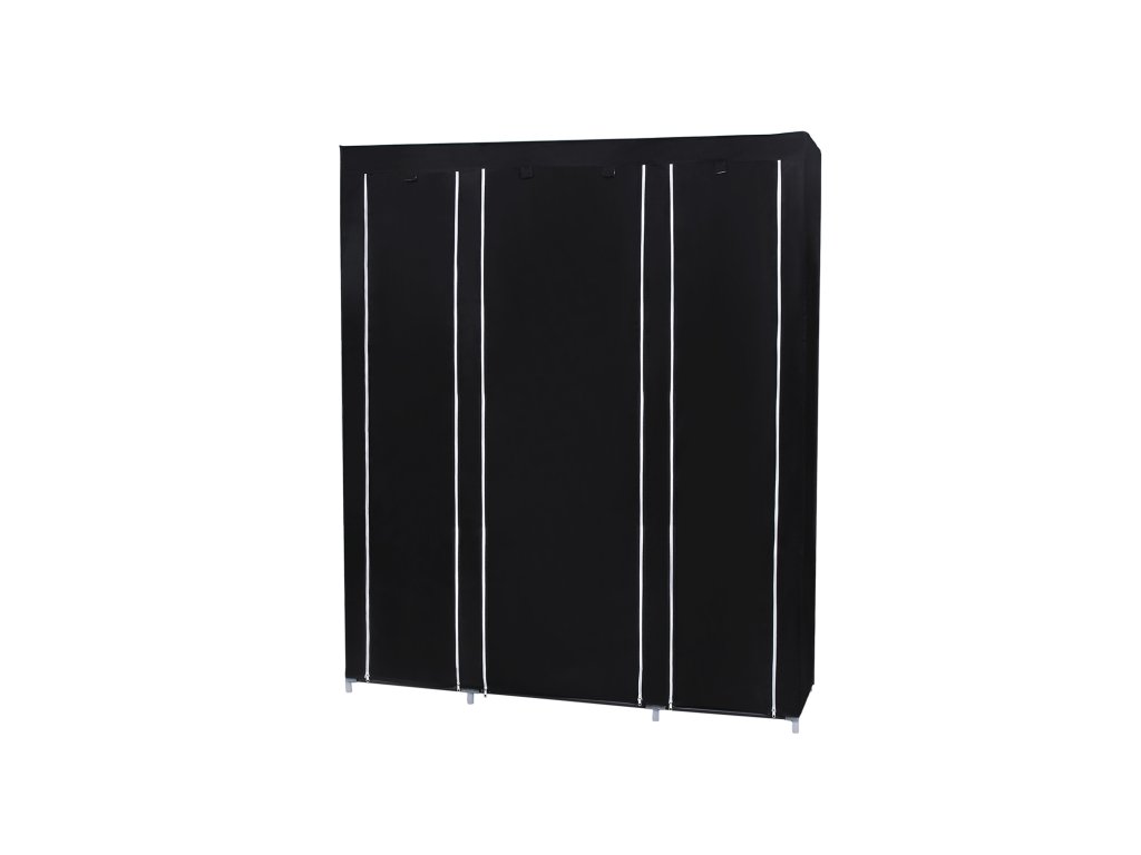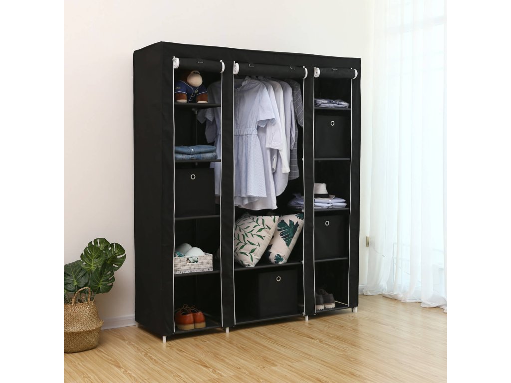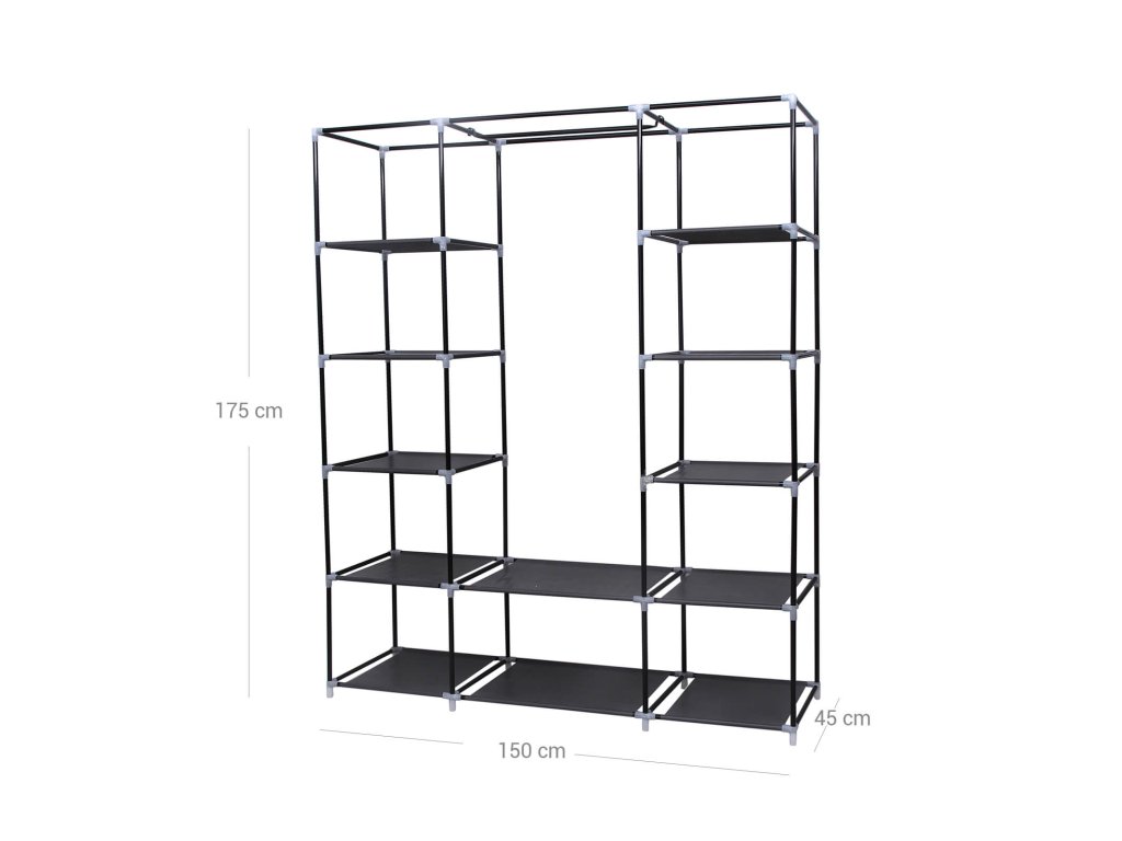 Přenosná šatní skříň, skládací skříň, organizér pro ukládání oděvů s tyčí na zavěšení, police, látkový potah, do ložnice, šatny, 150 x 45 x 175 cm, černá.