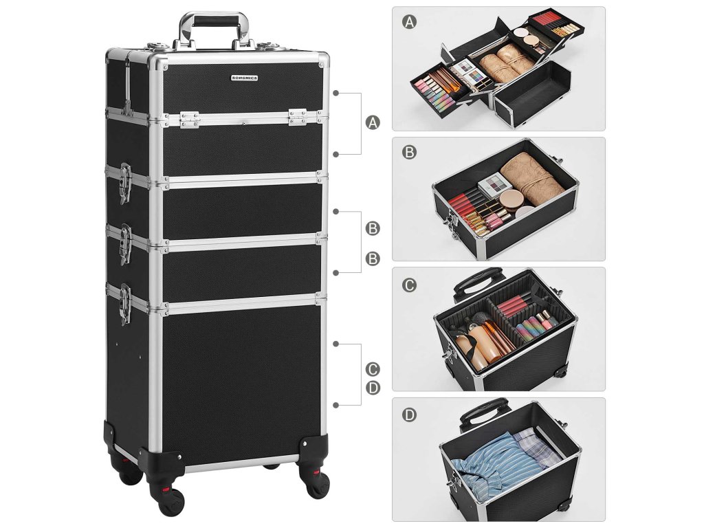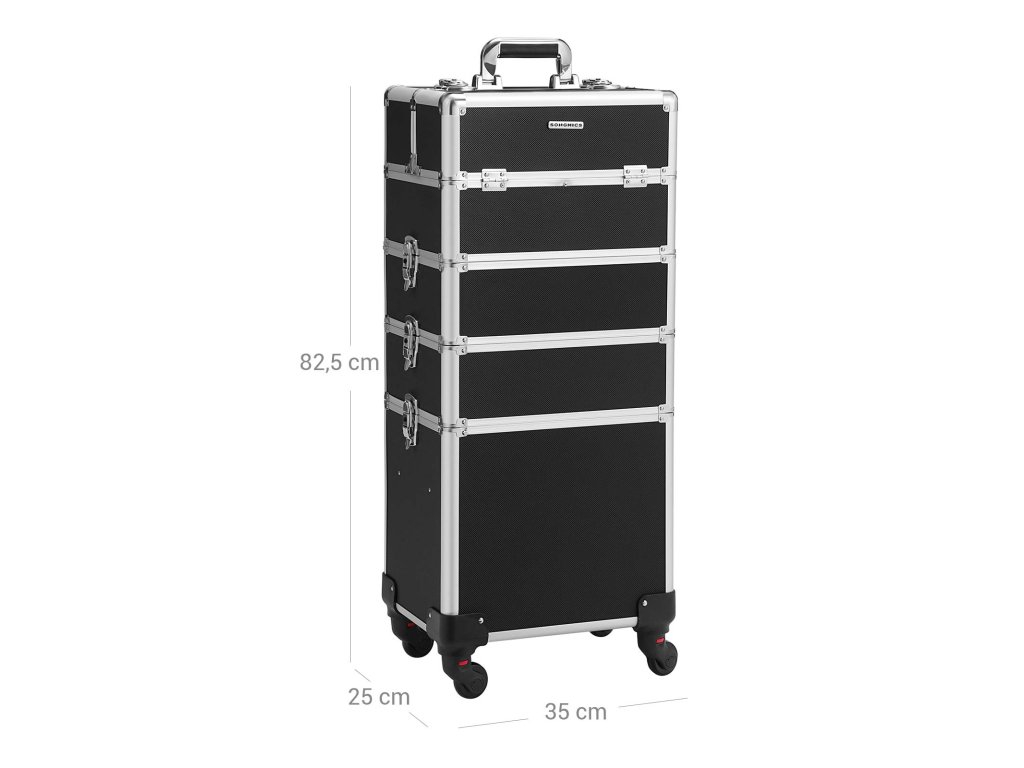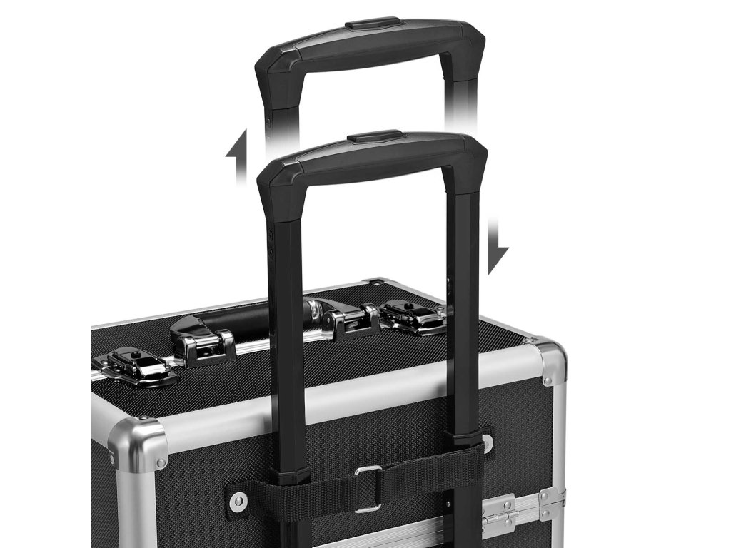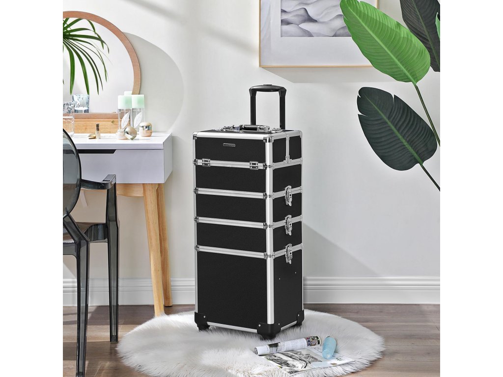 Profesionální kufřík na líčení, cestovní kosmetický vozík 4 v 1, velký kosmetický vozík pro kadeřníky, uzamykatelný kufřík na kolečkách s univerzálními kolečky o 360°, černý.