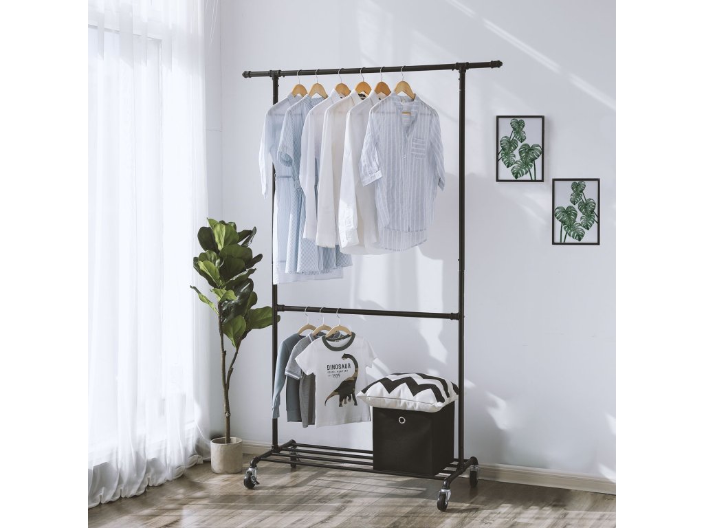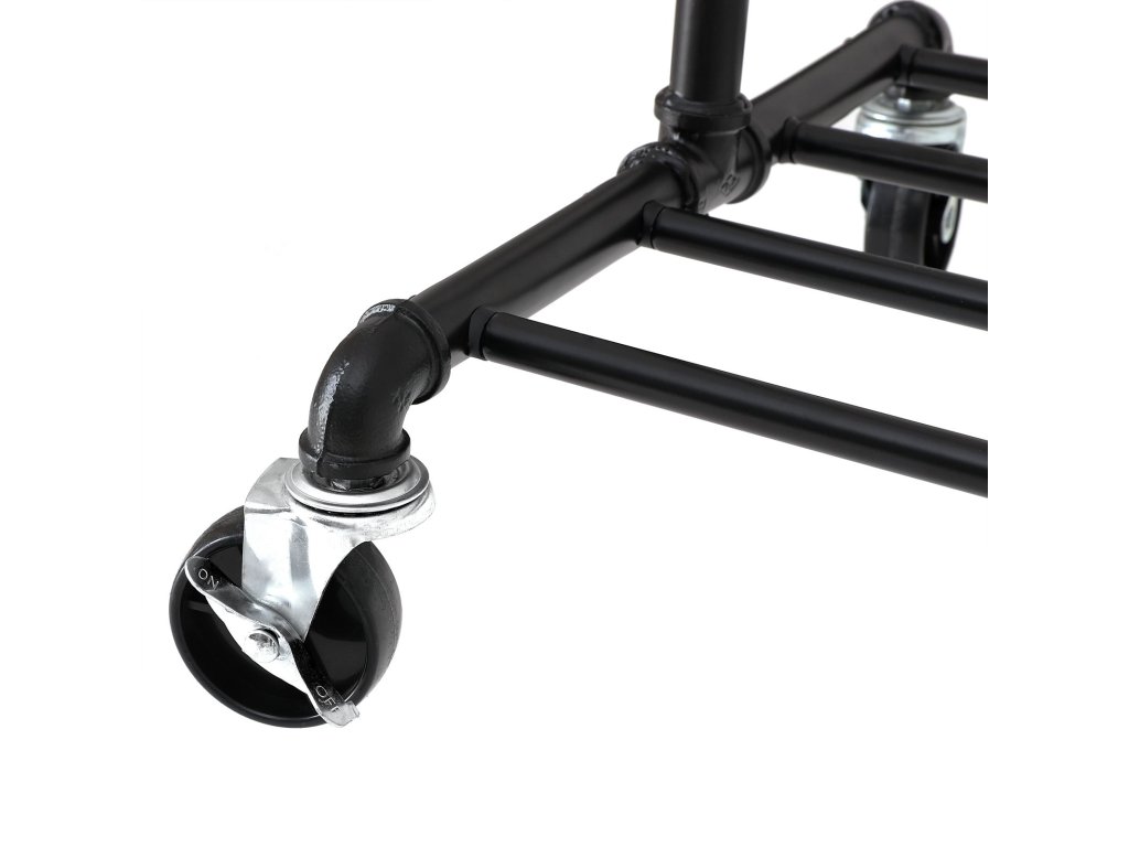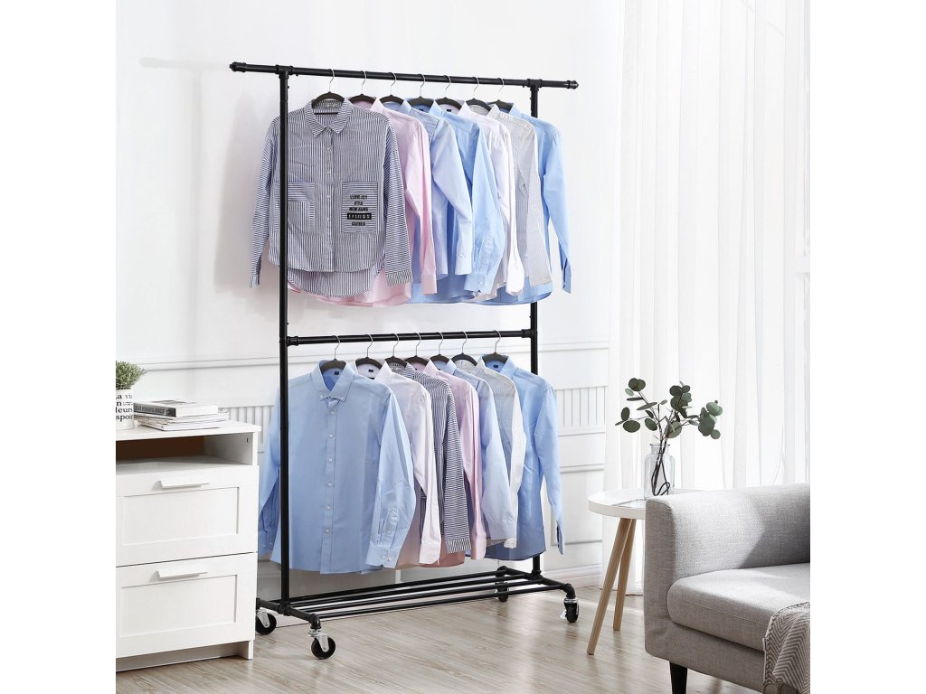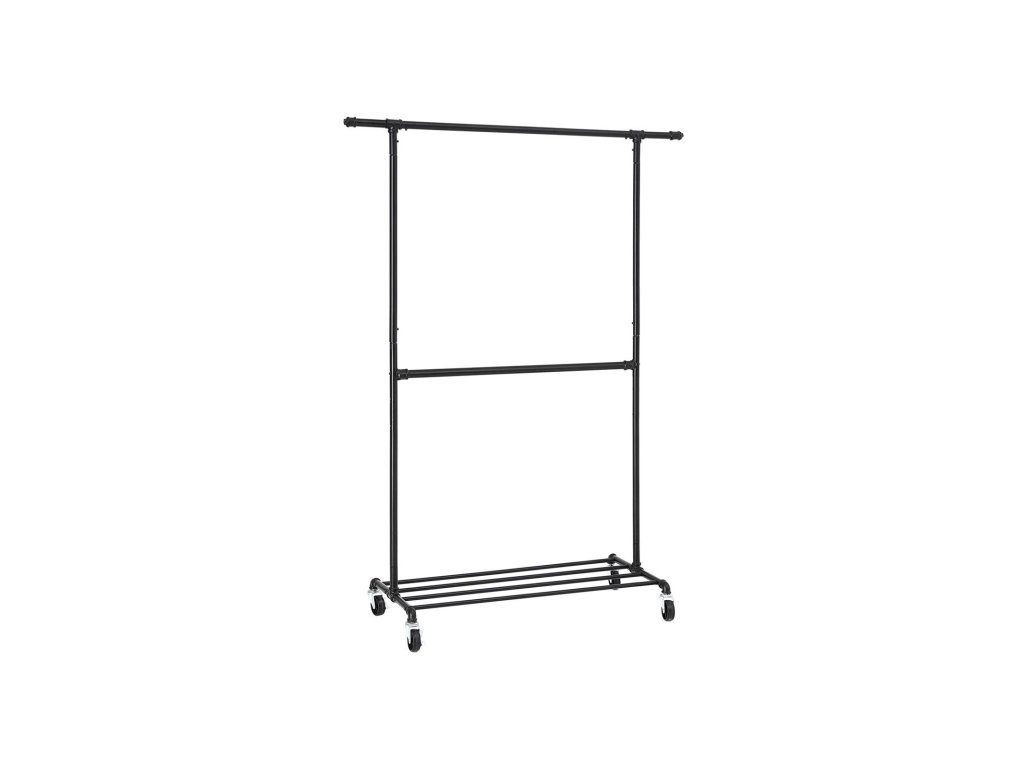 Průmyslový věšák na oděvy na kolečkách, maximální zatížení 110 kg, dvojitá tyč na zavěšení oděvů, těžký komerční stojan, černý.