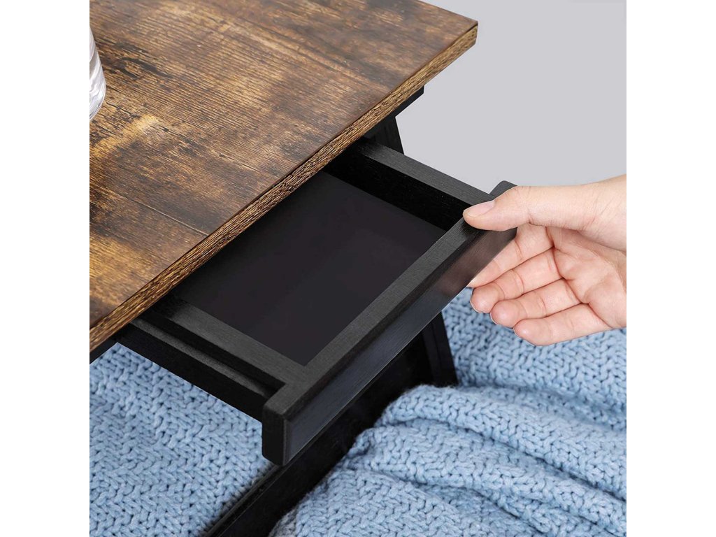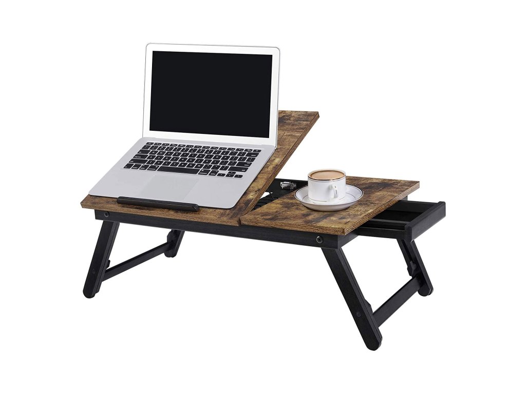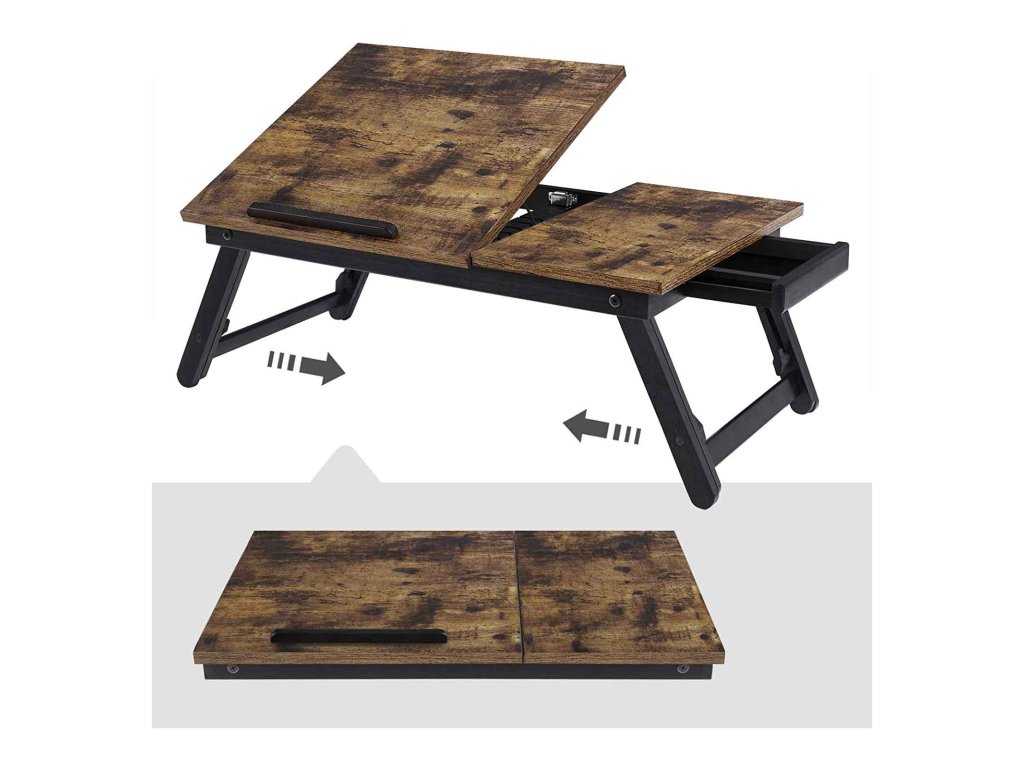 Psací stůl na notebook k posteli nebo pohovce s nastavitelným sklápěním horní desky, podnos na snídani s výškově nastavitelnými skládacími nohami, vhodný pro obrazovky do velikosti 15,6 palce, podlahový stůl, rustikální hnědá.