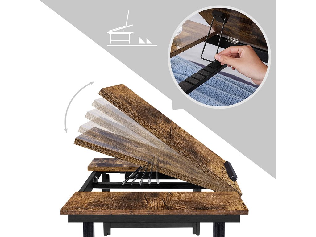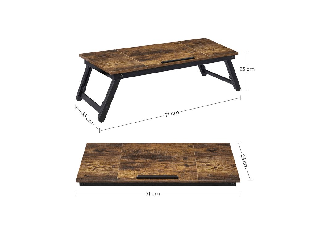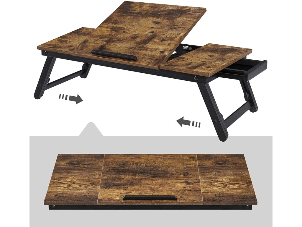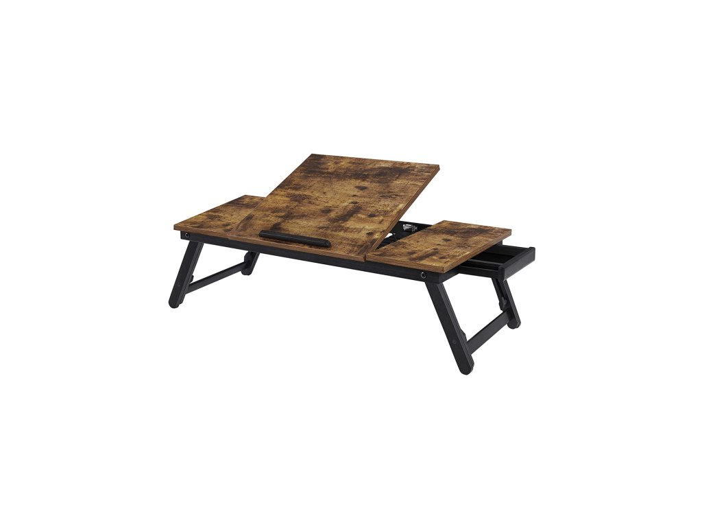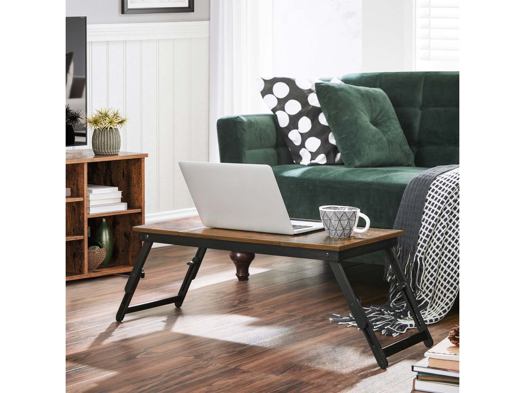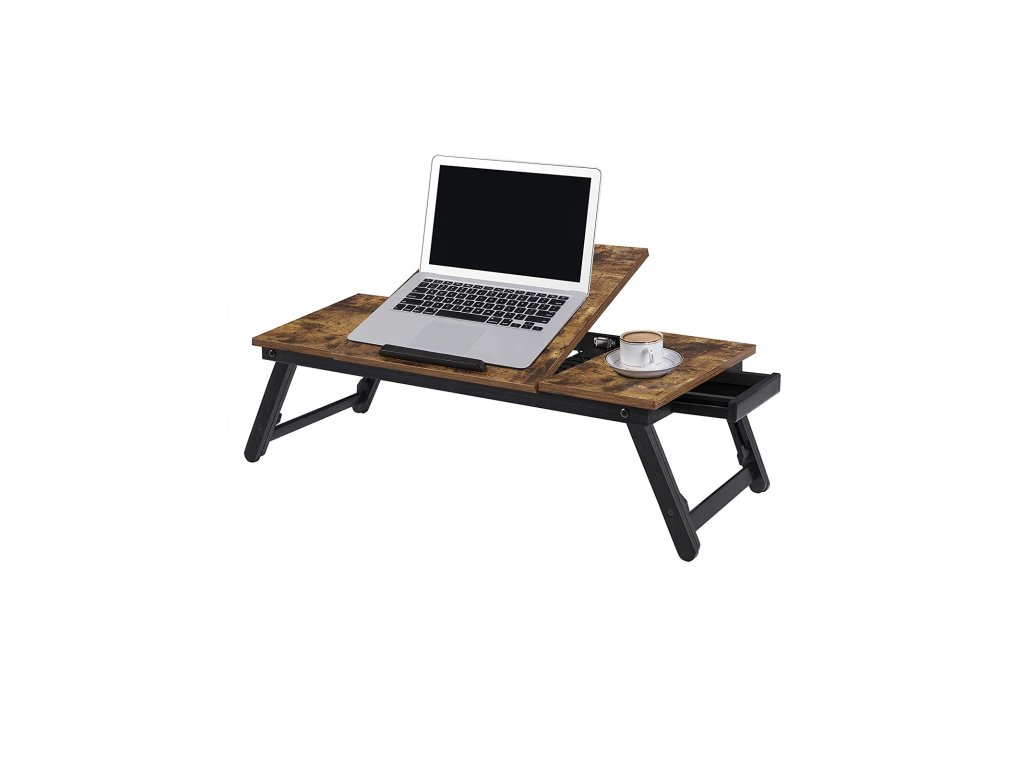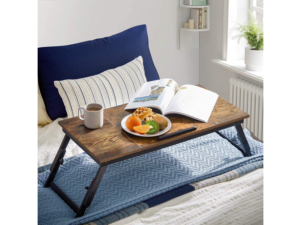 Psací stůl na notebook k posteli nebo pohovce s nastavitelným sklápěním horní desky až do 14,3 palce, pravo-levý servírovací podnos na snídani s výškově nastavitelnými skládacími nohami, zásuvka, rustikální tmavě hnědá.