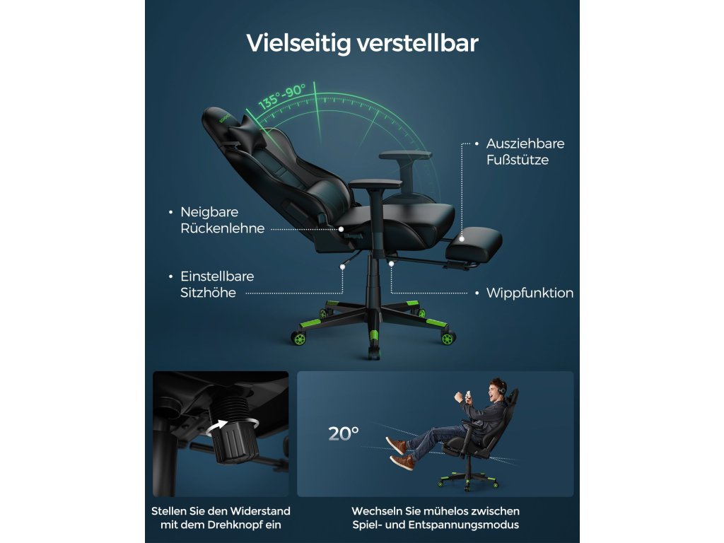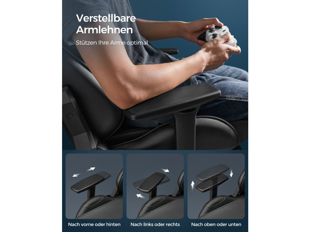 Všestranně nastavitelné Opěradlo je nastavitelné v rozmezí 90° až 135°, výška sedáku je nastavitelná v rozmezí 50 až 60 cm. Můžete také odejmout podnožku a aktivovat funkci houpání v úhlu 20°, abyste mohli pohodlně relaxovat.Pohodlné područky Područky lze nastavit nahoru nebo dolů, vlevo nebo vpravo, dopředu nebo dozadu, což poskytuje pohodlnou oporu pro ruce. Díky výškově nastavitelné konstrukci lze židli zasunout pod stůl a ušetřit tak místo.Stabilní a spolehlivá Ocelová konstrukce, plynový výtah s certifikátem SGS a robustní základna - tato herní židle unese až 150 kg a poskytuje velkou stabilitu a bezpečnost při práci nebo hraní.Stylové a dobře polstrované Tato kancelářská židle inspirovaná závodním sedadlem má opěradlo s bočními polštářky s vysokou hustotou a rozměrovou stabilitou. potah z PU s efektem uhlíkových vláken a jemným prošíváním - estetický a pohodlný.Snadná montáž Díky jasným a srozumitelným pokynům může tuto kancelářskou židli sestavit jedna osoba za méně než 30 minut, aniž by si musela příliš hrát.| Kategorie: | Herní křesla |