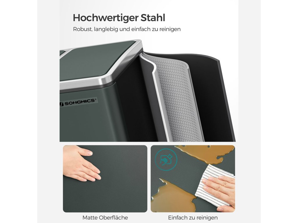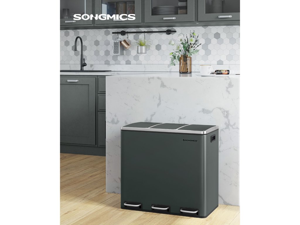 Výhoda pro vaši kuchyni: Tento elegantní pedálový odpadkový koš se 3 přihrádkami, které umožňují snadné třídění recyklovatelných odpadů, vyniká příjemným estetickým vzhledem a praktickou funkčností; a to vše lze provést, aniž byste se dotkli koše!;Má to i měkkou stránku: Přestože má koš na odpadky pevný ocelový plášť, je šetrný - díky tlumicímu mechanismu se víka zavírají jemně, pomalu a tiše. udržuje bakterie a pachy na uzdě bez hlasitého řinčení.Kbelík v koši: Ups! Protrhl se sáček s vložkou a vytvořil mastnou louži? Nebojte se, vyjímatelné kbelíky v každém koši jsou vybaveny rukojetí, která usnadňuje vyprazdňování a čištění.Sedí u zdi: Obdélníkový odpadkový koš umístěte naplocho ke stěně, abyste ušetřili místo; víko při otevření nenarazí na stěnu.Co získáte: Antracitově šedý odpadkový koš s 3 přihrádkami o objemu 18 l, praktickými pedály a vyjímatelnými vnitřními kbelíky pro snadné odstraňování odpadu a bezproblémovou recyklaci.| Kategorie: | Odpadkové koše |