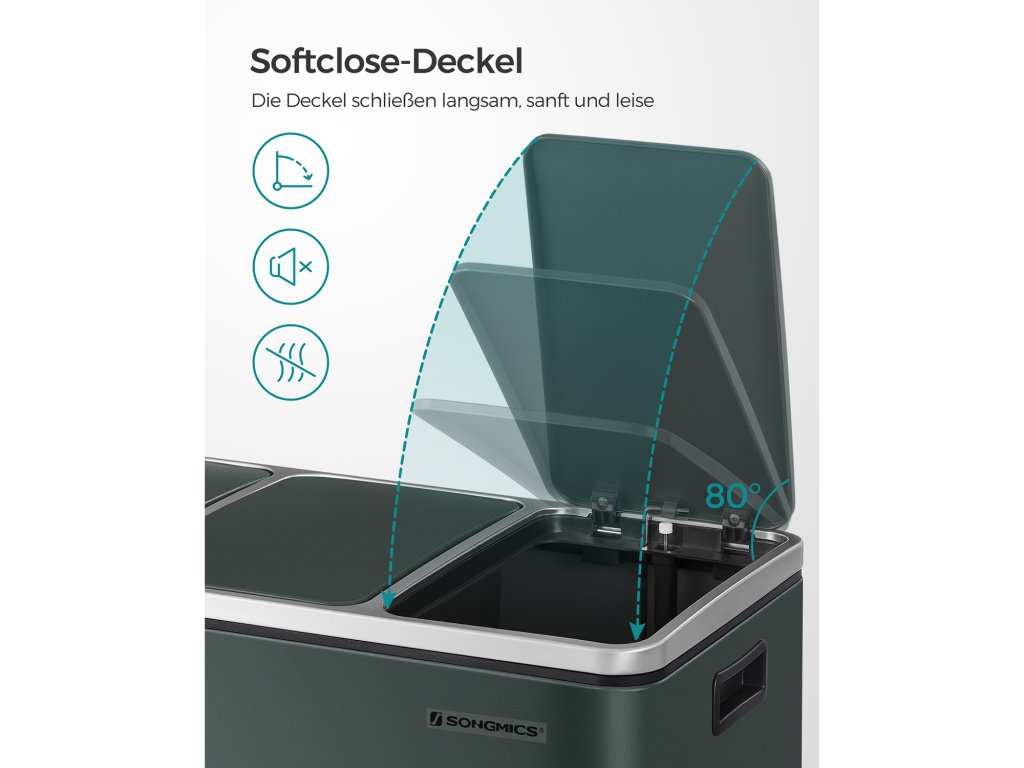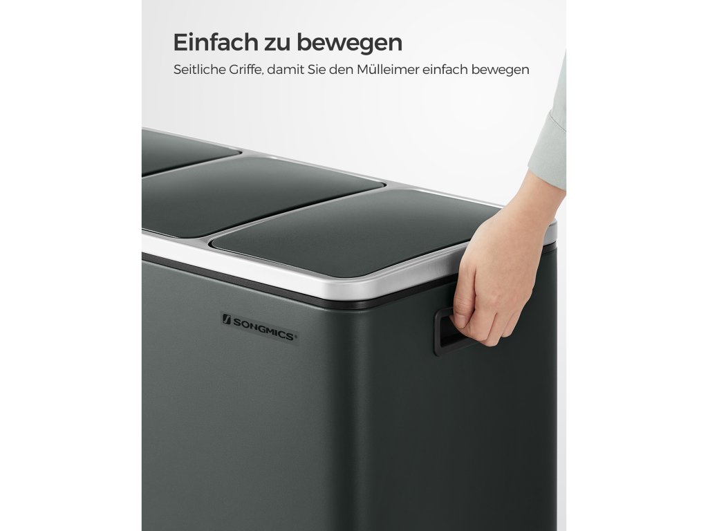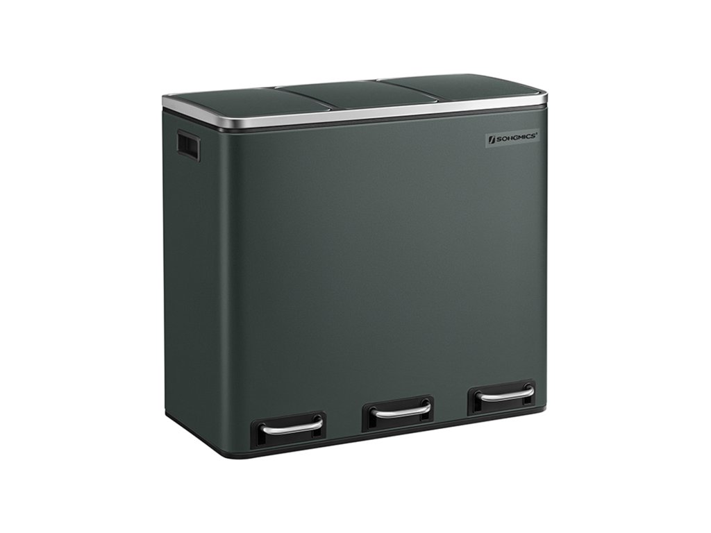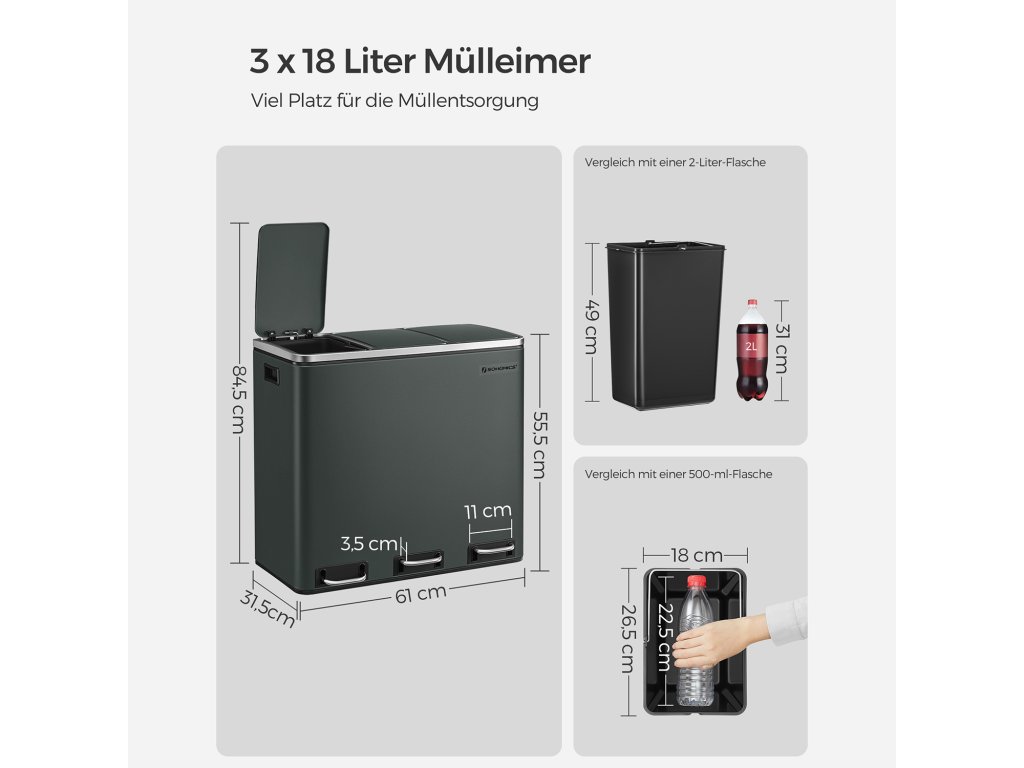 Recyklační koš, 3 x 18 l, trojitý kuchyňský koš, 3 přihrádky, pedálový koš s víkem s měkkým zavíráním, plastové vnitřní kbelíky a madla, antracitově šedá.