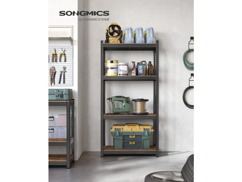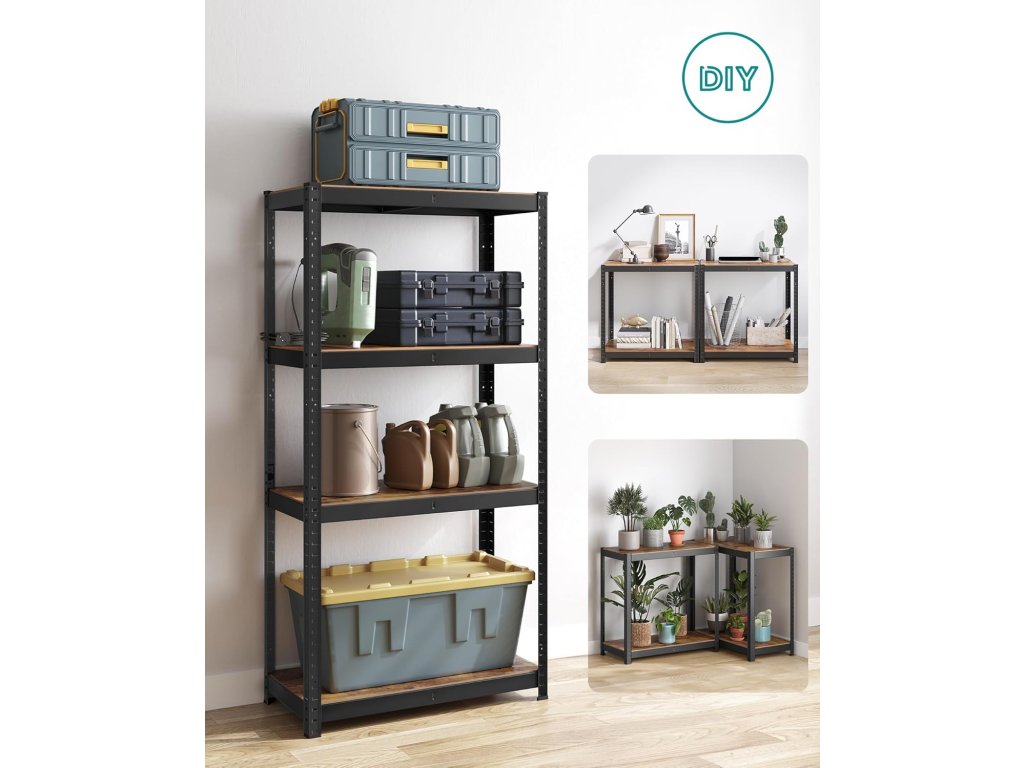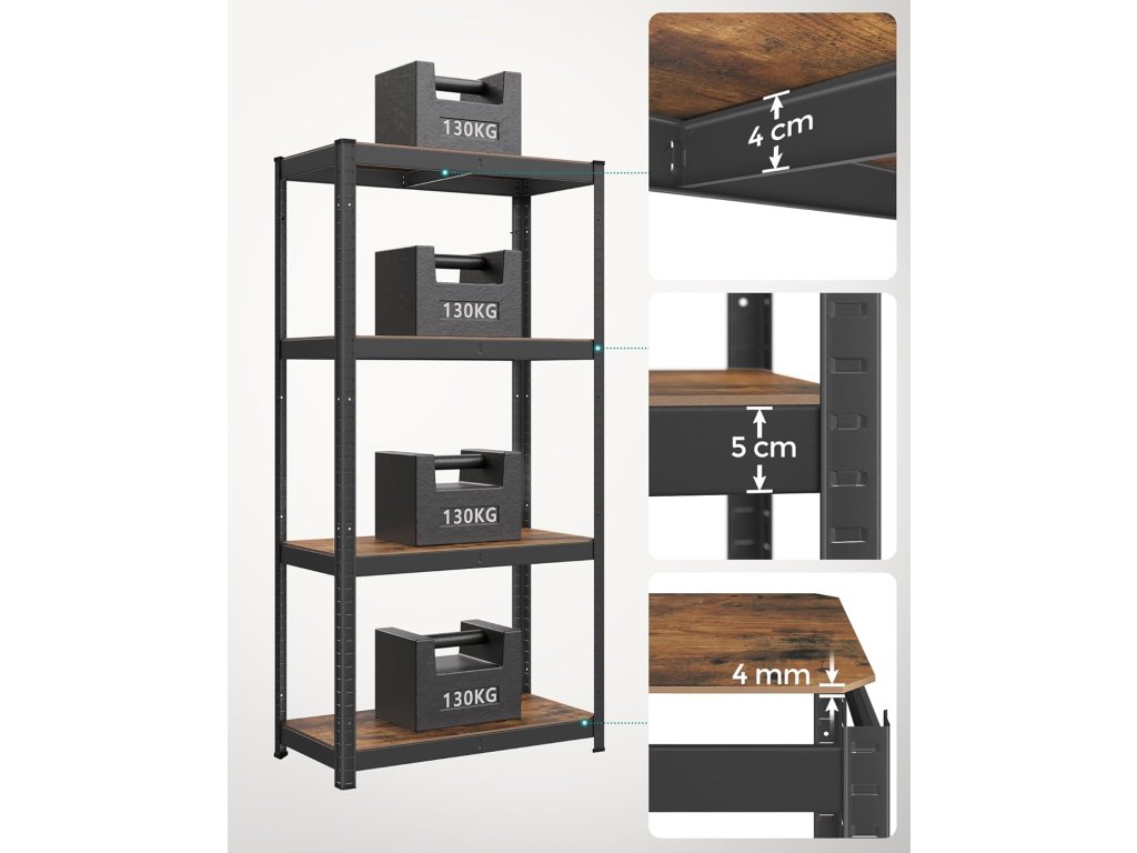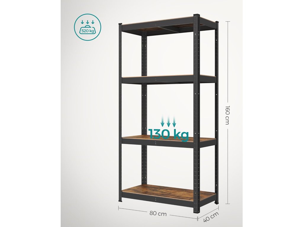 Regál, 40 x 80 x 160 cm, nosnost 520 kg (130 kg na polici), průmyslový, nastavitelné úložné police, do obývacího pokoje, kuchyně, garáže, rustikální hnědá a černá.