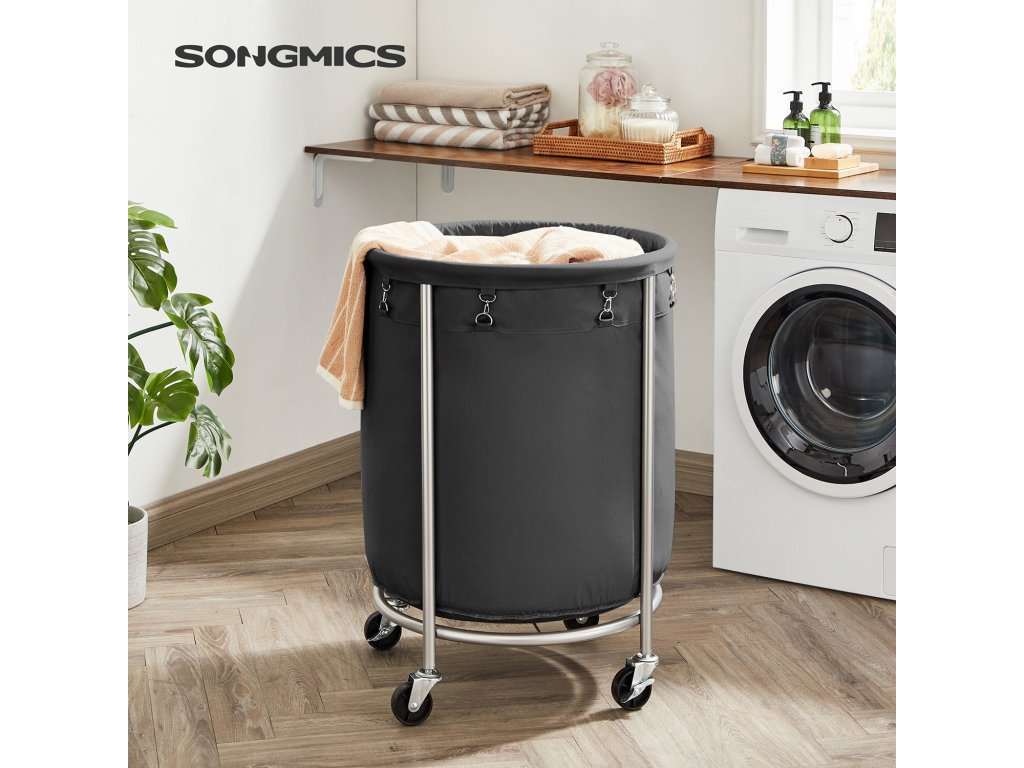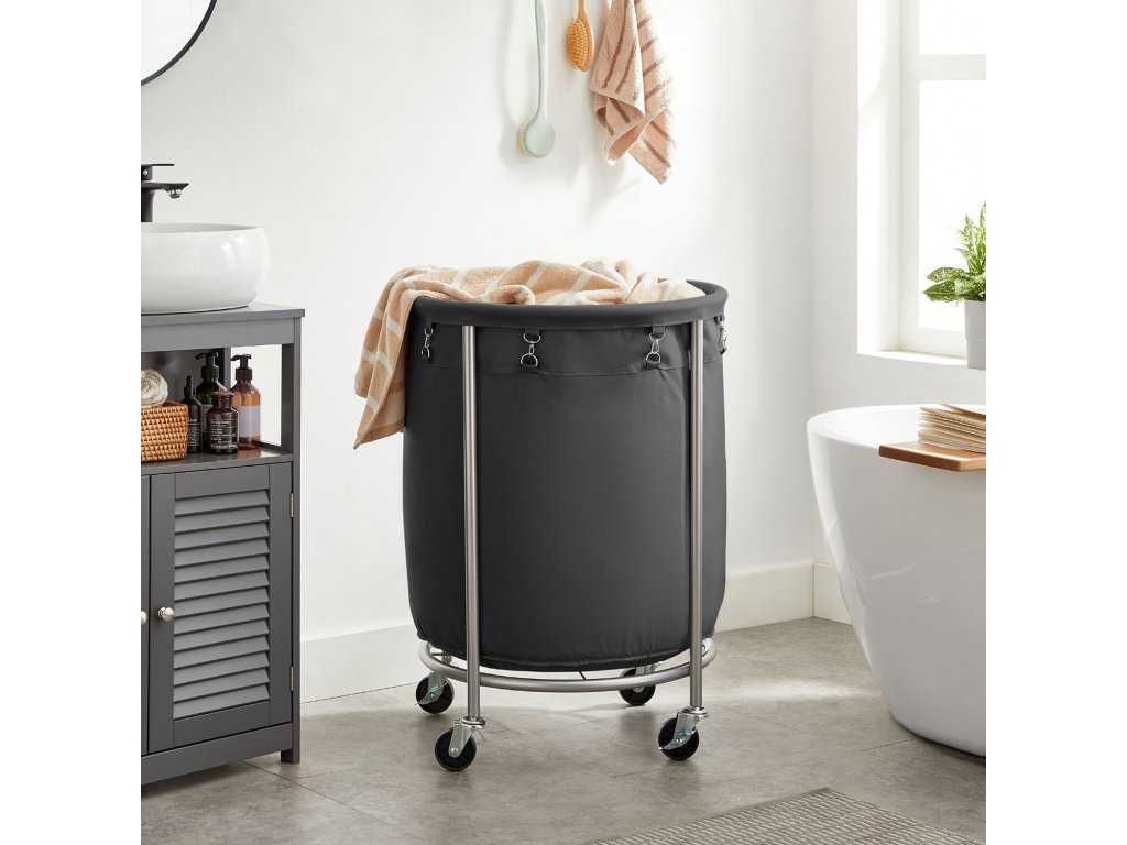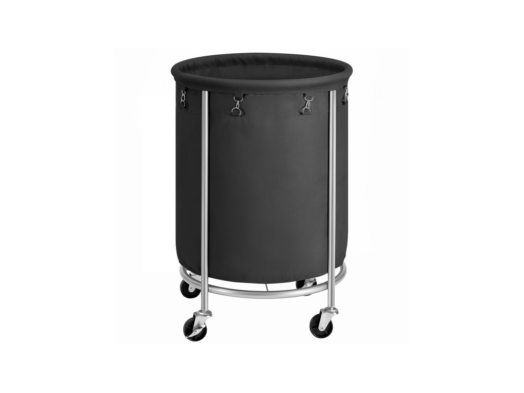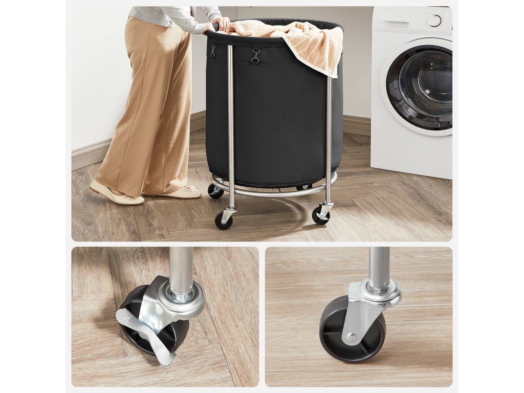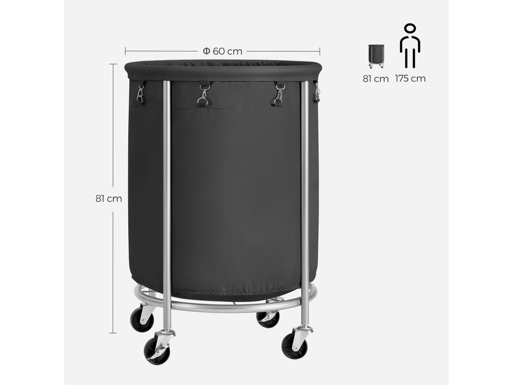 Třídič prádla, koš na prádlo na kolečkách, 170litrový kulatý koš na prádlo s ocelovým rámem, vyjímatelným pytlem na prádlo a 4 kolečky (2 s brzdami), černá/stříbrná barva.