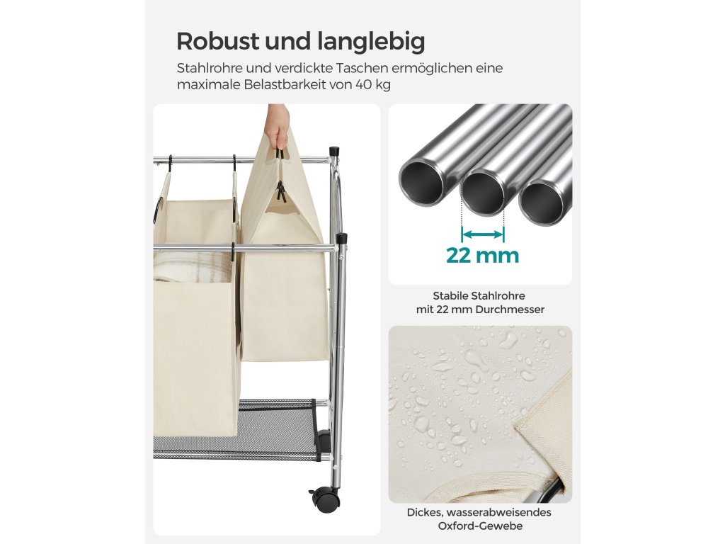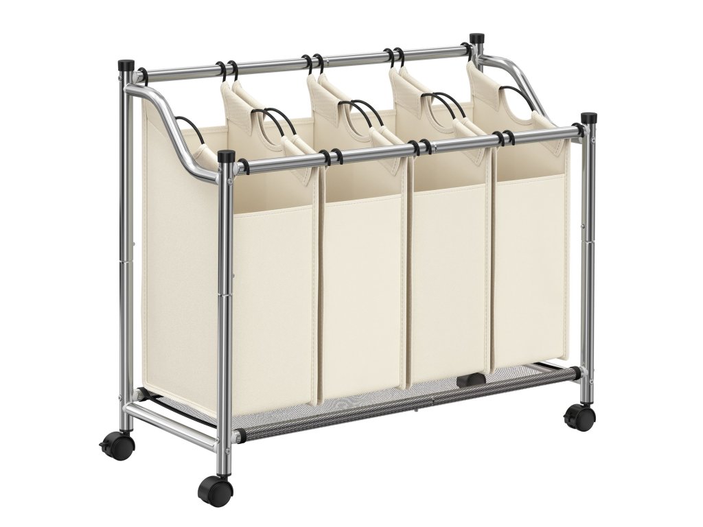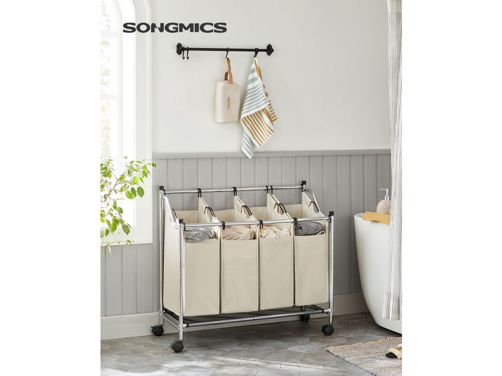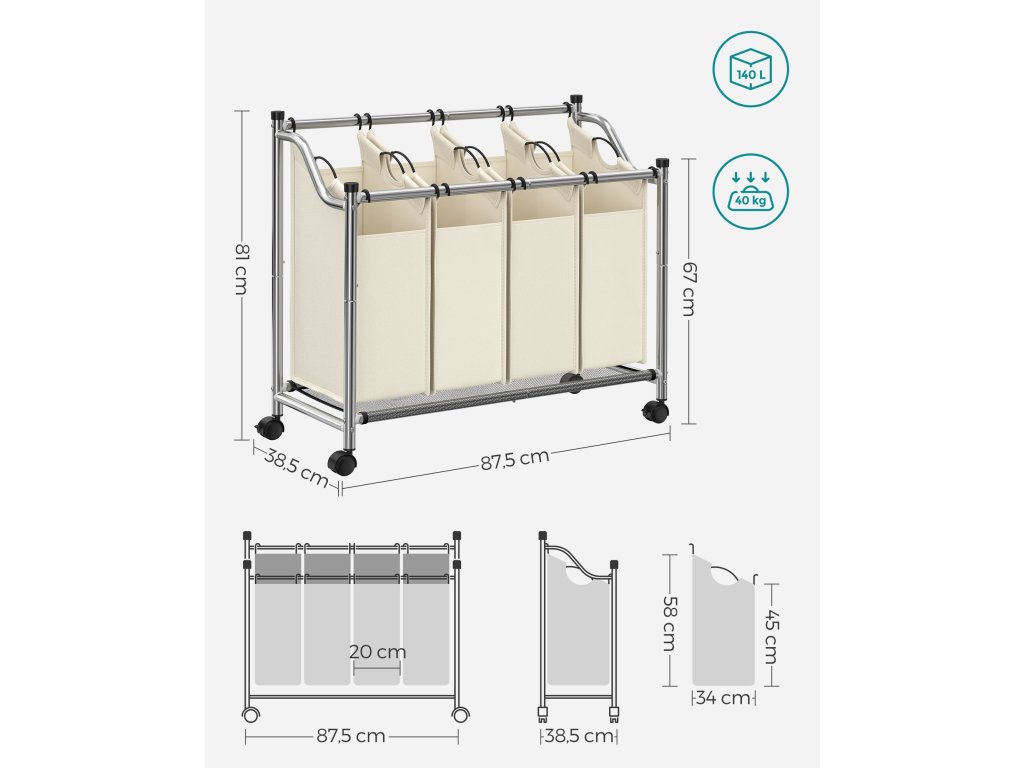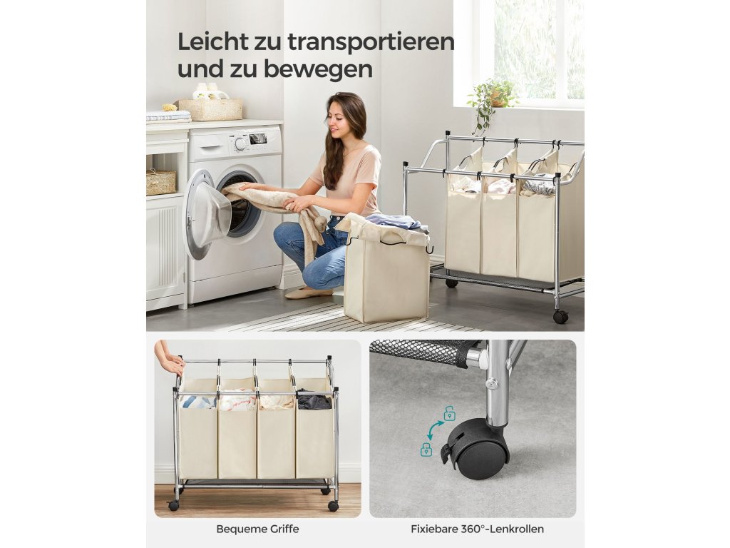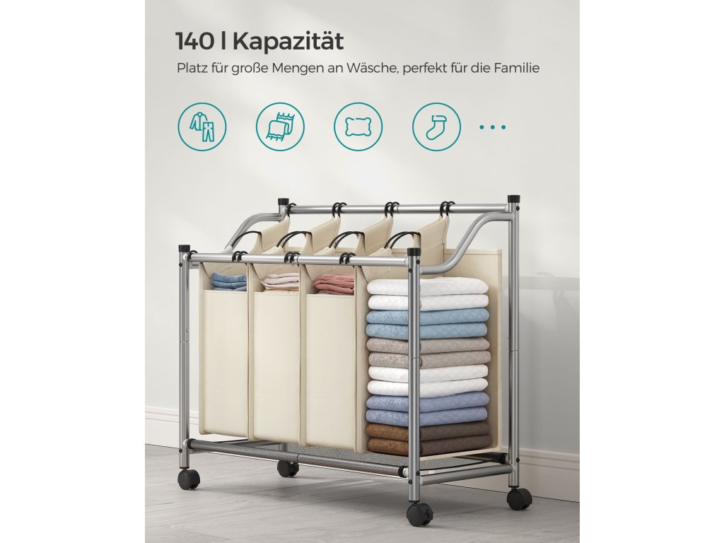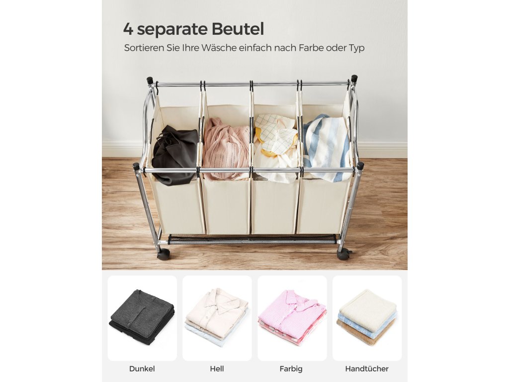 Koš na prádlo se 4 vyjímatelnými sáčky, koš na prádlo, vozík na prádlo, do prádelny, ložnice, koupelny, 4 x 35 l, béžový.