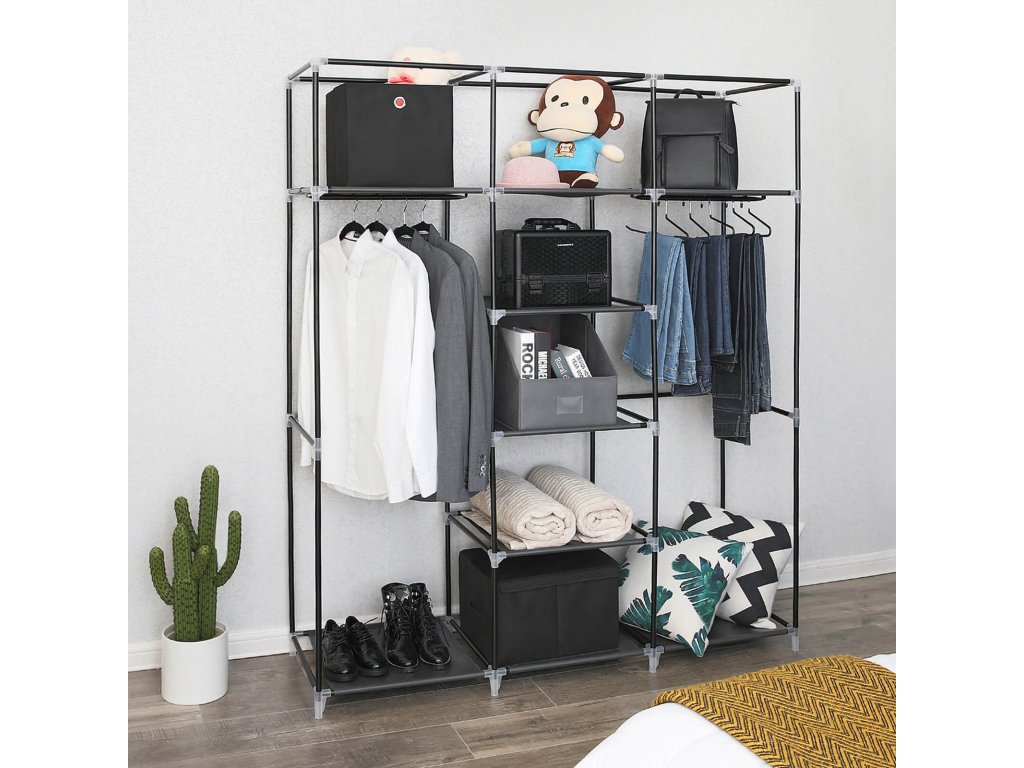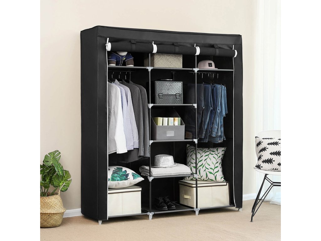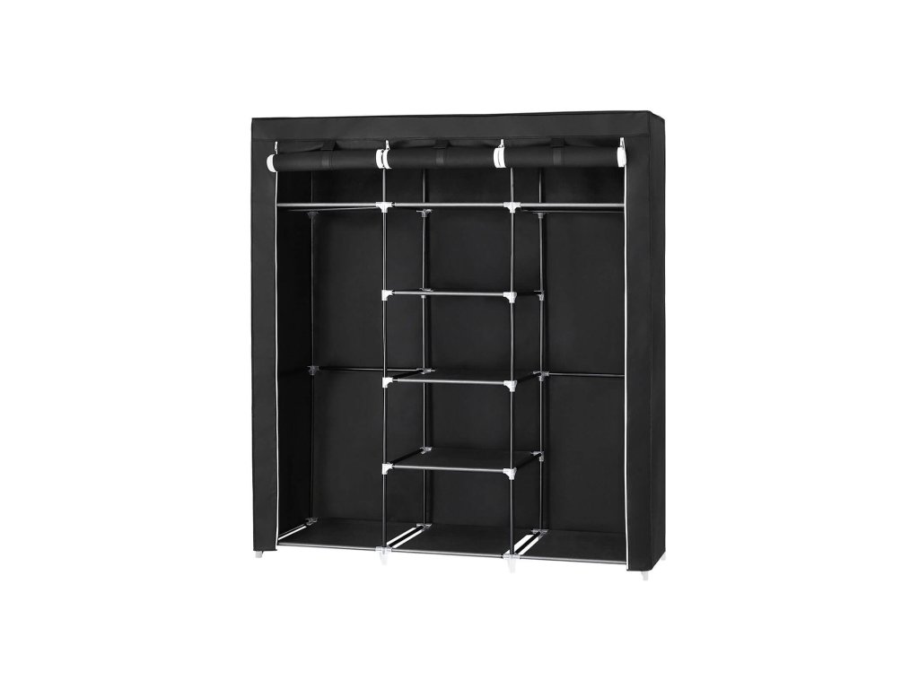 Skládací šatní skříň, látková skříň, skládací věšák se 2 tyčemi na oděvy, 175 x 150 x 45 cm, černá, plátno.