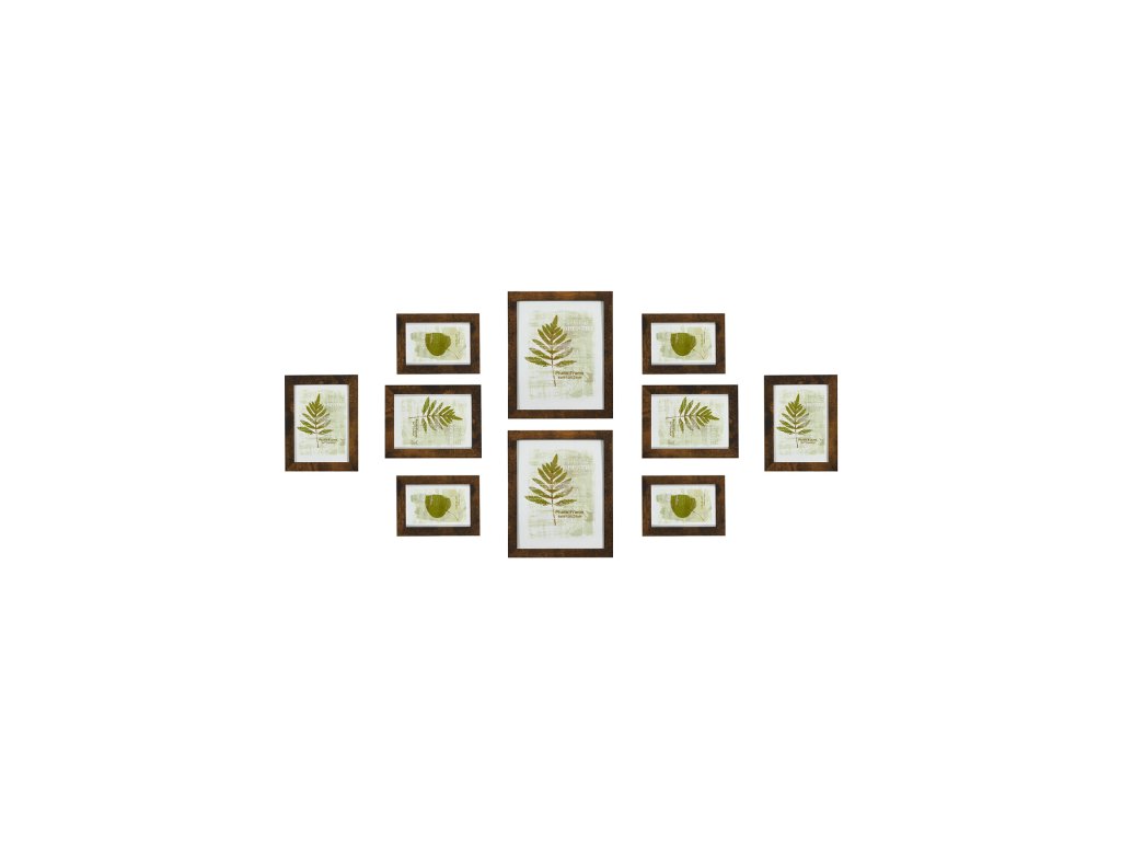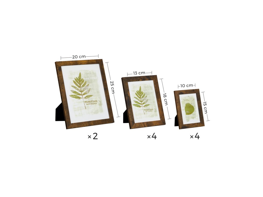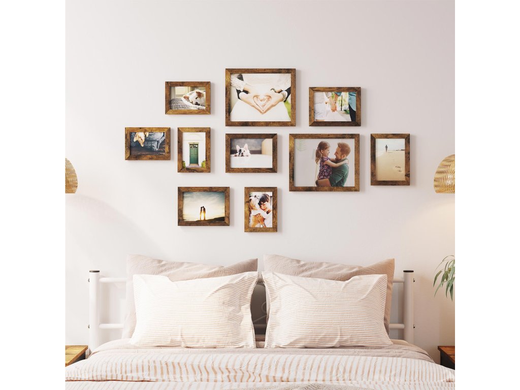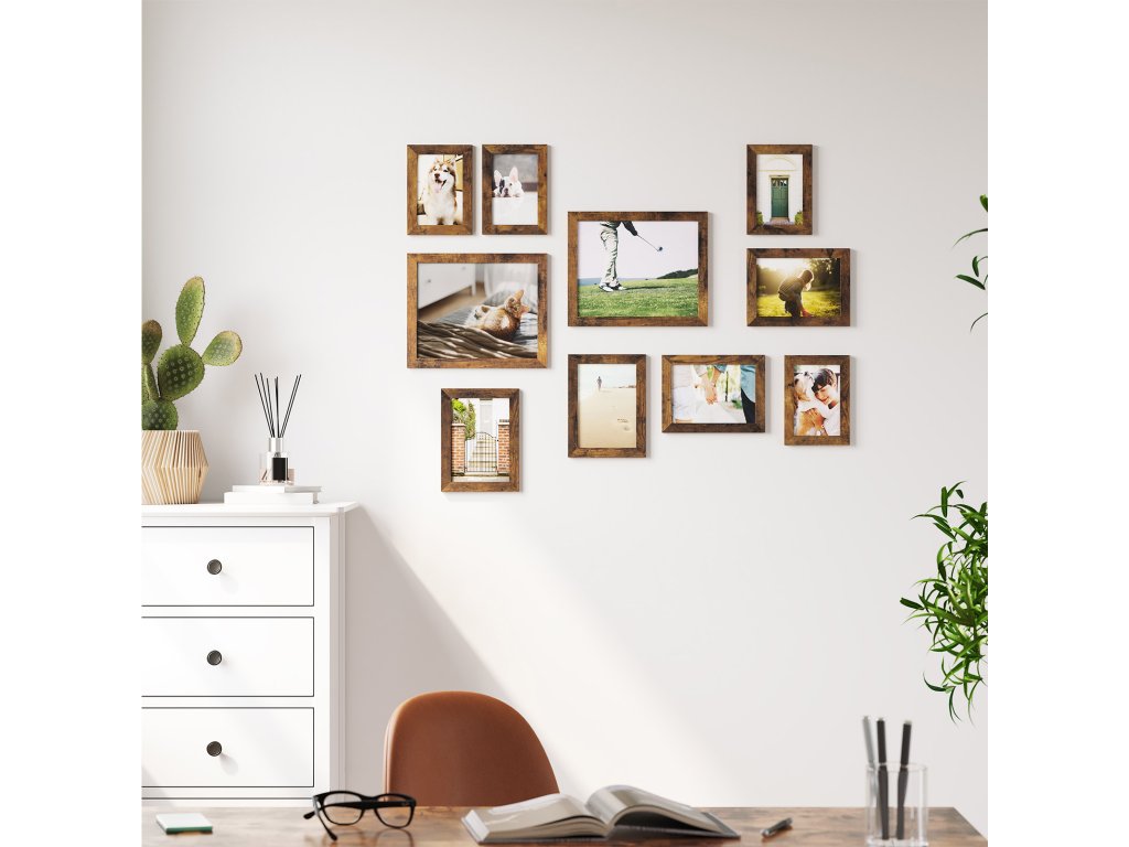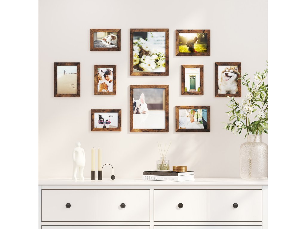 Sada 10 obrazových rámů, dva 20 x 25 cm, čtyři 13 x 18 cm, čtyři 10 x 15 cm, plastová přední strana, MDF, rustikální hnědá.