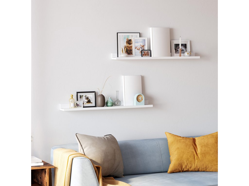 Sada 2 plovoucích polic, nástěnné police s lesklým povrchem, 80 x 10 cm, na rámy s obrazy a knihami, obývací pokoj, předsíň, ložnice, koupelna, kuchyně, kancelář, bílá.