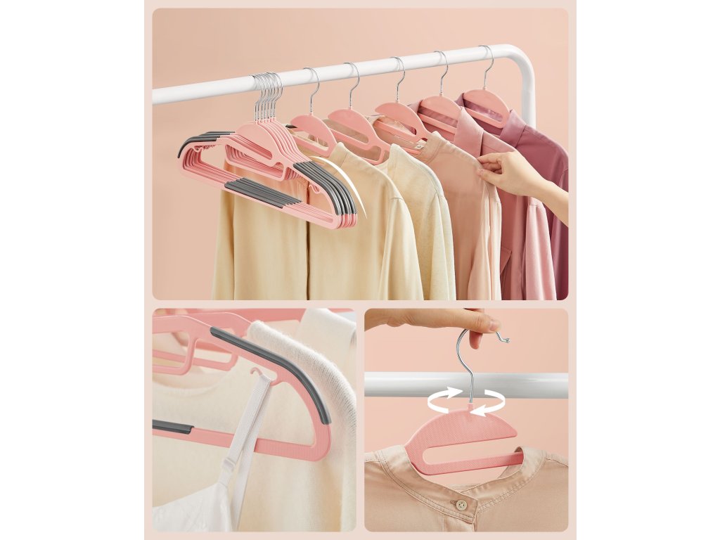 Sada 20 plastových věšáků, věšáky na kabáty s otvorem ve tvaru U, protiskluzové, šetřící místo, tloušťka 0,5 cm, délka 41,5 cm, háček otočný o 360°, růžová a tmavě šedá.