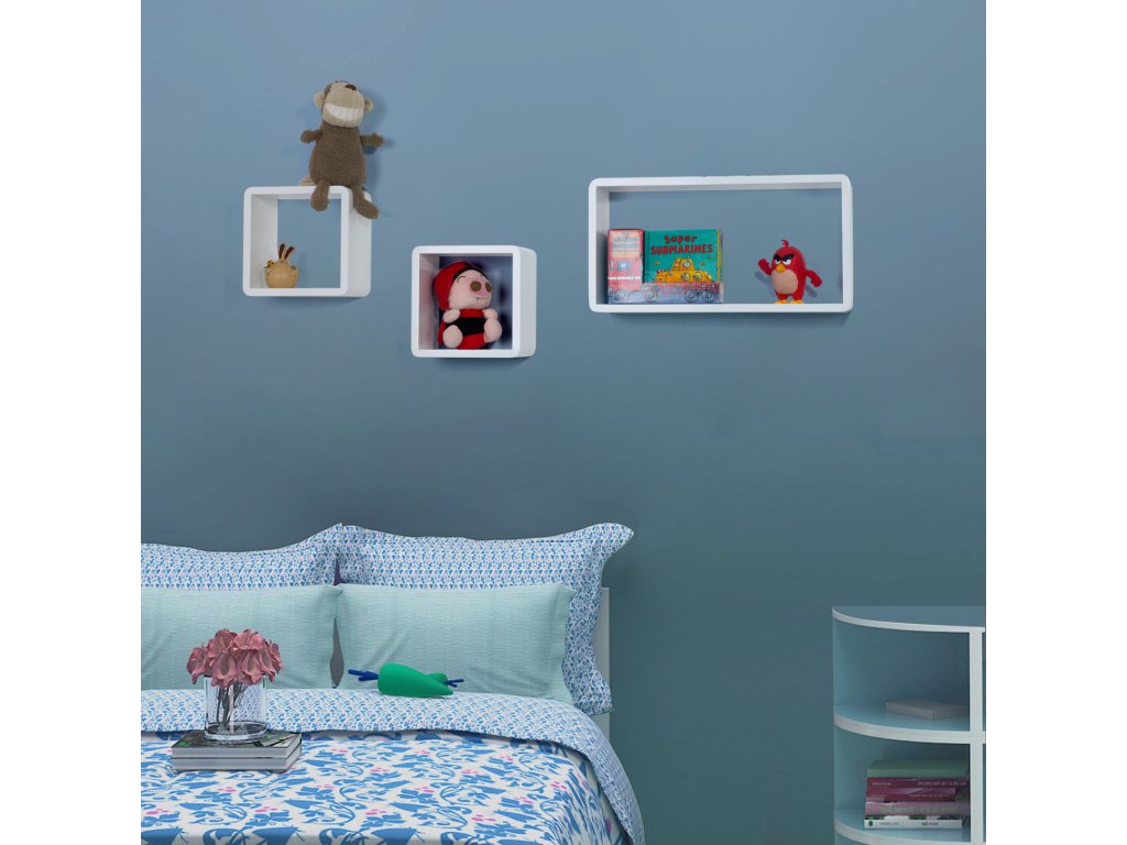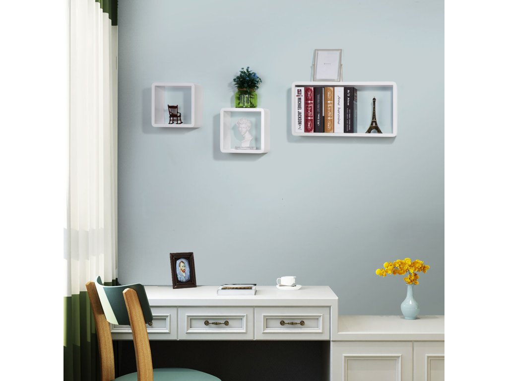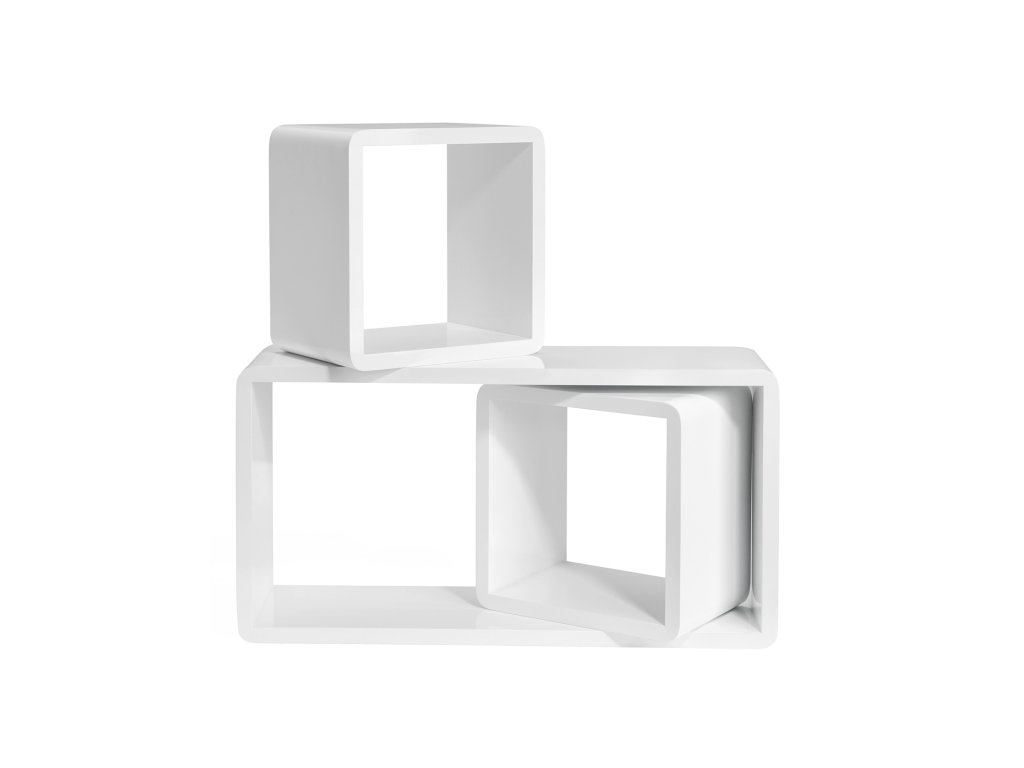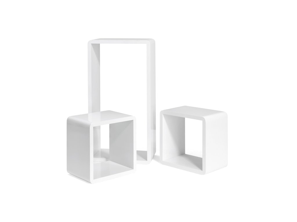 Sada 3 plovoucích polic, nástěnné police s lesklým povrchem, dřevěné úložné kostky, hloubka 15 cm, 50/22/22 cm, bílá.