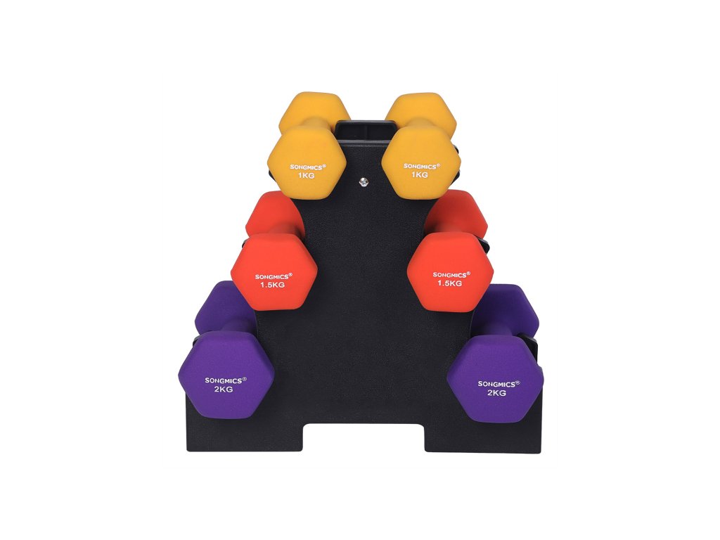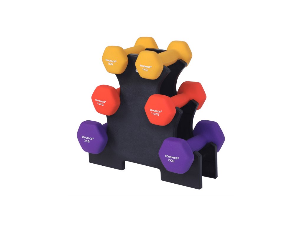 SONGMICS Sada šestihranných činek se stojanem, 2 x 1 kg, 2 x 1,5 kg, 2 x 2 kg, ruční činky s neoprenovým matným povrchem, pro domácí cvičení, žlutá, oranžová a fialová SYL69BK