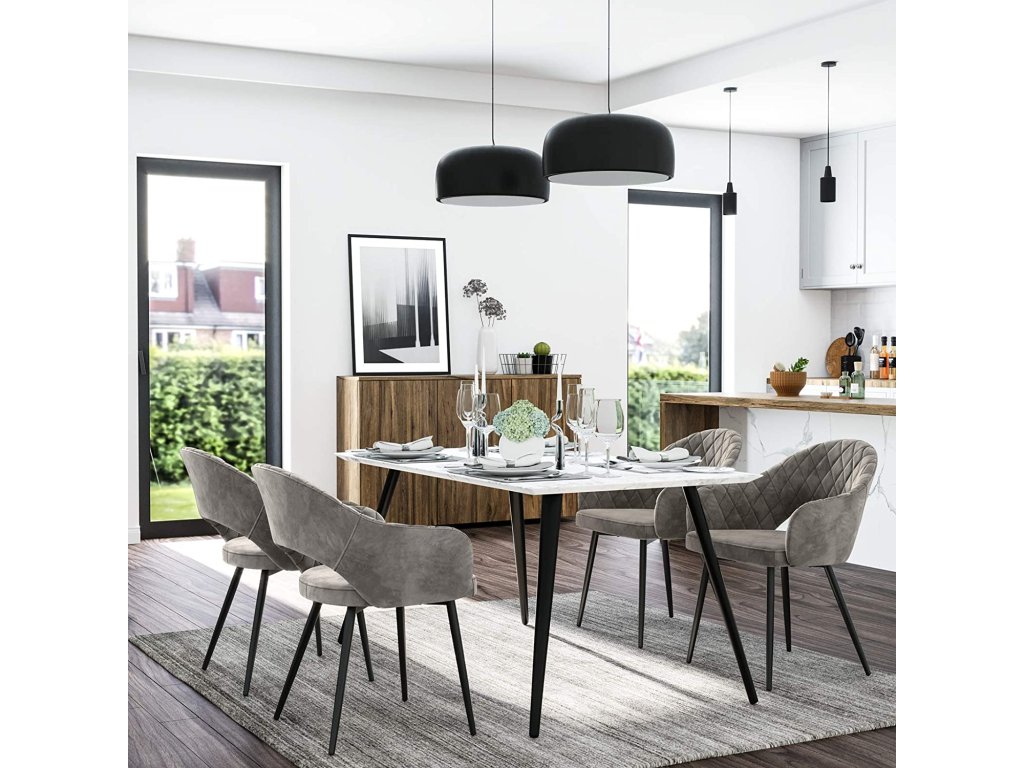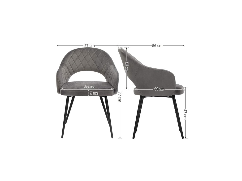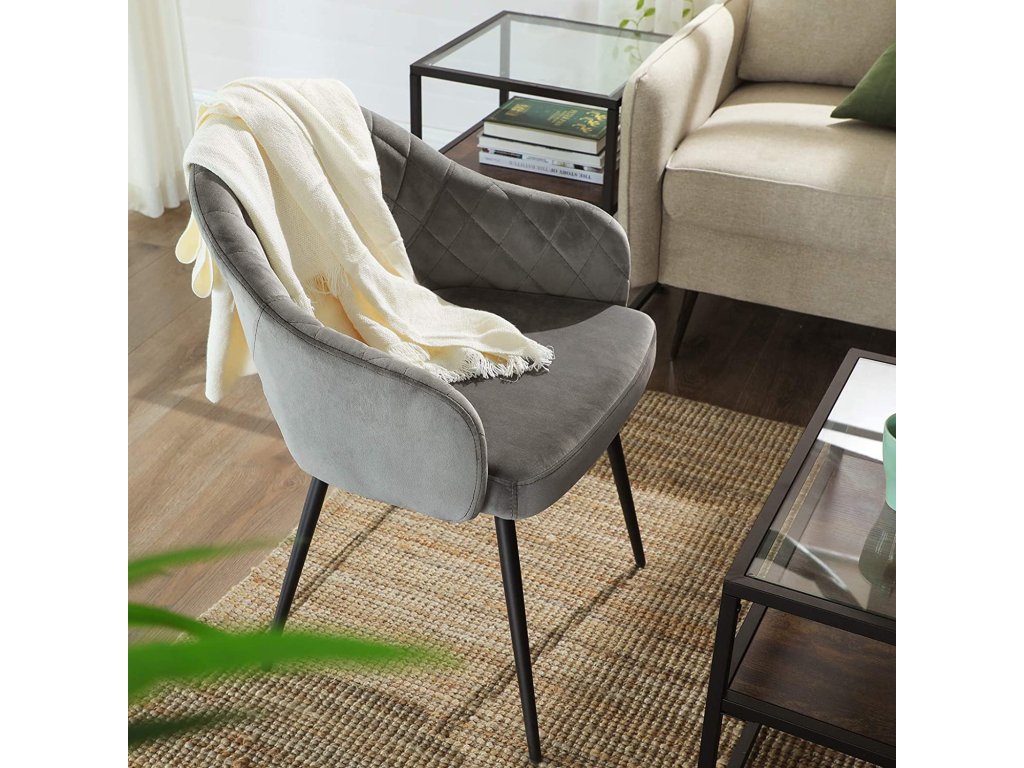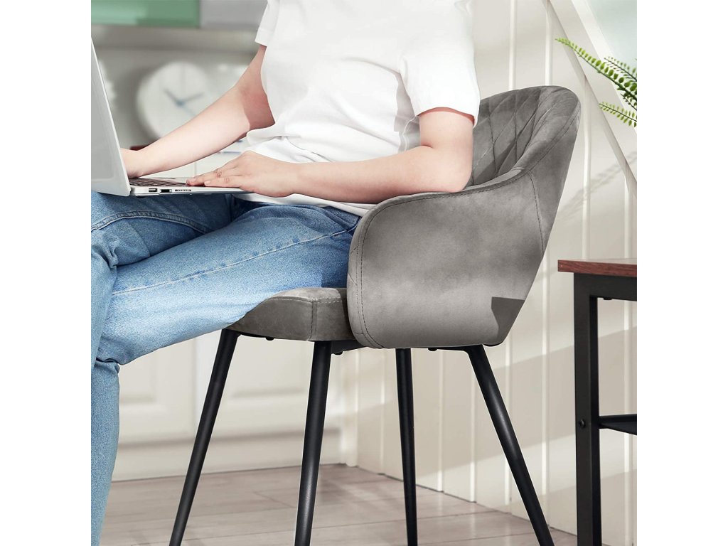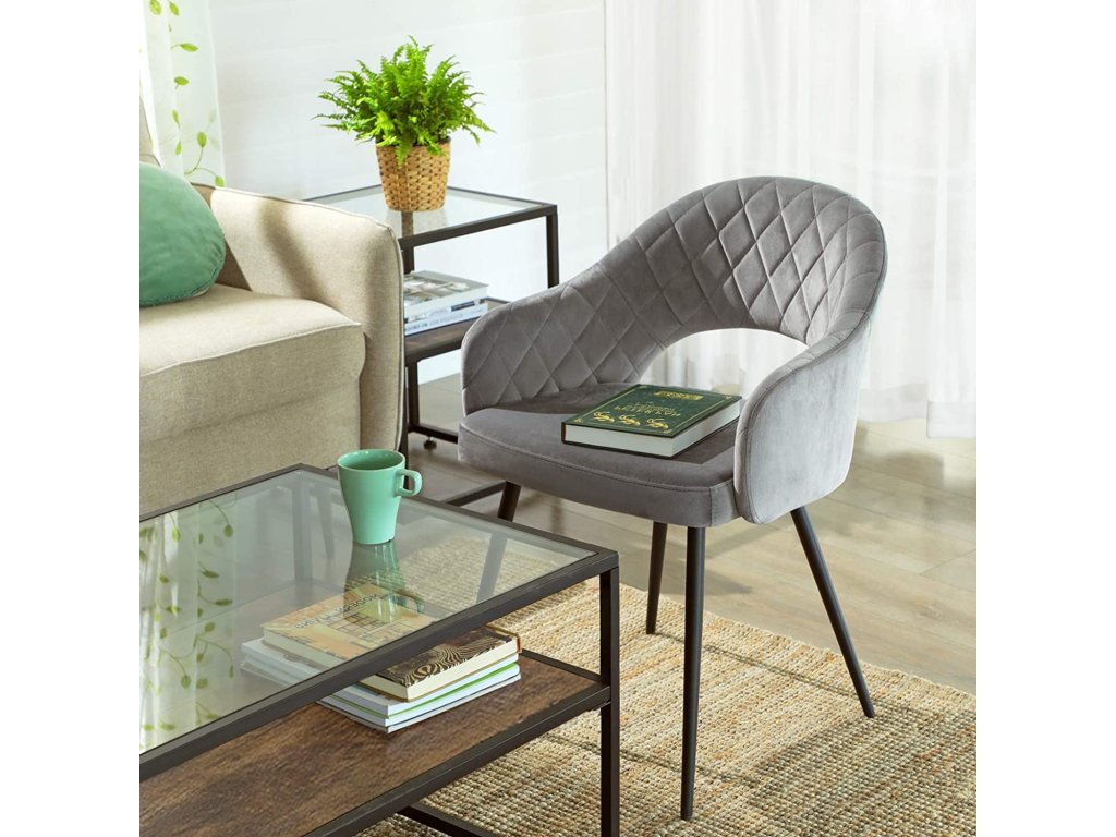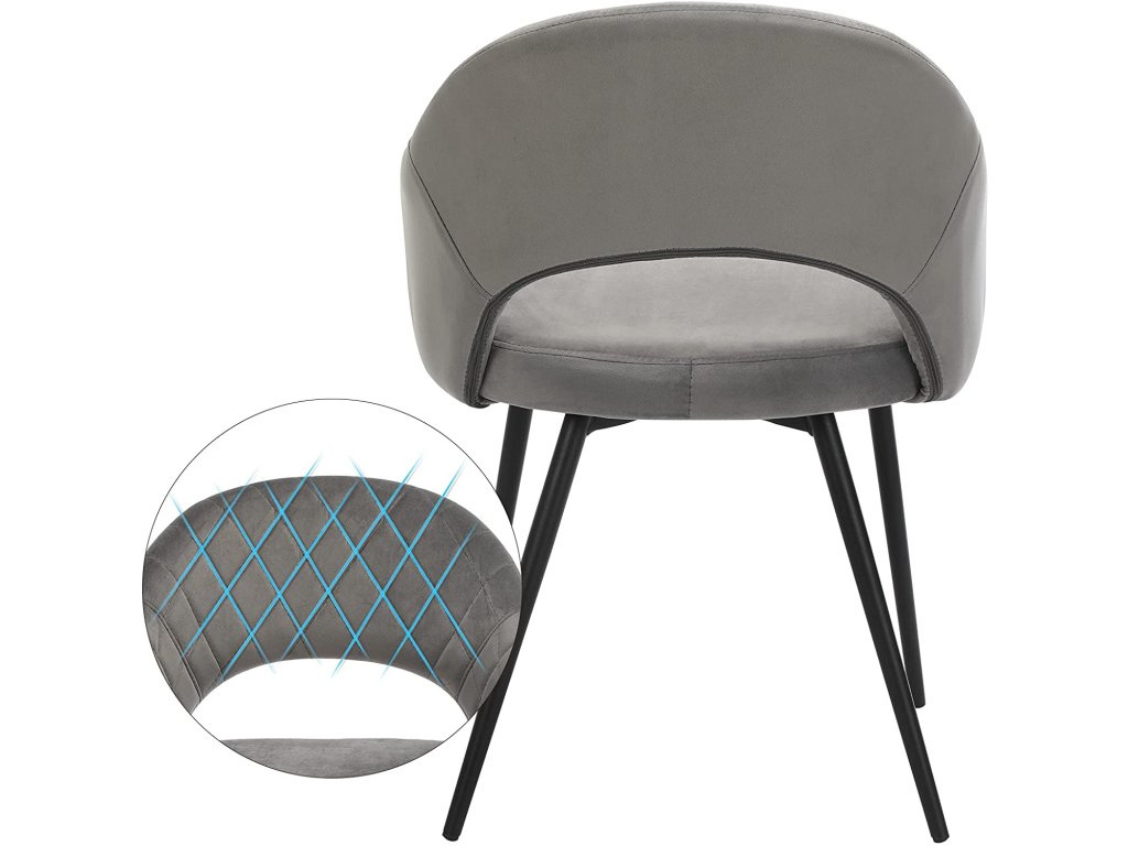 Nádherný šik: toto moderní šedá prošívané sametové křeslo s polstrováním dodá vašemu domovu šmrnc a eleganci. Vytvořte uprostřed svých čtyř stěn atmosféru salonu, která by byla hodna pětihvězdičkového hotelu.Jako zdůraznění: díky měkkému sametovému potahu, příjemnému polstrování, širokému sedáku a ergonomickému opěradlu nabízí toto křeslo přesně takové pohodlí, jaké si zasloužíte. Cítíte se objímáni jemností tohoto sedacího nábytku.Buďte klidnější: můžete se spolehnout na stabilitu této židle. Robustní kovové nohy umožňují, aby židle unesla až 110 kg. Sedačku můžete také bez obav posouvat po podlaze, protože má 4 podložky, které ji chrání před poškrábáním.Sestavení zápisu: K sestavení této jídelní židle potřebujete pouze 5 šroubů! Tato jídelní židle je sestavena dříve, než je vaše omeleta hotová. Máte tedy spoustu času na to, abyste si užili víkendový brunch.Působivé. Objednejte si více kusů této židle a vytvořte jídelnu, kde se vaši hosté budou cítit vítáni a rádi ochutnají vaše lahodné výtvory. Všichni se vás budou ptát, kde máte tyto šperky.