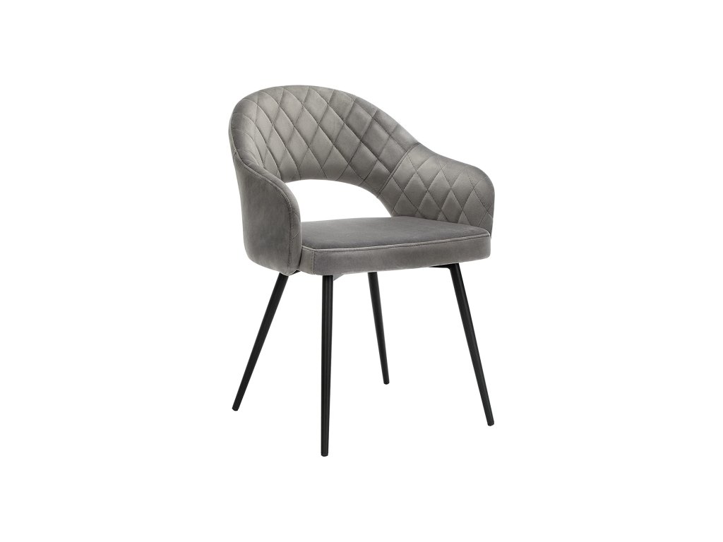 Sametová jídelní židle, moderní kuchyňská židle, polstrovaná sametová židle s područkami, kovové nohy, šedá.