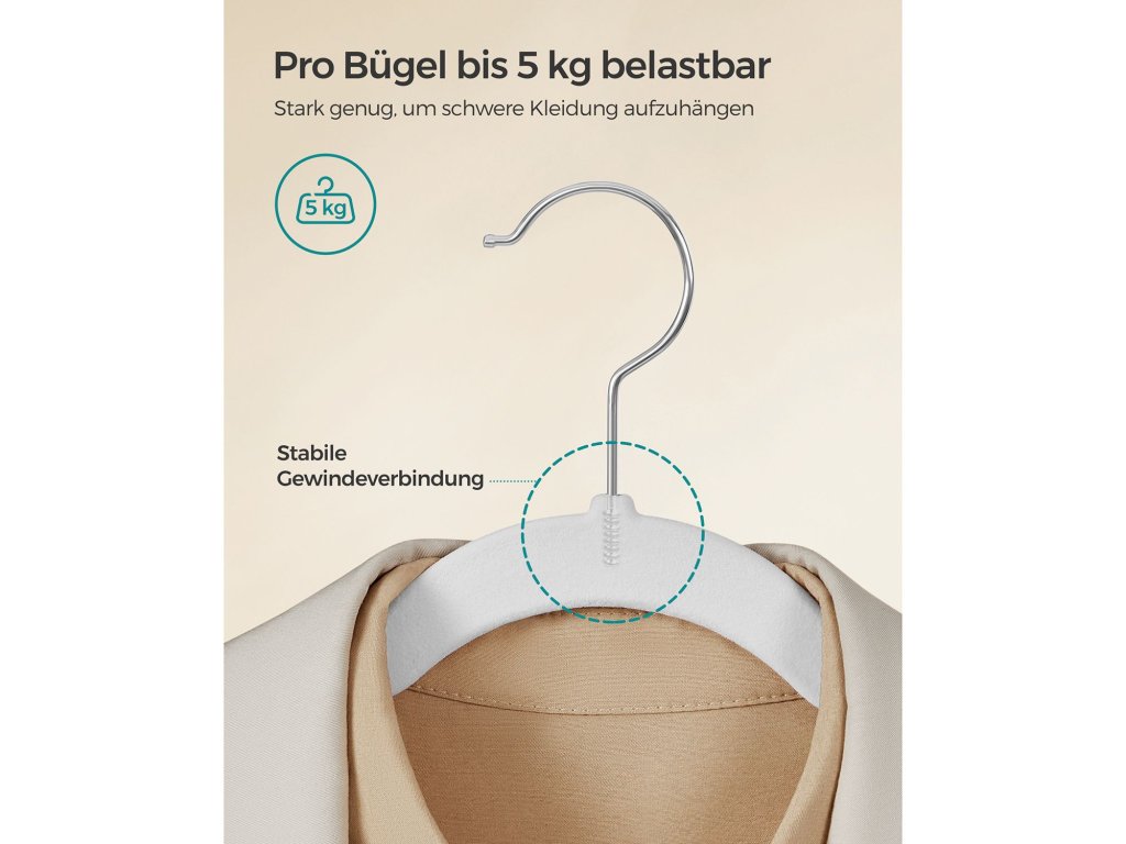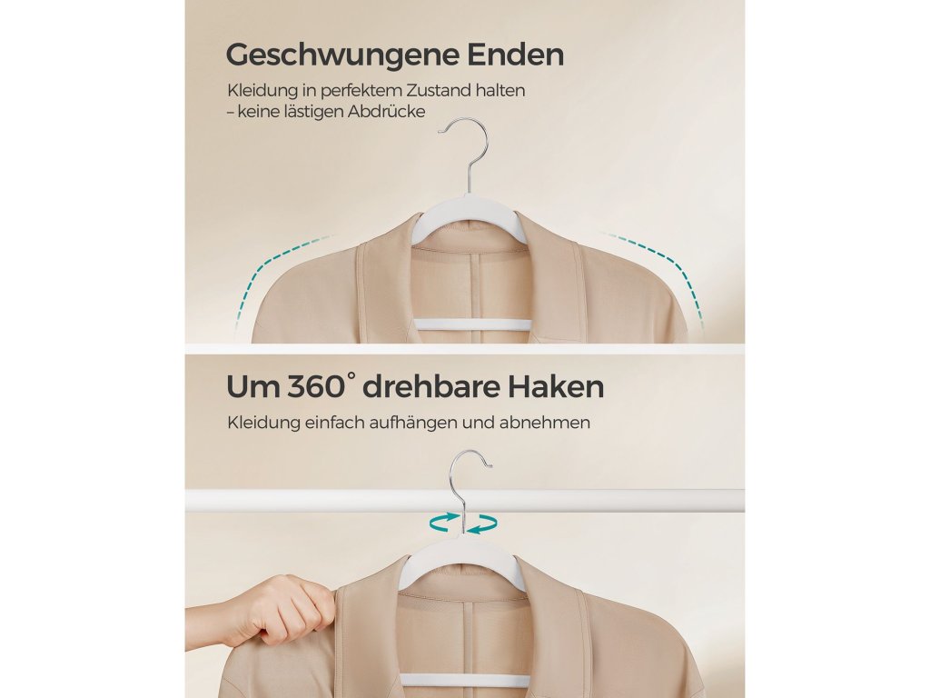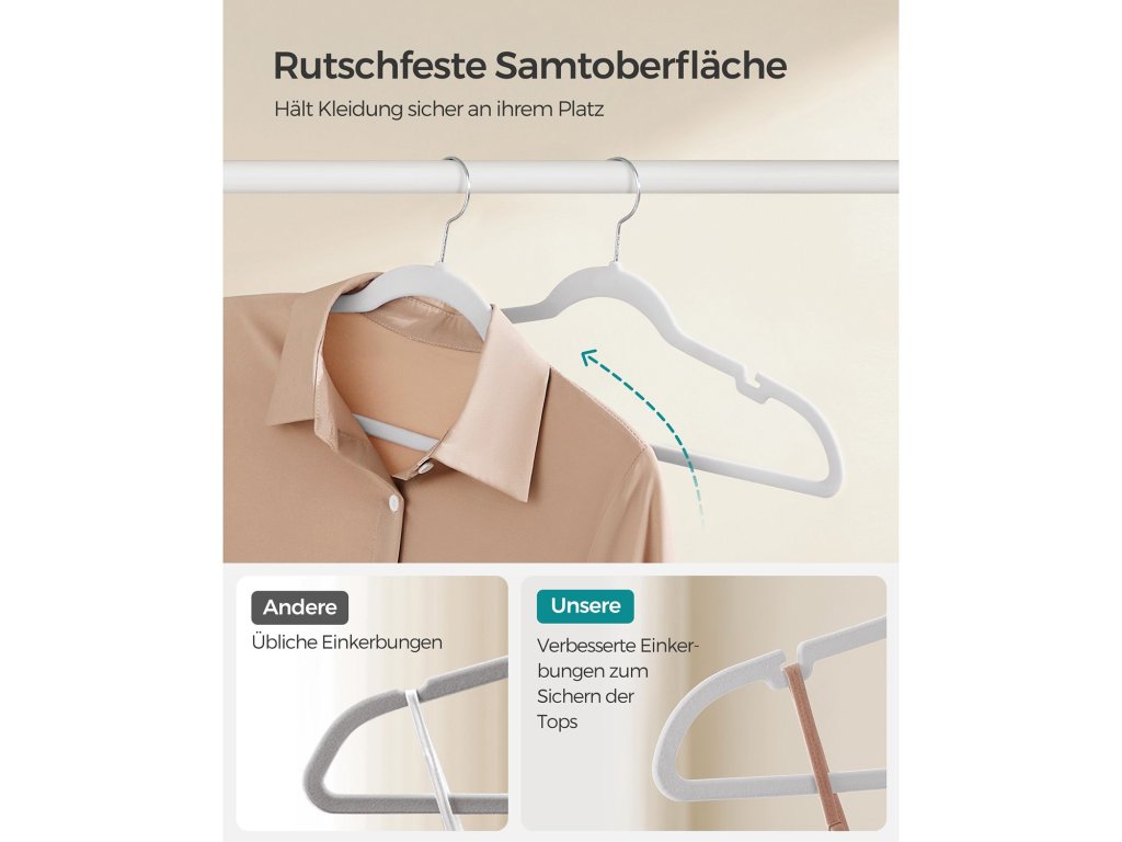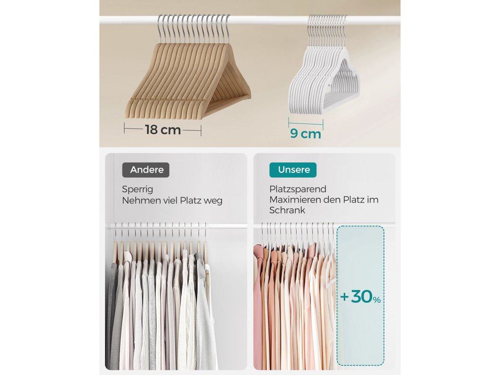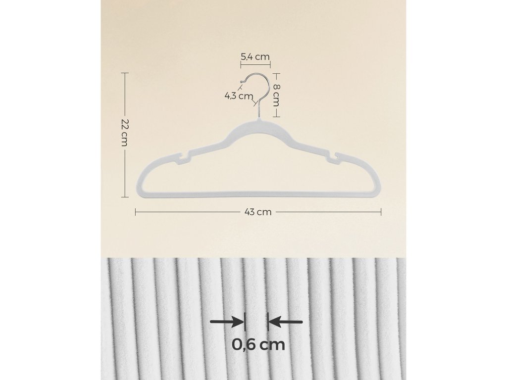 Chytré zářezy na ramínka Naše ramínka se zářezy na ramínka jsou navržena tak, aby udržela oblečení s tenkými ramínky, jako jsou kamaše a šaty na ramínka, a zabránila tak jejich sklouznutí a skončení ve změti na podlaze. [Protiskluzová ramínka] Sametový povrch těchto ramínek na oblečení je šetrný k jemným tkaninám a pomáhá předcházet sklouzávání a mačkání, takže i hedvábné oblečení zůstane bezpečně na svém místě a zachová si nemačkavý vzhled. [Maximalizace prostoru ve skříni] Tato tenká ramínka o tloušťce pouhých 0,6 cm představují účinný způsob, jak ušetřit místo ve skříni. Zabírají o 30 % méně místa než dřevěná ramínka a jsou skvělou volbou pro maximalizaci prostoru ve skříni. [Silná podpora] Tyto věšáky v balení 30 kusů jsou vyrobeny z pevného a odolného plastu ABS. Každé ramínko na oblečení unese až 5 kg, takže je ideální pro snadné zavěšení těžkých bund, svetrů a dalších kusů oblečení. [Otočné háčky] 360°otočný háček našich sametových ramínek umožňuje snadné nastavení směru pohybu oblečení a poskytuje maximální pohodlí a přístupnost při věšení a organizaci oblečení.| Kategorie: | Šatní ramínka |