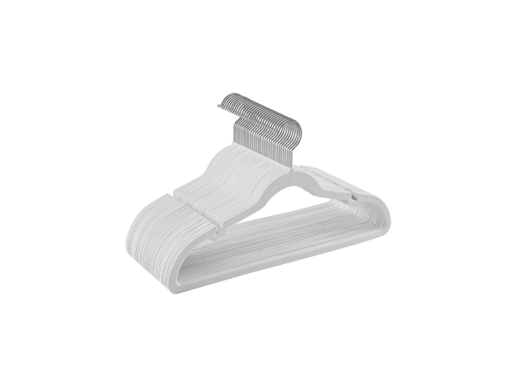 Sametová ramínka, balení 30 ramínek na oděvy, protiskluzová, s ramenními zářezy, tyč na kalhoty, háček otočný o 360°, šetří místo, tloušťka 0,6 cm, délka 43 cm, barva bílá.
