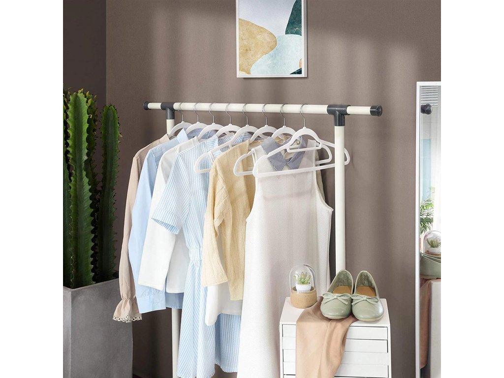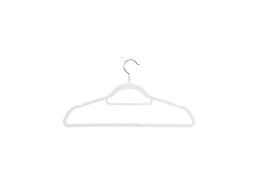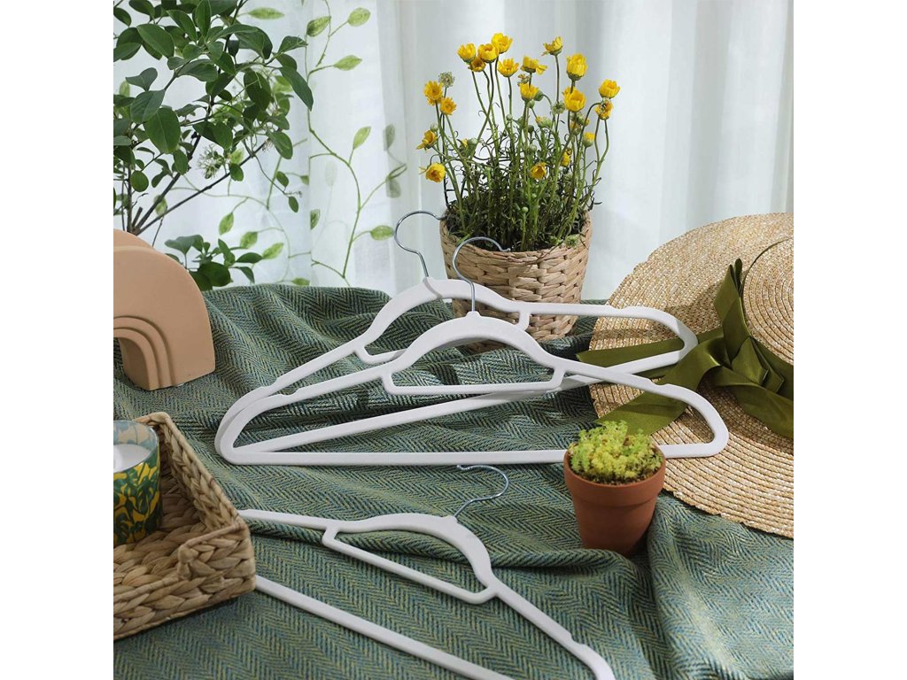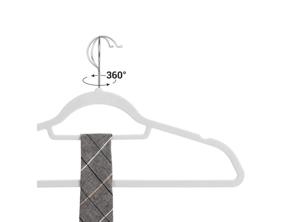 Sametová ramínka, sada 20 ramínek na oděvy, protiskluzová, s tyčí na zavazování a 360° otočným háčkem, šetří místo, tloušťka 0,6 cm, délka 43,5 cm, na šaty kalhoty, bílá.