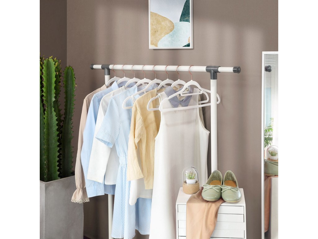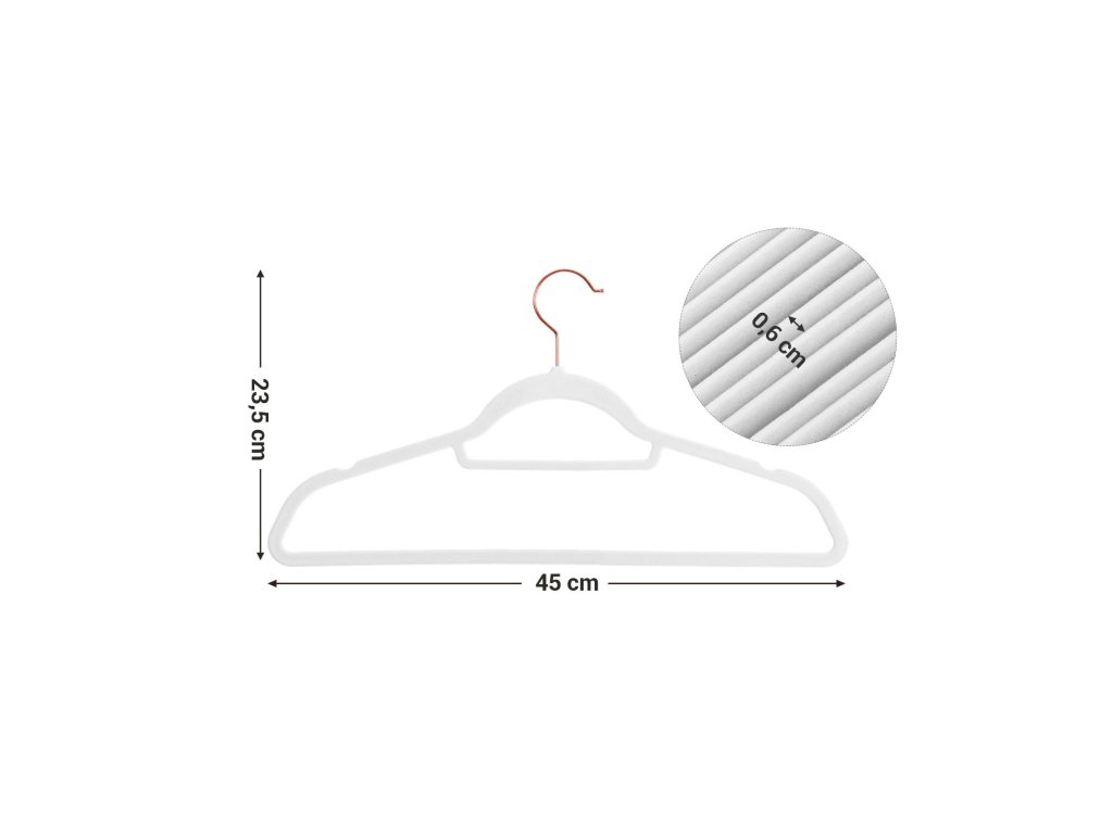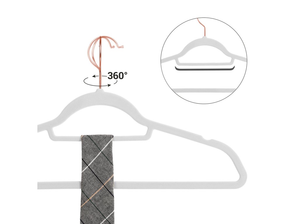 Sametová ramínka, sada 30 ramínek na oděvy, protiskluzová, s tyčí na kravatu a háčkem v barvě růžového zlata, šetří místo, tloušťka 0,6 cm, délka 43,5 cm, pro šaty kalhoty, bílá.