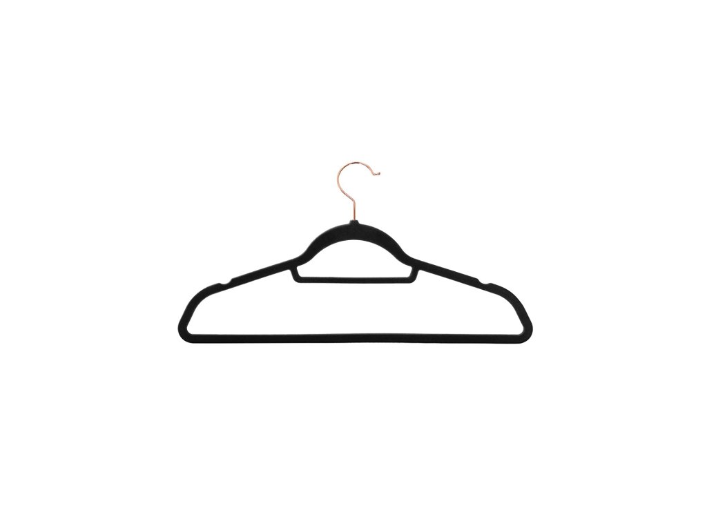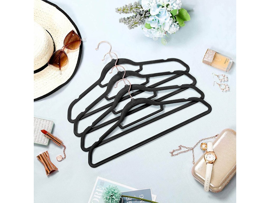 Sametová ramínka, sada 30 ramínek na oděvy, protiskluzová, s tyčí na kravatu a háčkem v barvě růžového zlata, šetří místo, tloušťka 0,6 cm, délka 43,5 cm, pro šaty kalhoty, černá.