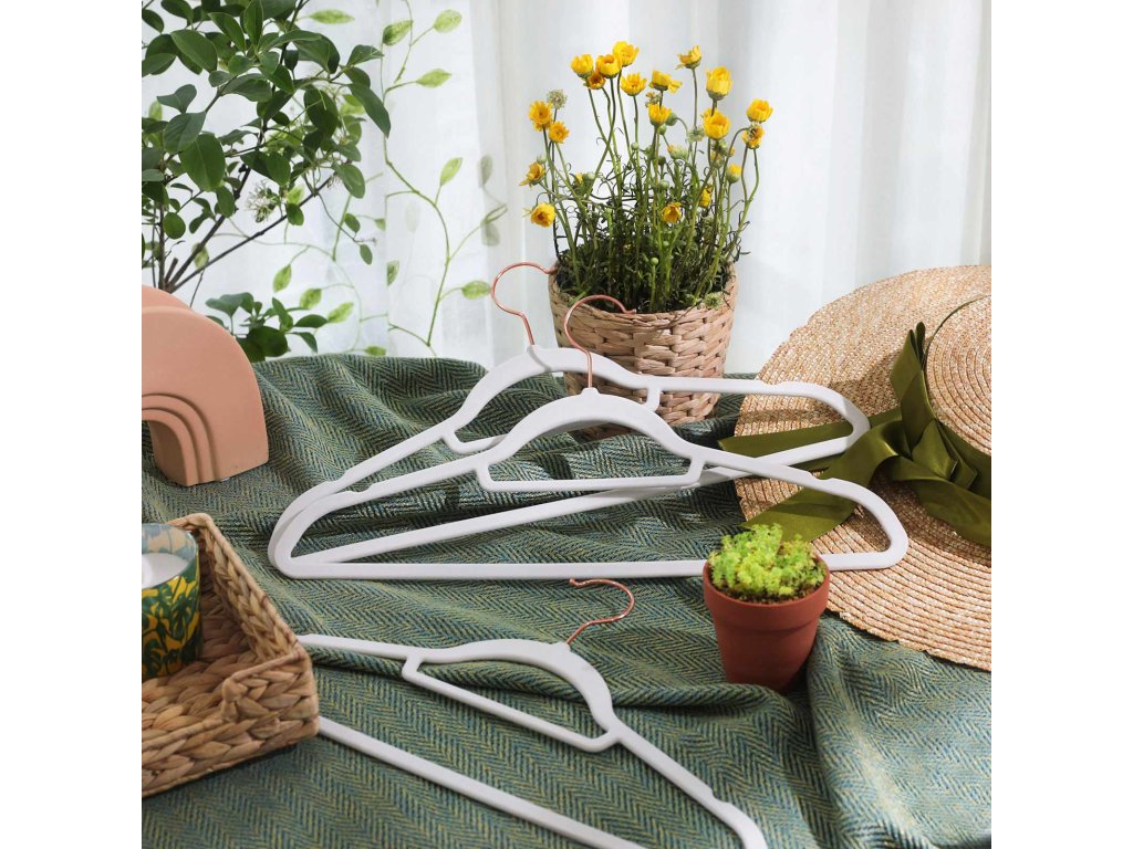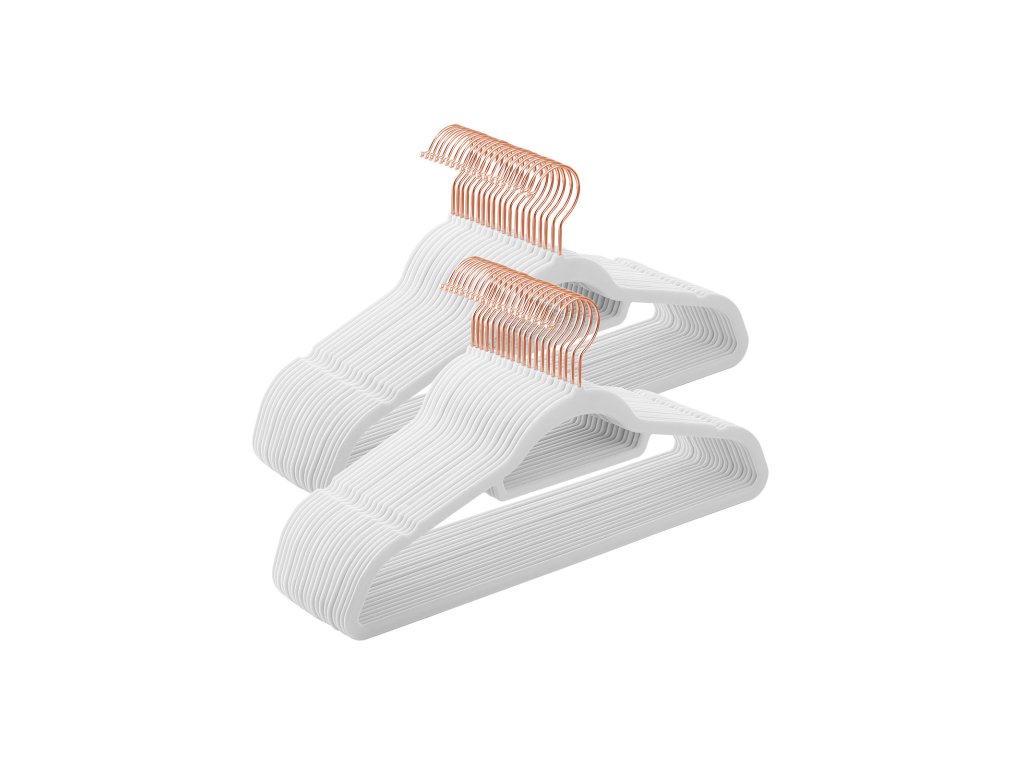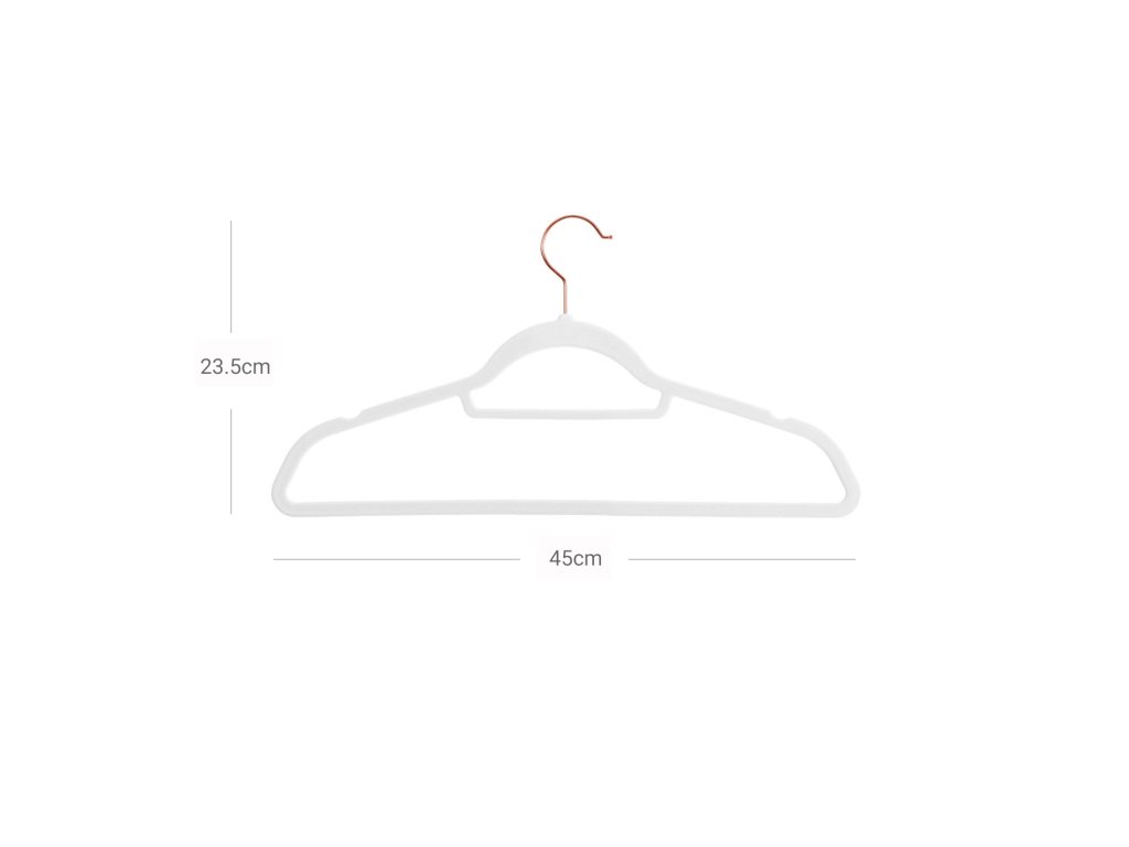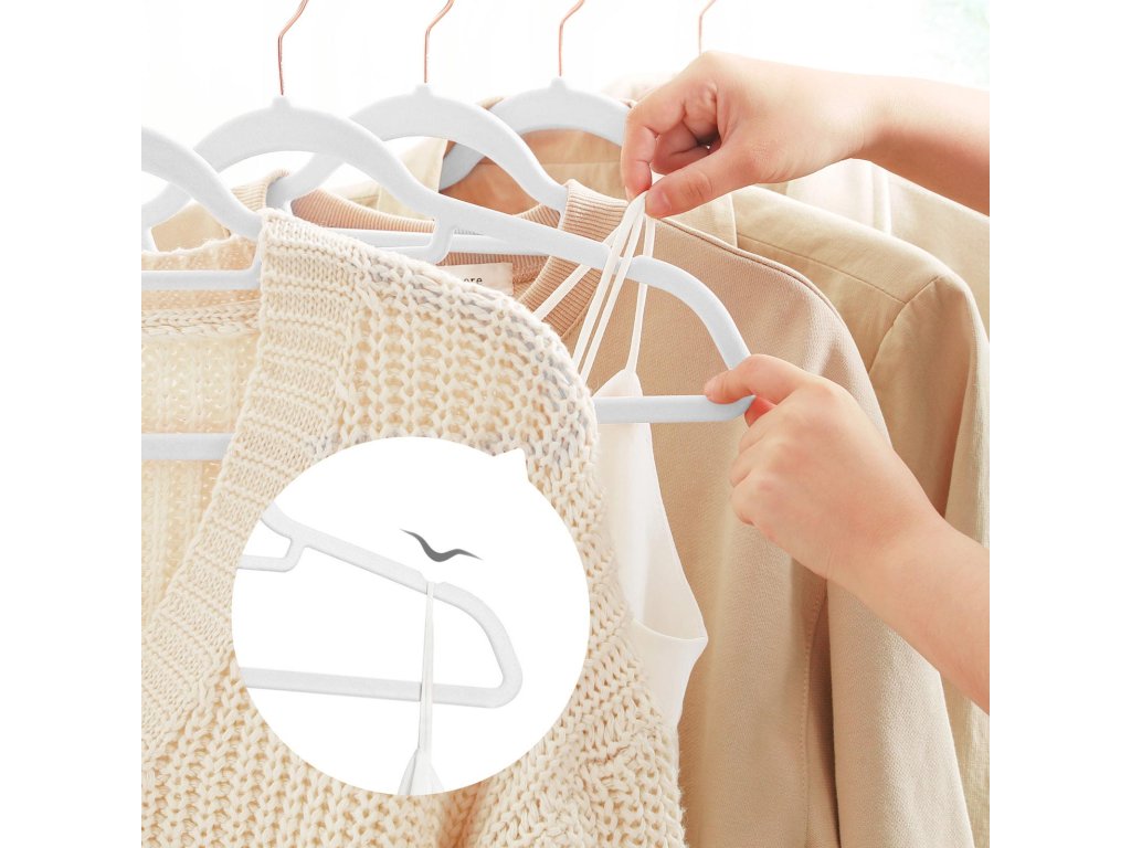 Sametová ramínka, sada 50 ramínek na oděvy, protiskluzová, s tyčí na kravatu a háčkem v barvě růžového zlata, šetří místo, tloušťka 0,6 cm, délka 43,5 cm, na šaty kalhoty, bílá.