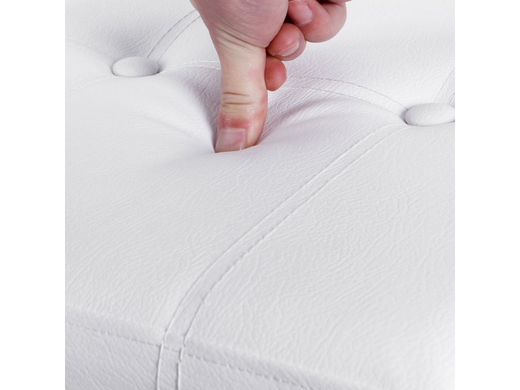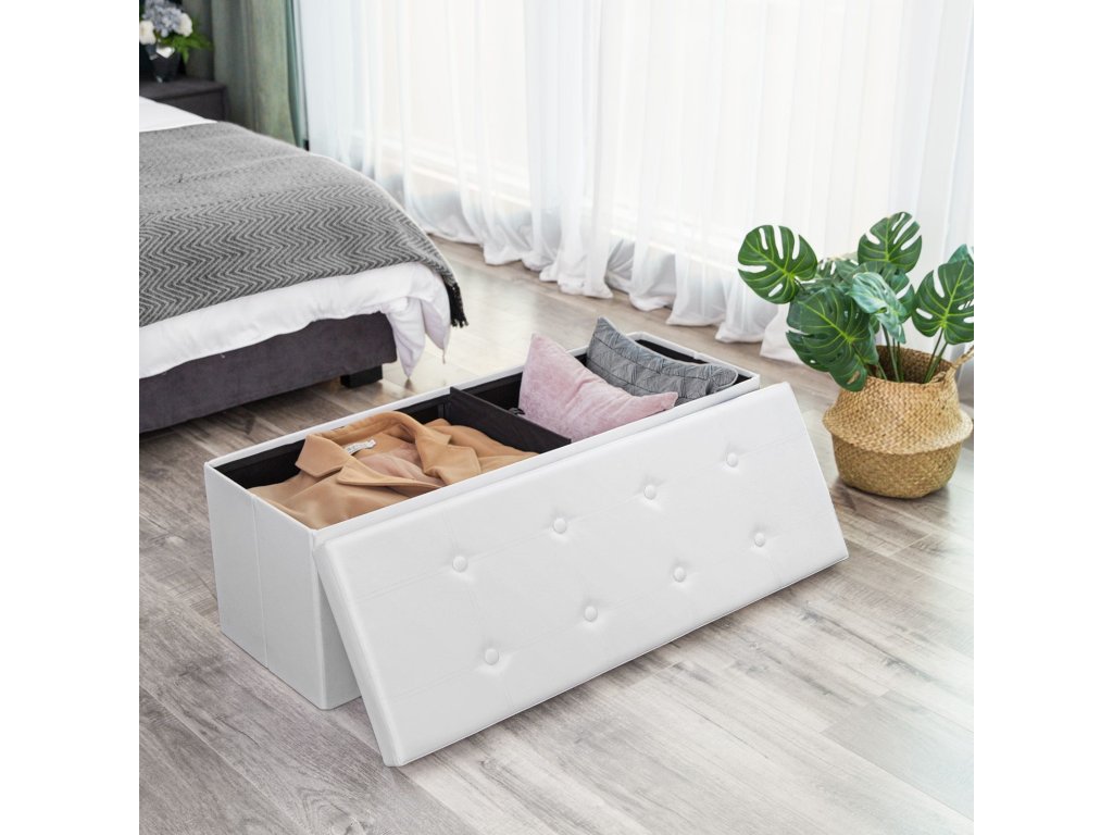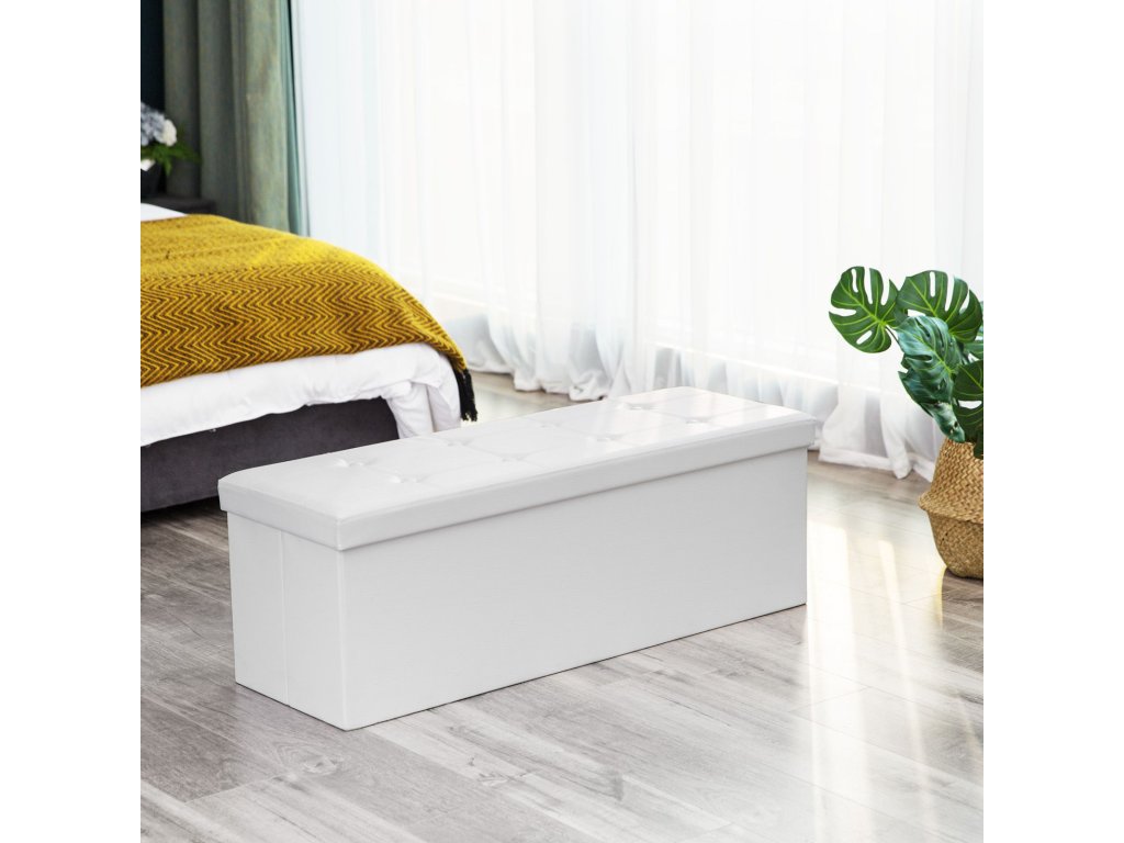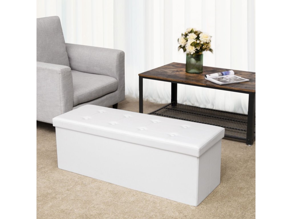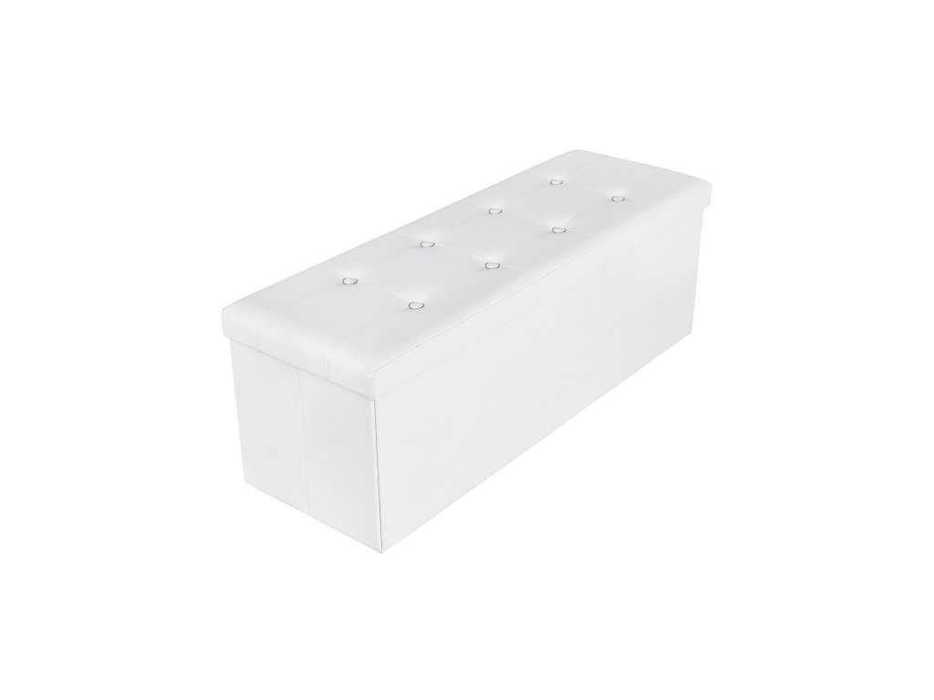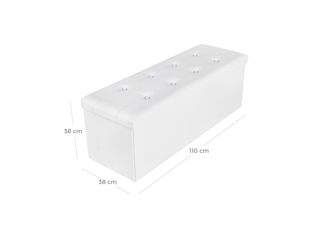 SKRYTÝ ÚLOŽNÝ PROSTOR: Extra velký objem 120 litrů je dostatečný pro různé potřeby; umístěte jej do ložnice, obývacího pokoje, předsíně, dětského pokoje nebo technické místnosti a uspořádejte v něm knihy, oblečení, přikrývky, boty, hračky a mnoho dalších drobností;KLASICKÝ DEKORATIVNÍ VZHLED: Tato úložná komoda je potažena prvotřídní umělou kůží a lze ji velmi snadno otřít vlhkým hadříkem; Knoflíky čalouněná deska lavice s dvojitým prošíváním vnese do vašeho pokoje styl;VYNIKAJÍCÍ PRO MALÉ PROSTORY: Rozměry: 43 "D x 15 "Š x 15 "V (110 x 38 x 38 cm).ROBUSTNÍ A POHODLNÉ NA SEZENÍ: Tato lavice je vyrobena z MDF desek CARB P2 a vydrží až 300 kg, snadno se na ni usadí 2-3 dospělé osoby; vysoce pružné pěnové polstrování zajišťuje pohodlné sezení.VELMI SNADNÉ NASTAVENÍ A SLOŽENÍ NA PLOCHO: Skládací konstrukce vám usnadní sestavení útulné polstrované lavičky během několika sekund; když se nepoužívá, lze ji snadno složit na plocho, skladování zabere málo místa; ideální pro ubytovny a obytné vozy;