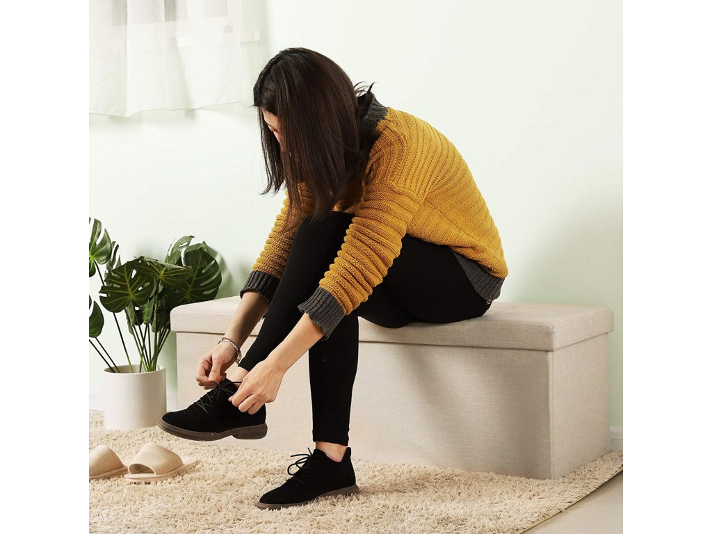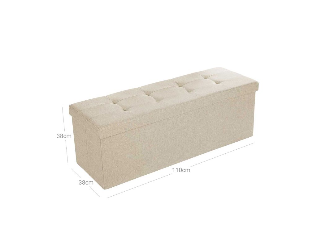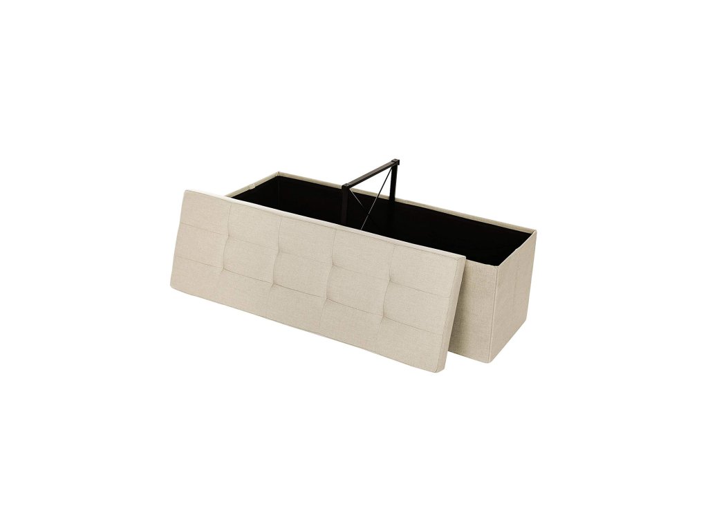 KOVOVÁ PŘEPÁŽKA PRO SILNOU PODPORU: Konstrukce je vyztužena kovovou přepážkou, která zvyšuje stabilitu; polohu přepážky lze libovolně umístit a oddělit tak vnitřní prostor pro kategorizaci úložného prostoru.MODERNÍ DESIGN A UNIVERZÁLNÍ BOX: Díky elegantnímu béžovému provedení se otoman skvěle hodí do předsíně, obývacího pokoje, ložnice a domácí pracovny, kde vytvoří jedinečný akcent; lze jej použít také jako lavici k posteli, podnožku, dočasnou stoličku nebo odkládací stolek;SKRYTÝ ÚLOŽNÝ PROSTOR O OBJEMU 120 LITRŮ: Velký box poskytuje dostatek úložného prostoru pro přehledné uspořádání hraček, peřin, povlečení, polštářů, přikrývek nebo časopisů.STAVEBNĚ PEVNÝ SE STATICKOU ÚNOSNOSTÍ DO 300 kg: Kvalitní konstrukce z MDF desek třídy E1 vám poskytne pevný a odolný úložný otoman; špičková imitace lněné tkaniny a houbové polstrování s dobrou pružností přinášejí měkké a pohodlné sezení; snadno pojme 2-3 osoby;SKLÁDACÍ PRO SNADNOU MONTÁŽ: Úložnou truhlu lze složit (rozměry ve složeném stavu: 110 x 38 x 7 cm) a v době nepoužívání ji uložit za dveře nebo do skříně, čímž ušetříte mnoho místa; celkem 4 jednoduché díly lze sestavit za 1 minutu;| Kategorie: | Lavice do předsíně |