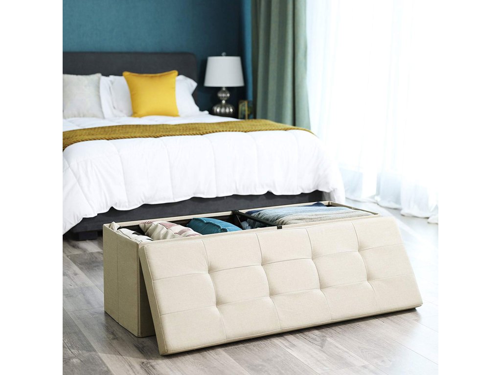 Skládací úložný osmanský stolek, lavice s čalouněním, stolička na nohy s víkem, imitace lněné tkaniny, 120 l, nosnost až 300 kg, 110 x 38 x 38 cm (d x š x v), béžová.