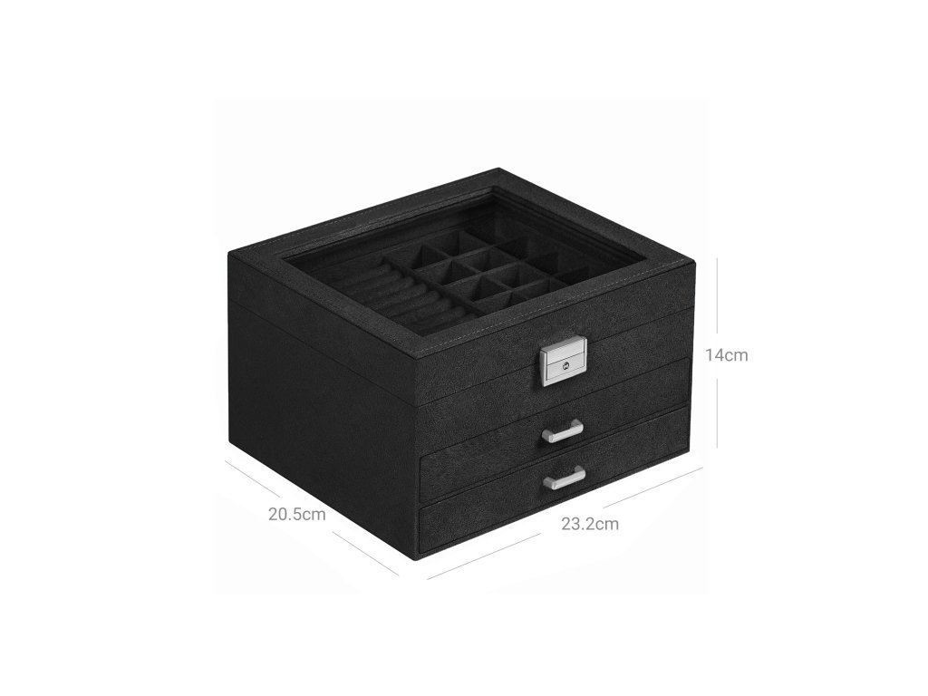 DENÍČEK KRÁSY: Je váš oblíbený šperk důvodem vaší dobré nálady? Postavte tuto šperkovnici na vrchol toaletního stolku a všechny své lesklé, třpytivé kousky uvnitř, doplňte svůj outfit. a vykročte do nového dne jako sluneční paprsek!VYBAVENÝ PROSTOR: Zamotání, uzly, ztracené kousky - s tím už si nikdy nebudete muset dělat starosti. Tento kufr má trojici stupňovitých přihrádek včetně 8 kroužkových rolí, 12 kostek, 4 dlouhých slotů a 2 vyjímatelných přihrádek; horní skleněné okno je ozdobou;PERLY VE SKŘÍNI: Díky dřevěnému rámu a měkkému sametu na vnější i vnitřní straně budou vaše poklady v této šperkovnici plně chráněny - žádný prach, žádné škrábance. neztrácejí lesk - takže na vás budou vždy zářit jako nové.Přitahuje vás: Texturovaný samet, úhledné prošívání a kování ve stříbrném odstínu - tato šperkovnice není nikdy obyčejná. Proč nedat tento pozorný dárek svým blízkým, kteří by si přáli trochu barvy a světla do svého života?.CO ZÍSKÁTE: černá šperkovnice o rozměrech 23,2 x 20,5 x 14 cm, skleněným víkem pro rychlý pohled dovnitř, zámkem s klíčem a různými přihrádkami i na hodinky, manžetové knoflíčky a další věci.| Kategorie: | Šperkovnice |