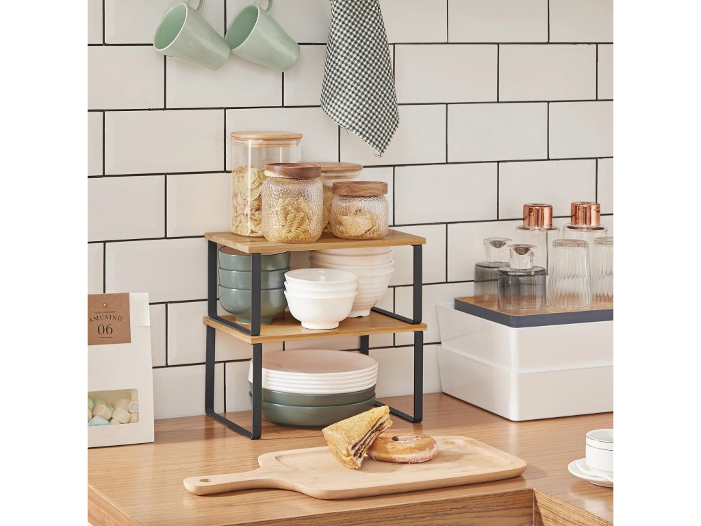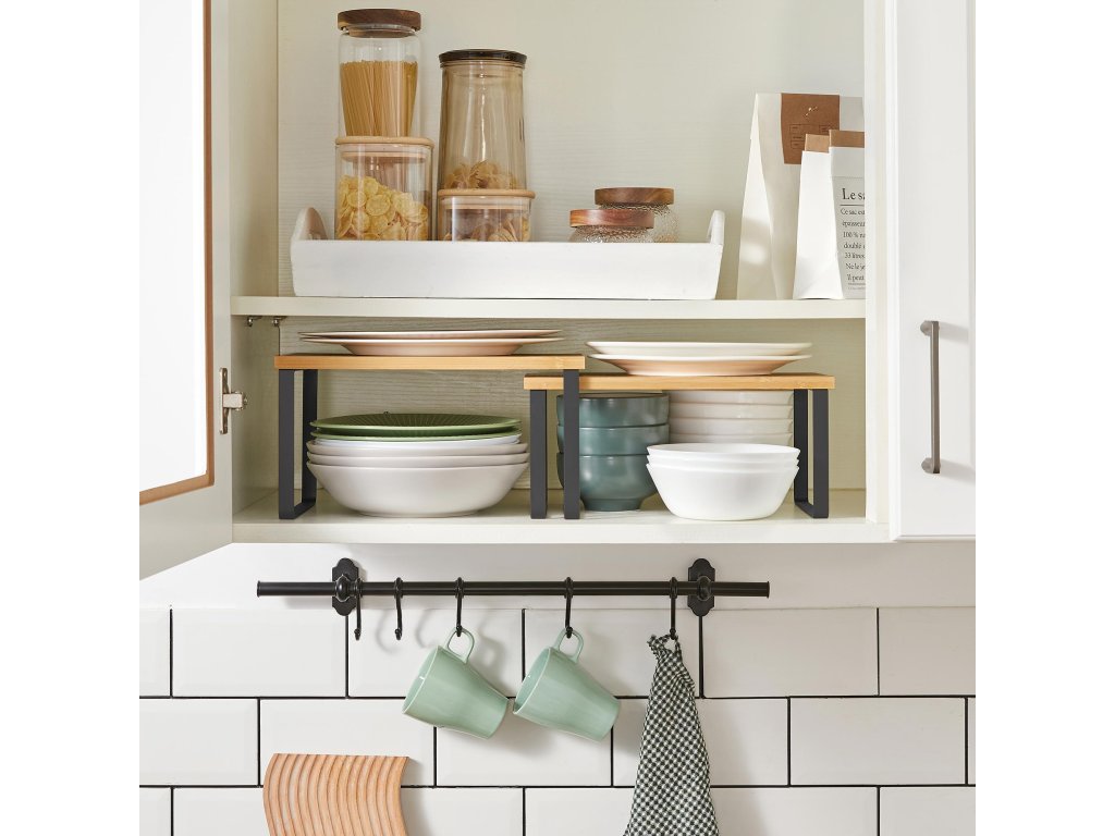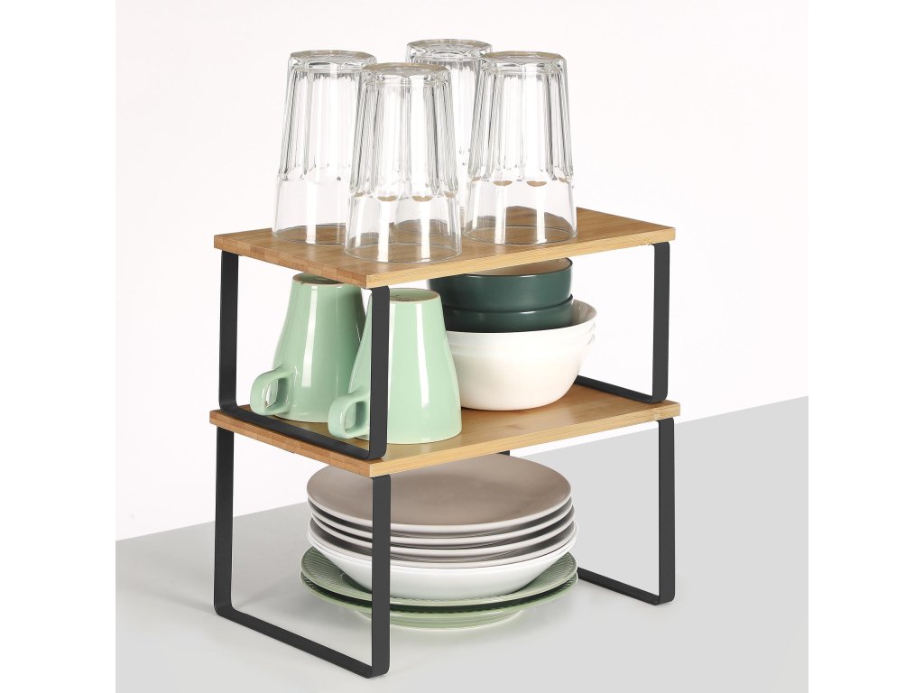 Stojan na koření, sada 2 policových organizérů do skříněk, rozšiřitelný policový organizér do kuchyně, stohovatelný držák na koření, kov a bambus, černý a přírodní.