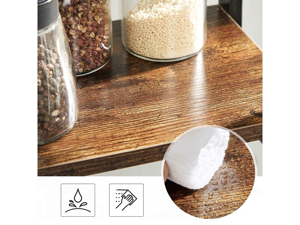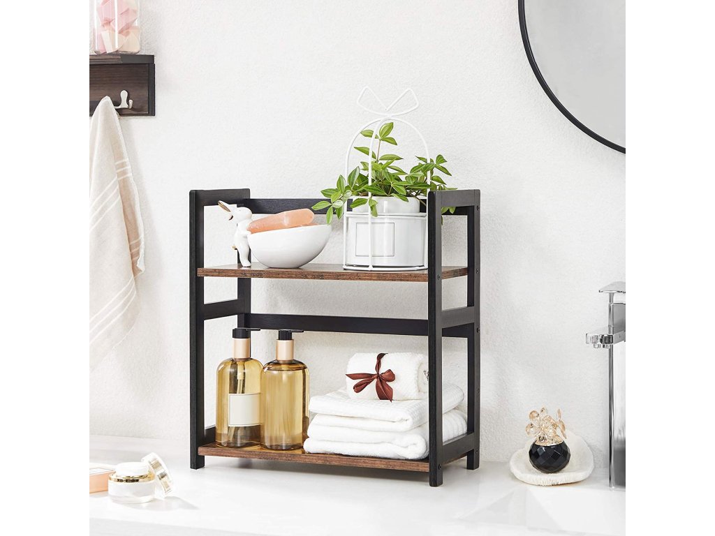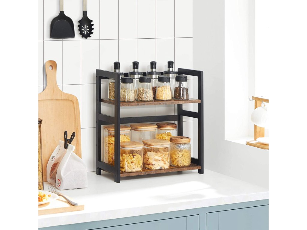 Udělejte si prostor pro svou vášeň: Máte vášeň pro vaření? Pak se nenechte rušit špinavou pracovní deskou. Pozvěte si do kuchyně tento dvoupatrový stojan na kořenky a uvolněte si více místa, abyste mohli předvést své kuchařské umění!.Plná chuti: cukr pro sladké, ocet pro kyselé, sůl pro slané... počkat, je tu ještě jedna. Tento pultový regál se 2 policemi s bohatou kresbou dřeva a černým rámem se sám o sobě pyšní okouzlujícím rustikálním nádechem.Bezpečná kuchyně, šťastné vaření: Poslední věc, kterou v kuchyni chcete, je chatrná police. Proto je tento úložný regál vyroben z vysoce odolného bambusu a umělého dřeva, takže se nemusíte bát, že se vám při přípravě velké večeře něco zhroutí.Mimo kuchyň... Tato police má také nekonečné možnosti. Na počítačovém stole na kancelářské potřeby, v koupelně na toaletní potřeby a líčidla nebo v obývacím pokoji na hrnky... seznam je dlouhý.