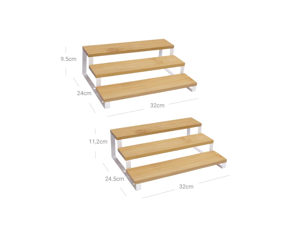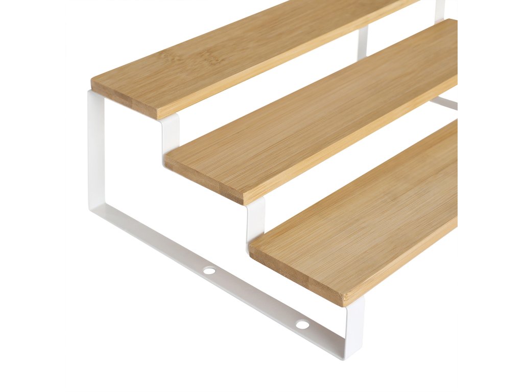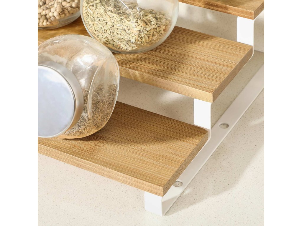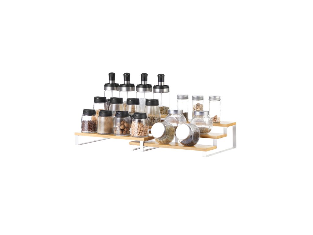 Stojan na kořenky, sada 2 policových organizérů do skříně, třípatrový výsuvný držák na kořenky, bambus, stohovatelný, do spíže, skříně, na desku, přírodní a bílý.