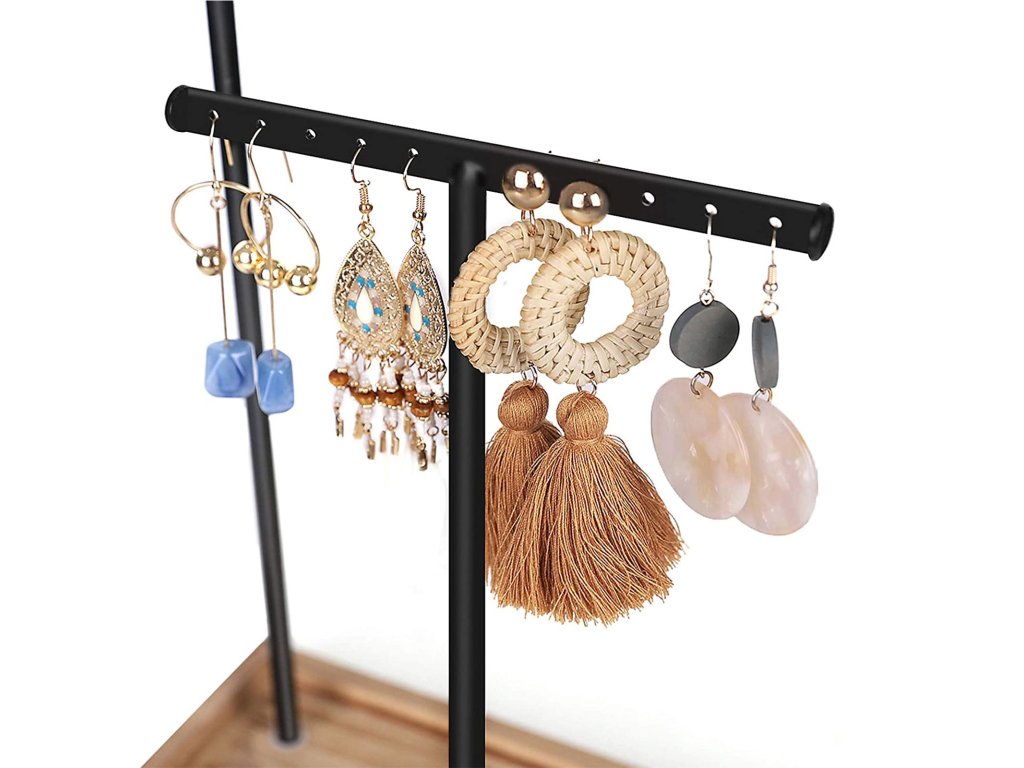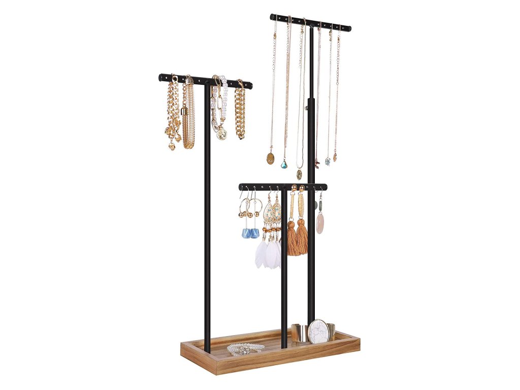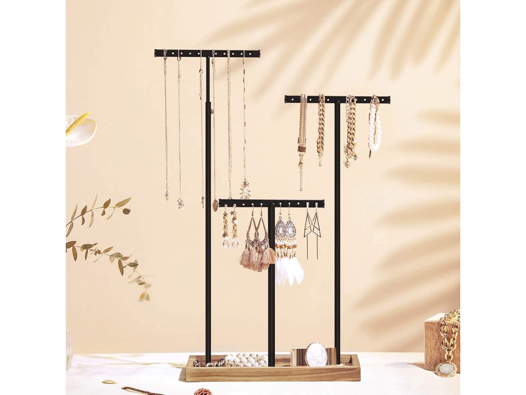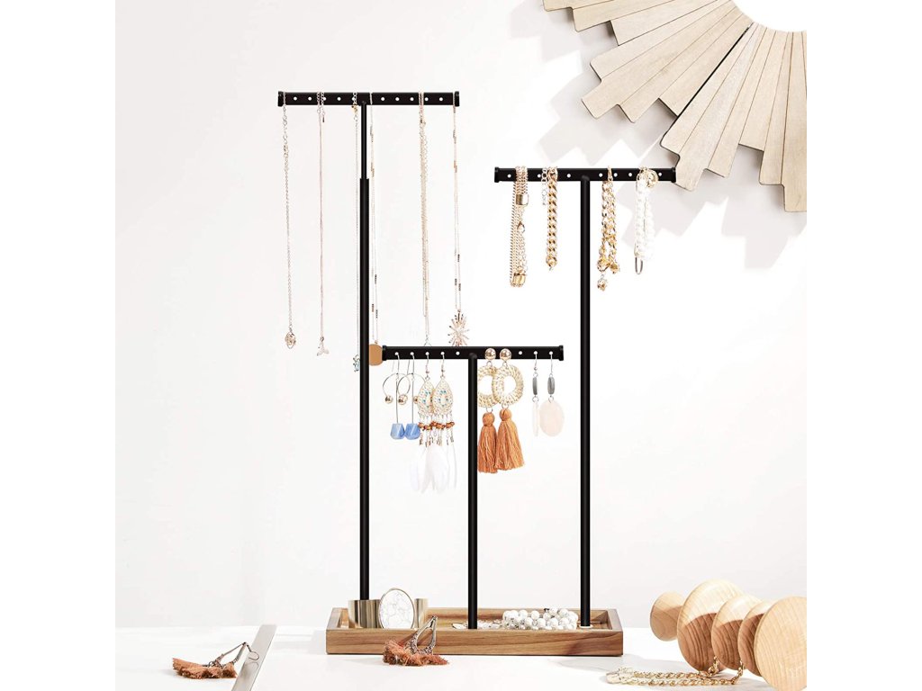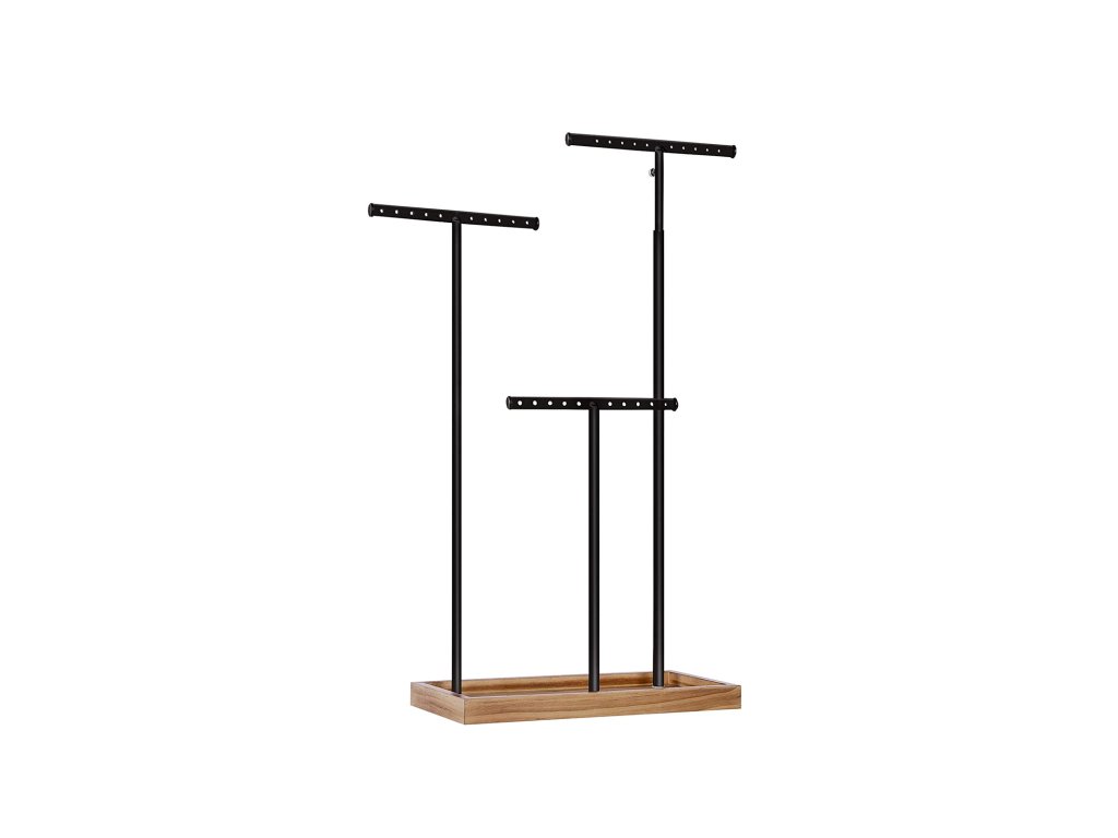 Stojan na šperky 2 v 1, stojan na šperky, 3 kovové tyče ve tvaru T s otvory, úložný zásobník, nastavitelný, dlouhý náhrdelník náramek náušnice prsten, rustikální hnědá a černá.