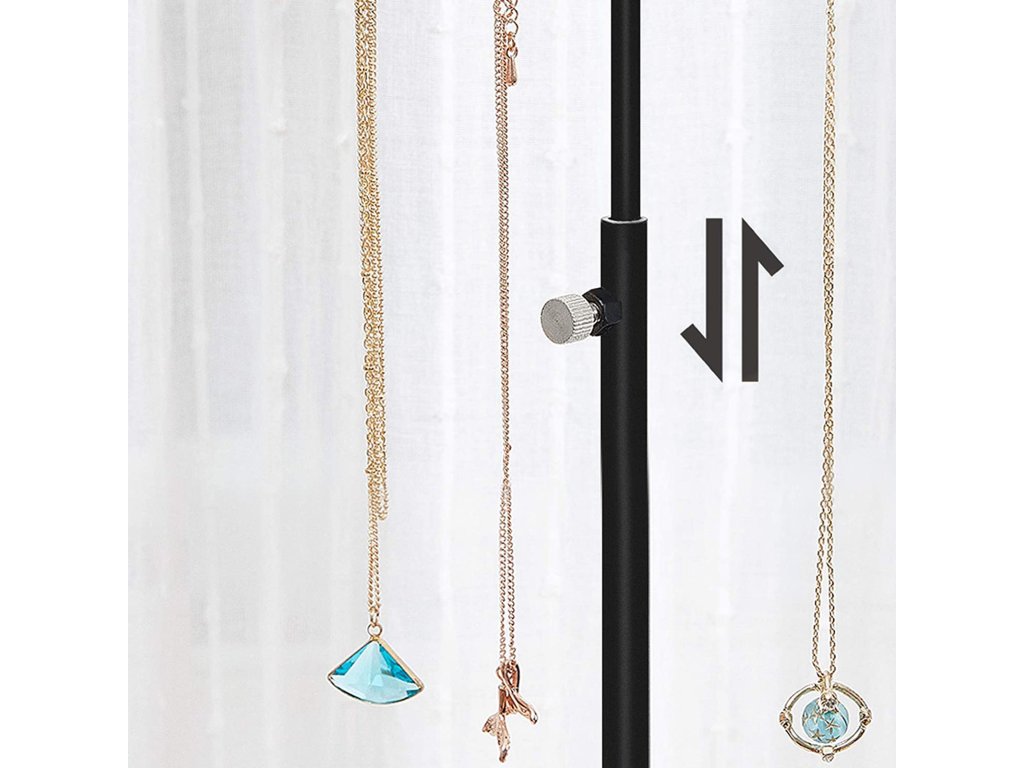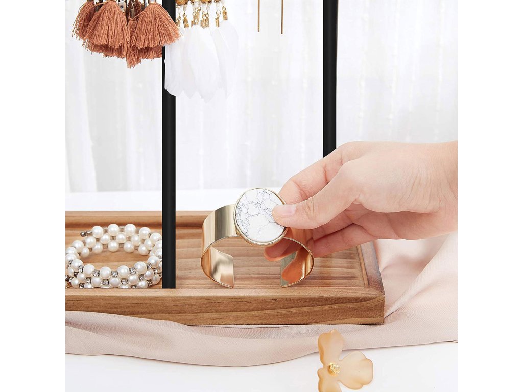 Milovníci šperků, POZOR: Kdy jste naposledy měli problémy se zamotanými náhrdelníky, ztracenými náušnicemi a dalšími věcmi? nebo poškozené šperky? Pokud je odpověď "vždy", udělejte si radost a vyberte si tento stojan na šperky se třemi kovovými tyčemi.NASTAVUJEME VYSOKOU LÁVKU: S tímto stojanem na šperky se 3 tyčemi v různých výškách se zamotané náhrdelníky stanou minulostí! Jednu z tyčí lze nastavit v rozmezí 40-54 cm. takže i vaše dlouhé náhrdelníky najdou svůj domov!BEZ KOMPROMISU ŠPERKŮ: Vaše prsteny a brože najdou své místo ve spodní přihrádce na šperky. Ta je připravena přivítat všechny ty, které nenašly své místo nahoře!TŘÍDIT, UKLÁDAT, UDRŽOVAT VE FORMĚ: Tento stojan na šperky s celkem 30 otvory (10 na tyč) nabízí vyhrazené, tříděné místo pro uložení vašich cenností, jako jsou náušnice, náramky a další. krásně vystavené a snadno dostupné náhrdelníkyURČITĚ ZAPŮSOBÍ! Díky hnědému podnosu z borovicového dřeva a pěkným černým linkám není prostor pro faux pas! Jeho věčně hřejivý design z něj dělá nejen efektní dárek pro milovníky šperků, ale i pro ty, kteří si ho chtějí pořídit. ale vnese do vašeho interiéru elegantní nádech a zároveň vylepší vaše šperky.