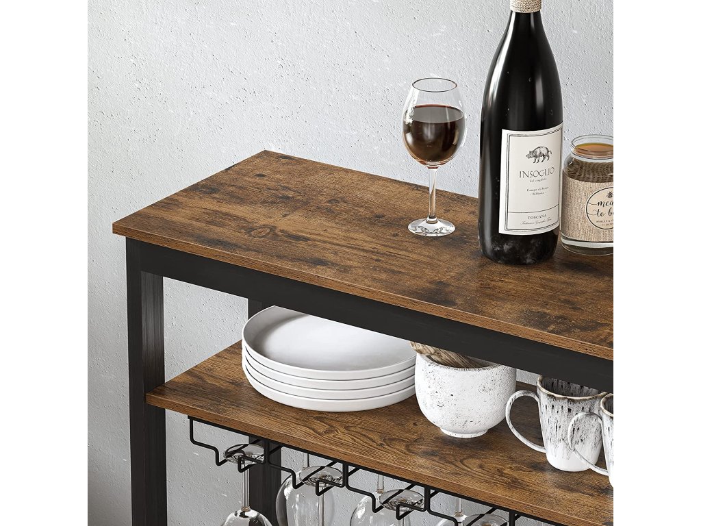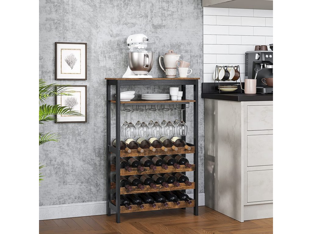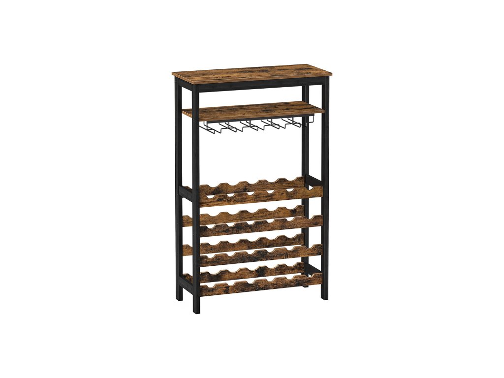 Stojan na víno, 24 lahví vína se skleněnými držáky pro kuchyňský bar. Vintage hnědo-černý.