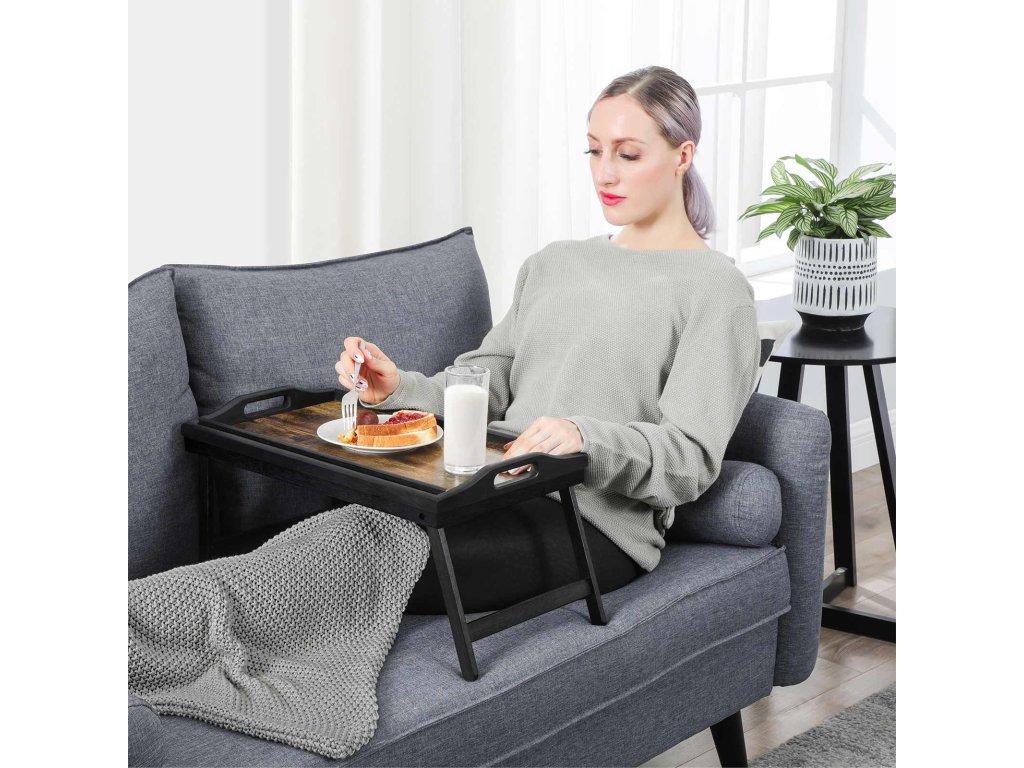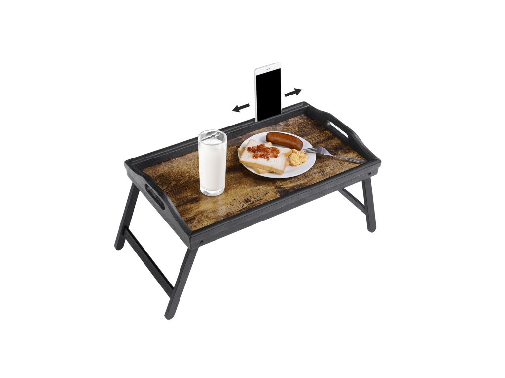 Stolek na postel s bambusovými skládacími nohami, podnos na snídani na pohovku, postel, servírovací podnos na občerstvení s drážkou na telefon, tablet, stůl na notebook, rustikální hnědá.