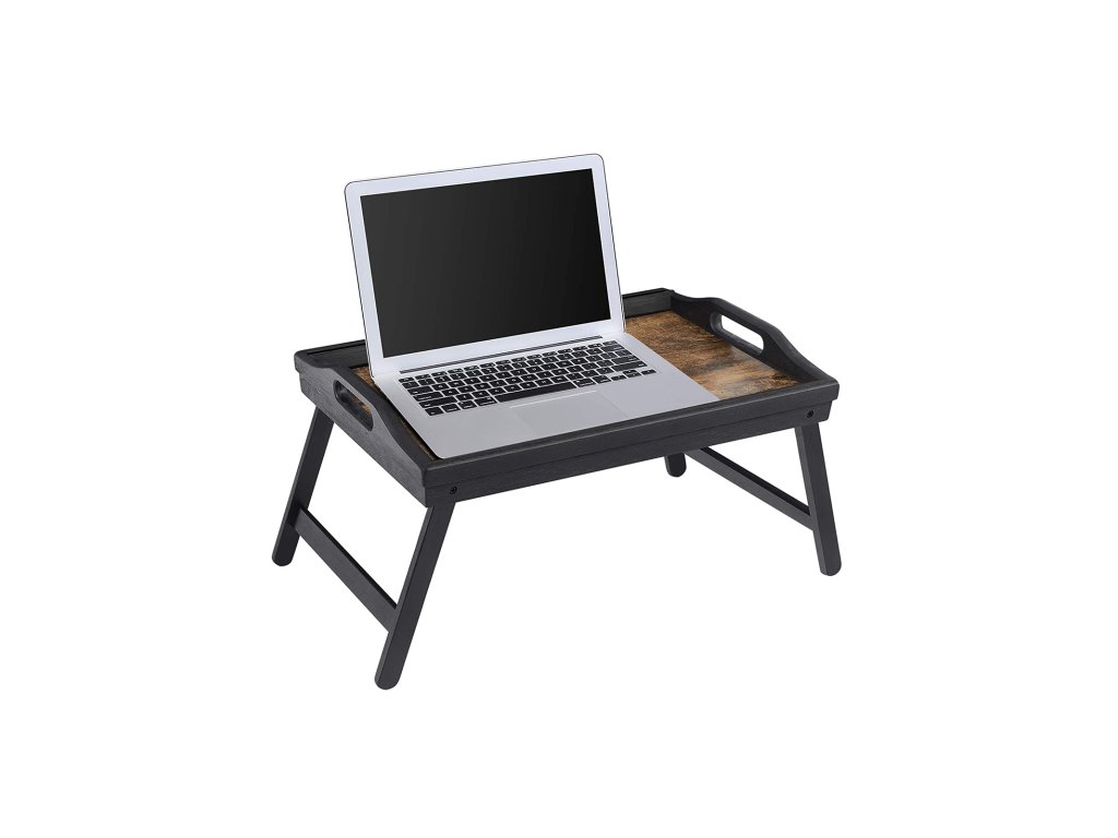 Stolek na postel s bambusovými skládacími nohami, podnos na snídani na pohovku, postel, servírovací podnos na občerstvení s drážkou na telefon, tablet, stůl na notebook, rustikální tmavě hnědý.