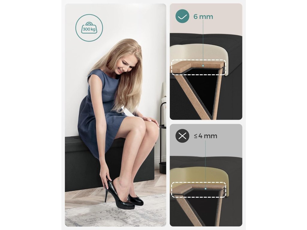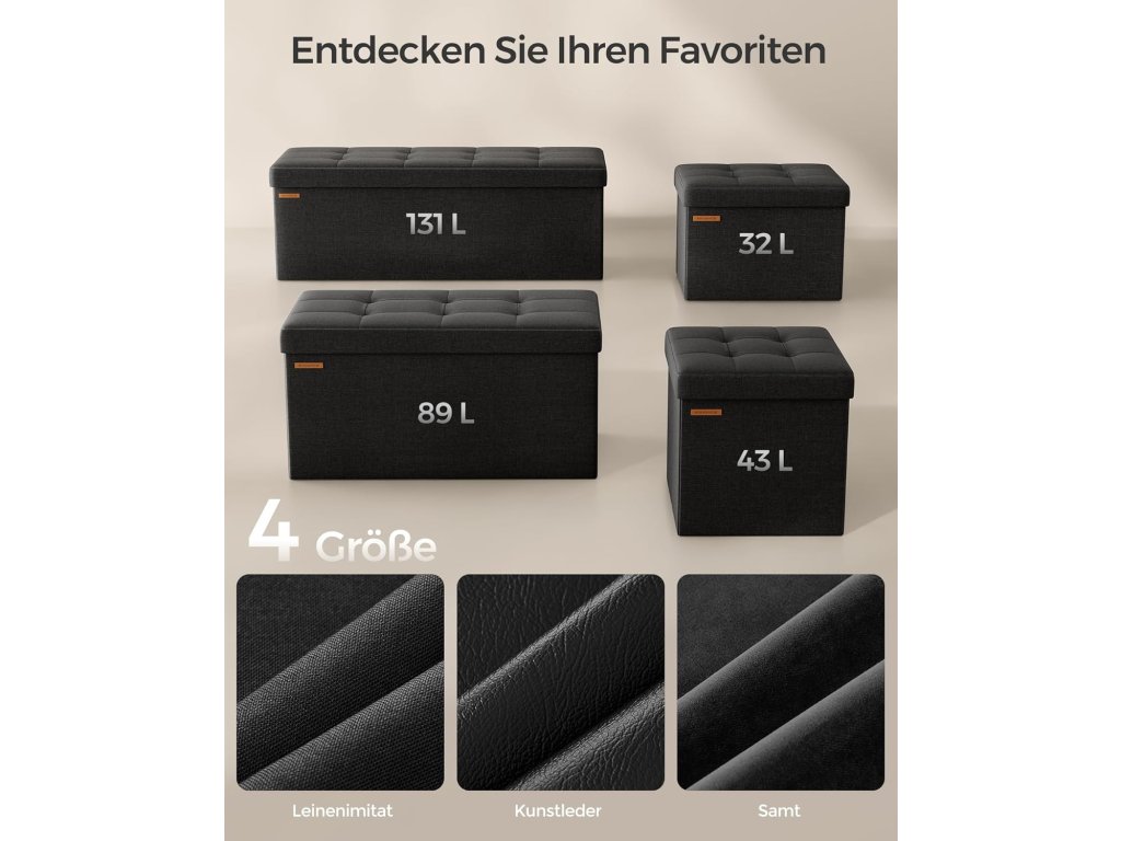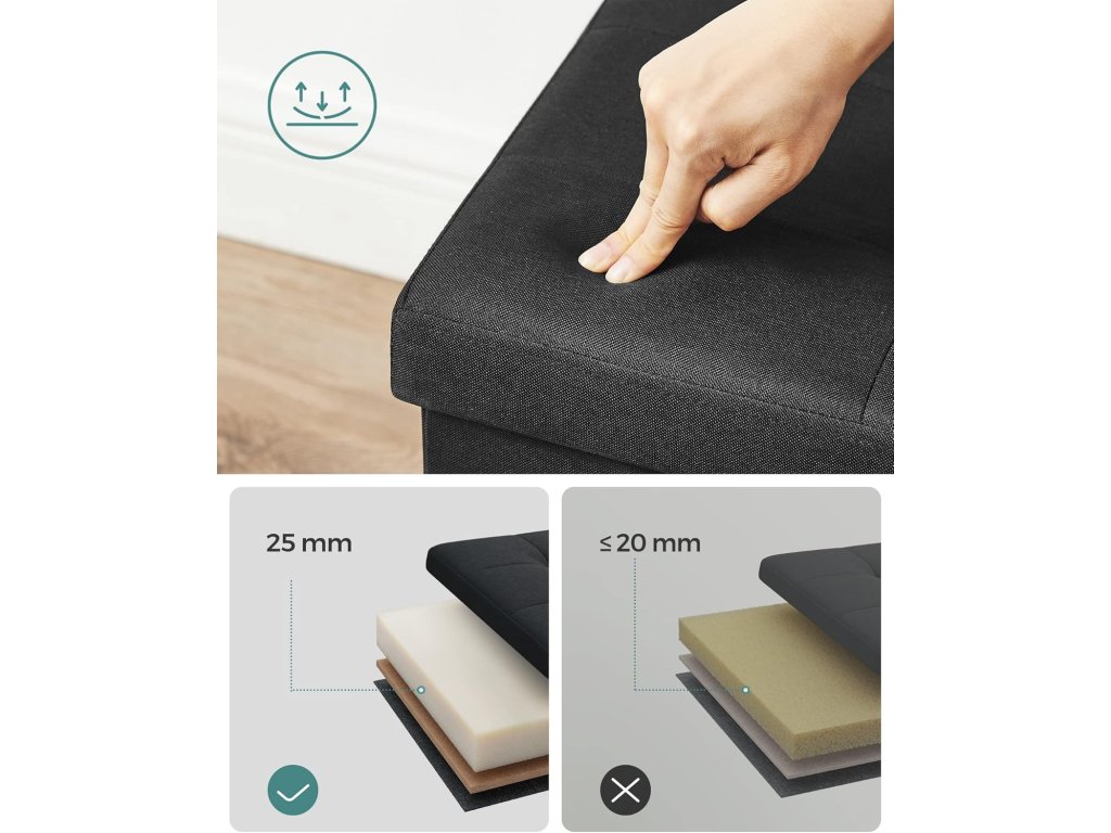 Elegantní design a vysoký komfort sezení: taburet má elegantní povrch z umělého lnu s prošívaným vzorem a vnese do vašeho pokoje styl. Dvouvrstvá tkanina a vysoce elastická pěna zajišťují dlouhotrvající pohodlí při sezení.Dlouhá životnost: díky robustním panelům z MDF a kovovým výztuhám na rozích víka. tento sedací kufr unese až 300 kg - odolné a spolehlivé řešení pro sezení nebo skladování.Dostatek úložného prostoru: tato lavice o rozměrech 38 x 110 x 38 cm nabízí úložný prostor o objemu 131 litrů. Díky odnímatelné přepážce můžete ukládat a třídit knihy, oblečení a přikrývky, bez přepážky lze uložit větší předměty, například lůžkoviny.Snadné otevírání a skládání: stačí vložit základní desku a truhla je připravena k použití. Když je nepoužíváte, můžete je jednoduše složit a uložit pod postel nebo do skříně, abyste ušetřili místo.Všestranné využití: tato skládací stolička slouží jako úložný box, opěrka nohou a dokonce i jako konferenční stolek Skvěle se hodí do obývacího pokoje, ložnice, předsíně nebo šatny a splňuje různé potřeby.| Kategorie: | Taburety |