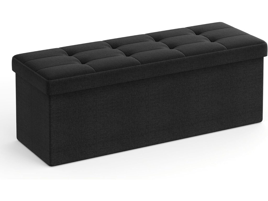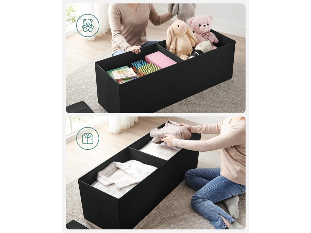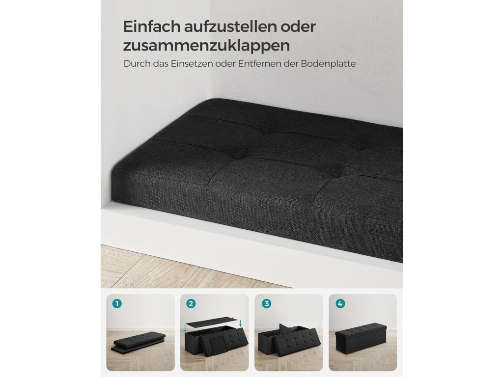 Stolička s úložným prostorem, skládací lavice, 38 x 110 x 38 cm podnožka, úložný box, maximální nosnost 300 kg, do obývacího pokoje, ložnice, předsíně, inkoustově černá barva.