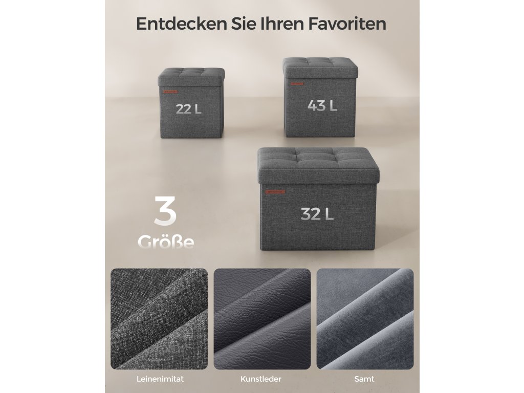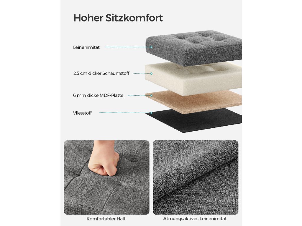 Elegantní design a vysoký komfort sezení: taburet má elegantní povrch z umělého lnu s prošívaným vzorem a vnese do vašeho pokoje styl. Dvouvrstvá tkanina a vysoce elastická pěna zajišťují dlouhotrvající pohodlí při sezení.Robustní a odolné: toto sedadlo ve tvaru kostky je vyrobeno z masivních desek MDF a unese až 130 kg. Poskytuje tak spolehlivé a odolné sedadlo a úložný prostor.Chytré řešení úložného prostoru: tato podnožka o rozměrech 30 x 30 x 30 cm s objemem 22 litrů je ideální pro uložení oblečení, knih a časopisů.Snadné otevírání a skládání: stačí vložit základní desku a truhla je připravena k použití. Když je nepoužíváte, můžete je jednoduše složit a uložit pod postel nebo do skříně, abyste ušetřili místo.Všestranné využití: tato skládací stolička slouží jako úložný box, podnožka a dokonce i jako konferenční stolek. Skvěle se hodí do obývacího pokoje, ložnice, předsíně, šatny nebo pokoje na koleji a splňuje různé potřeby.| Kategorie: | Taburety |