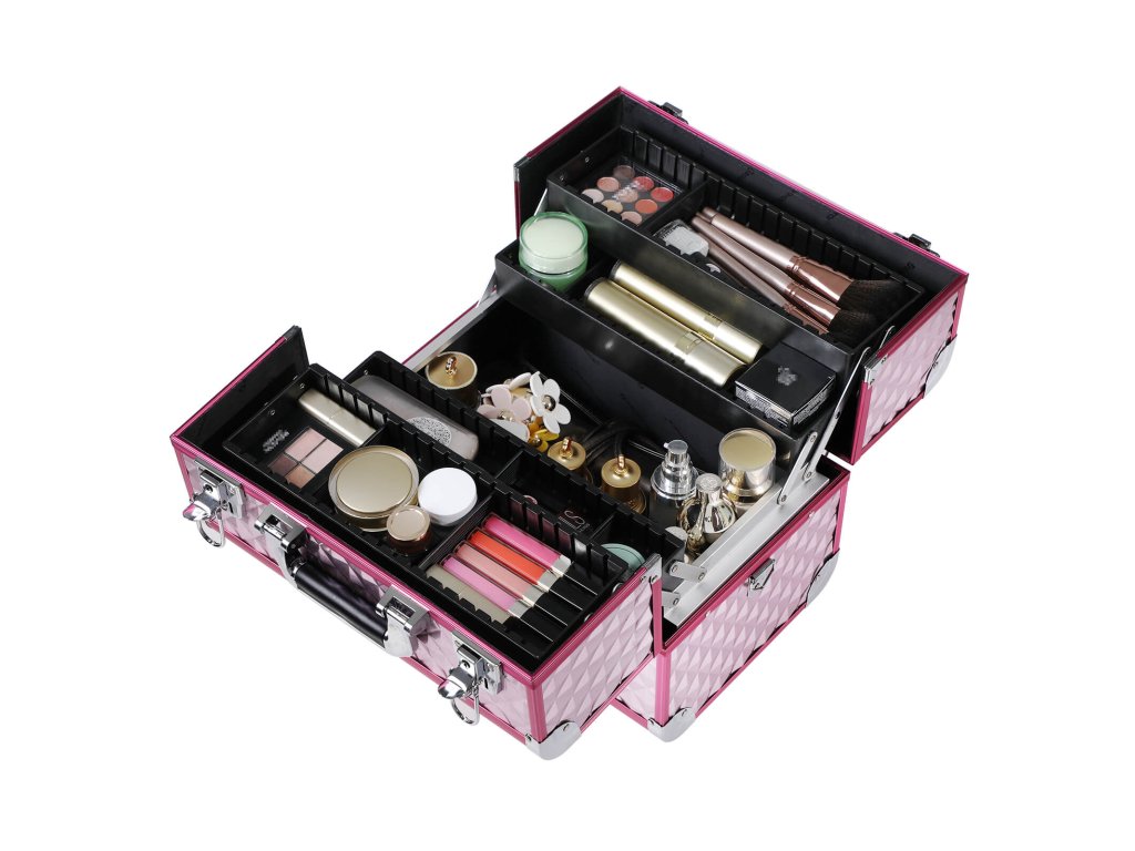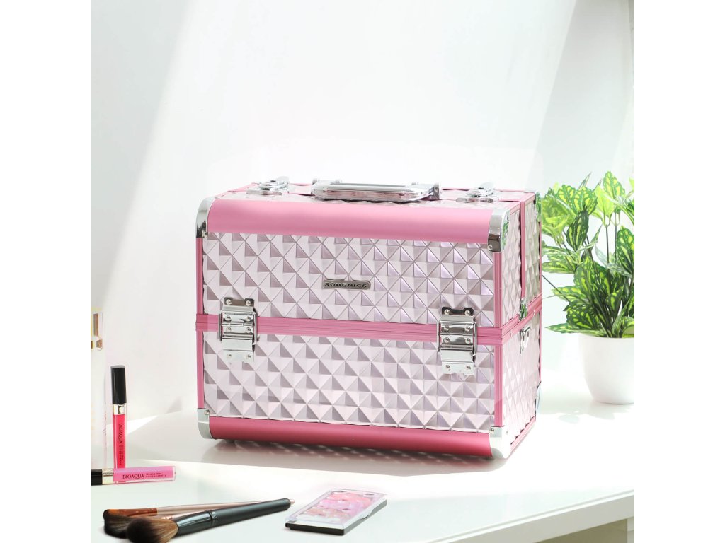 Stříbrno-růžový kosmetický kufřík s diamantovým vzorem, pro vizážisty, velký cestovní úložný prostor, na šperky, nehty a vlasové doplňky.