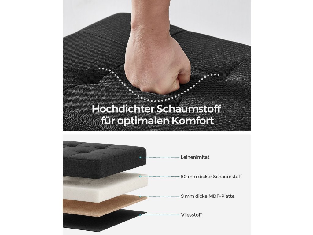 Stylové a robustní: Tato lavice je vyrobena ze stylového umělého lnu a je jemně prošitá; zesílené MDF panely a rohy s kovovým krytem vytvářejí celkově robustní konstrukci, která lavici poskytuje vysokou nosnost 300 kg;Pohodlné sedadlo Tento úložný box je polstrovaný pěnou s vysokou hustotou a potažený umělým plátnem, takže poskytuje měkké, podpůrné a prodyšné sedadlo a zajišťuje vysoký komfort.Všestrannost Skládací sedací truhla o rozměrech 38 x 76 x 40 cm nabízí velký objem 77 litrů a lze ji použít jako podnožku na konci postele. jako konferenční stolek v obývacím pokoji nebo pod oknem.Dřevěné nožičky: Díky 4 dřevěným nožičkám se podlaha pod skříňkou snadno čistí. Přiložené podložky pod nohy jsou protiskluzové a zároveň chrání podlahu před poškrábáním.Snadné sestavení a složení Rozložte, vložte základní desku, připevněte nožičky - tento sedací kufr lze rychle sestavit. Když je nepoužíváte, můžete je snadno složit a uložit, abyste ušetřili místo.| Kategorie: | Taburety |