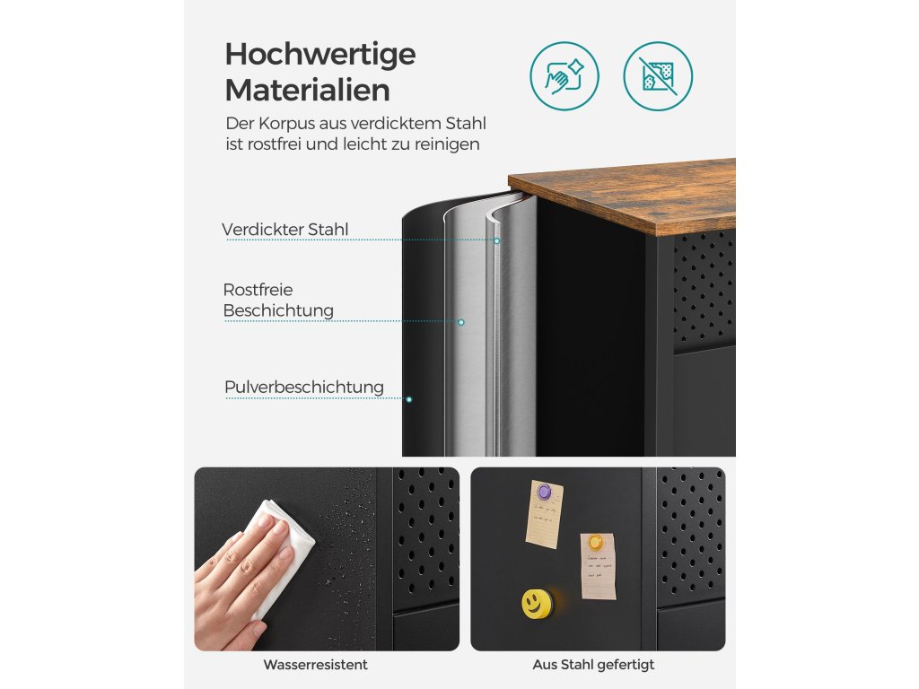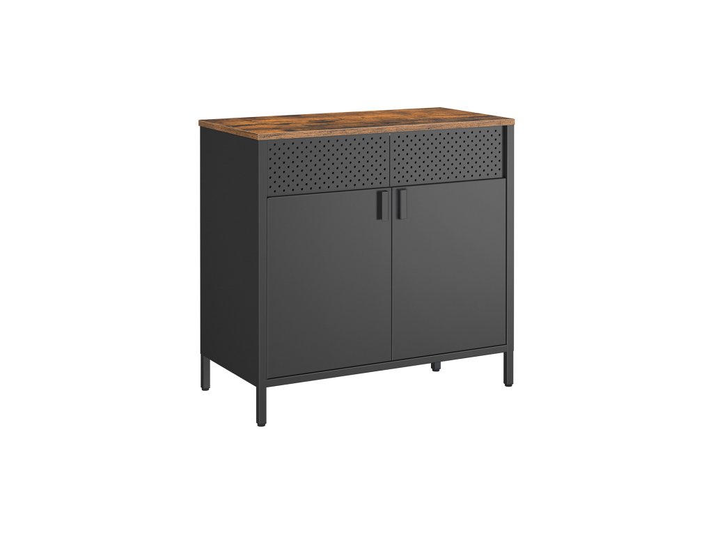 Úložná skříň, dvoudveřová podlahová skříňka s magnetickým zavíráním, nastavitelná police, ocelový rám, industriální styl, úspora místa, rustikální hnědá a černá.