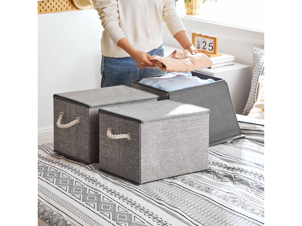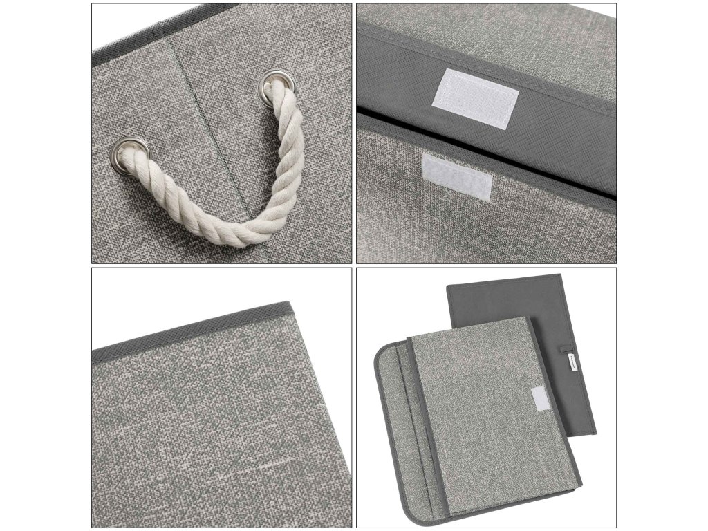 Úložné boxy s víkem, sada 3 látkových úložných boxů a organizérů s bavlněnými úchyty, lněný vzor, šedá.
