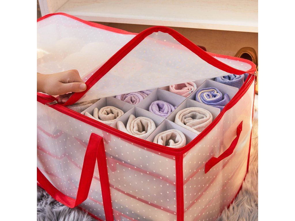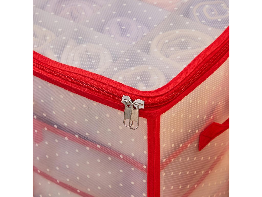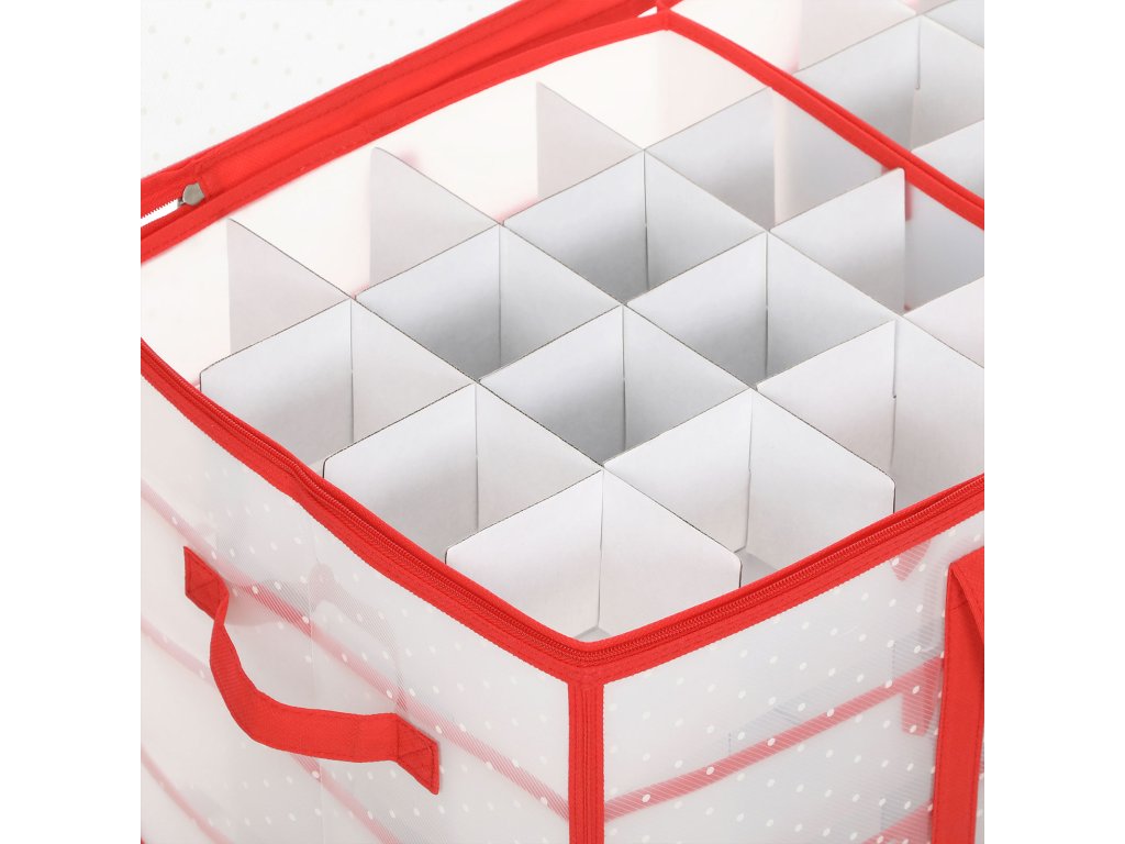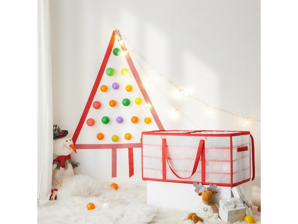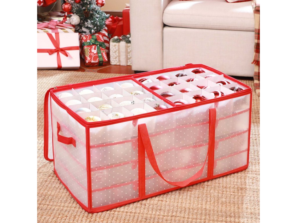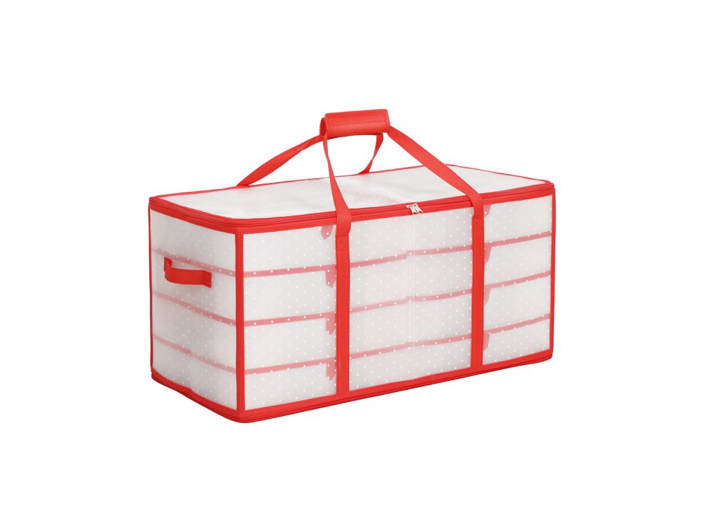 Úložný box na vánoční ozdoby, úložný box na vánoční ozdoby, 128 míst v boxu, modulární přepážky, 67 x 34 x 34 cm, poloprůhledný a červený.