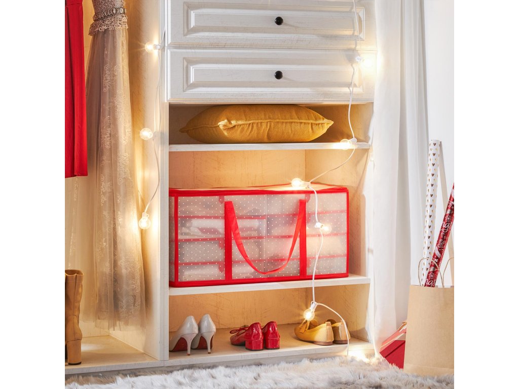 Obklopeni vánoční náladou V obývacím pokoji hraje vánoční hudba a vy věšíte koule na stromeček z pytle... počkat. Tašku? Vaše drahocenné dekorace si zaslouží lepší, kouzelné místo, jako je tato průsvitná krabice!.Dobrý postřeh! Nemusíte trávit dvě hodiny otevíráním všech krabic na půdě, abyste našli své ozdoby, poloprůhledné stěny ukazují, co je uvnitř. Uff! Jaká úspora času!ozdoby, šišky Rolničky Rádi si dopřáváte různé druhy vánočních dekorací? Uložte je do této odolné a vlhkuvzdorné plastové krabičky z PP, aby si zachovaly svůj lesk i na příští Vánoce.Vše je v pořádku Díky modulárním přepážkám mají všechny vaše vánoční ozdoby své vlastní místo (max. počet koulí: 128). Také 8 přihrádek usnadňuje jejich ukládání a vyjímání. Už se nemusíte honit za dekoracemi!.Co dostanete 1 úložný box na vánoční ozdoby se zipem, úchyty, rozdělovači a 8 přihrádkami. Dopřejte svým ozdobám domov ještě dnes!| Kategorie: | Úložné boxy |