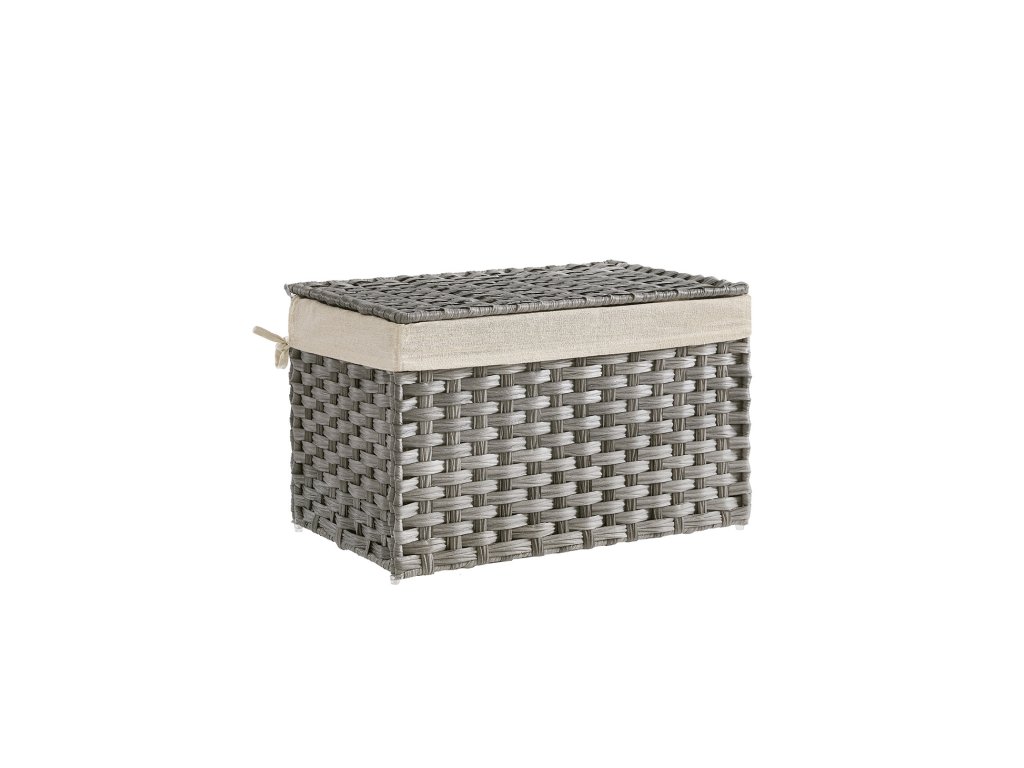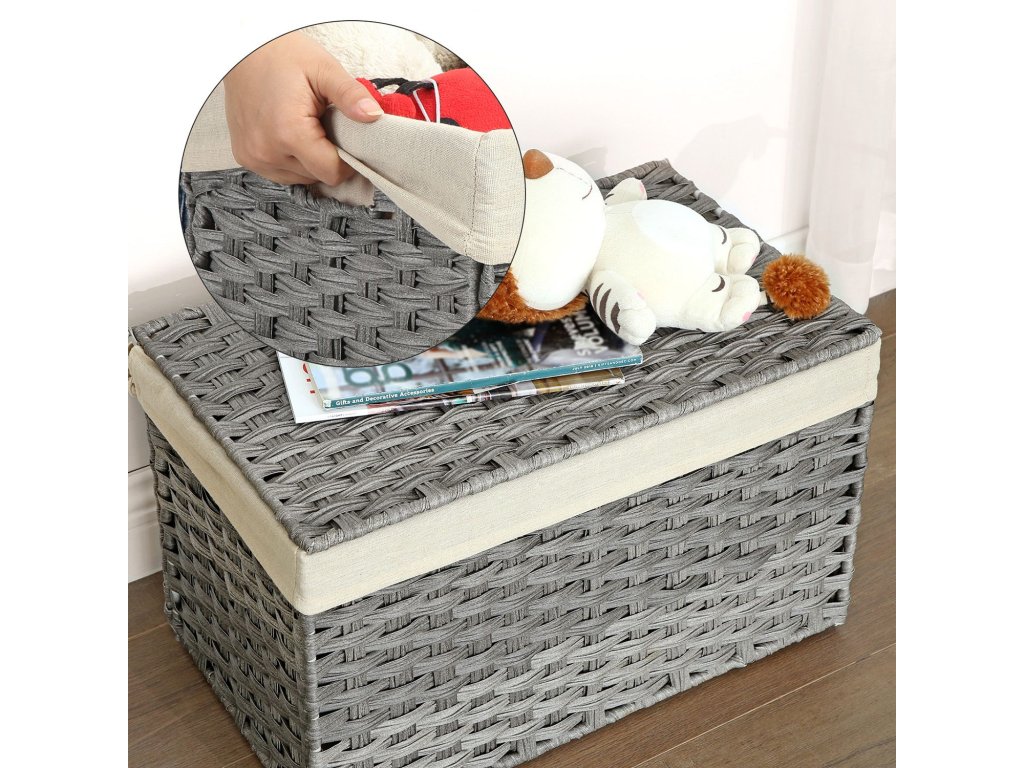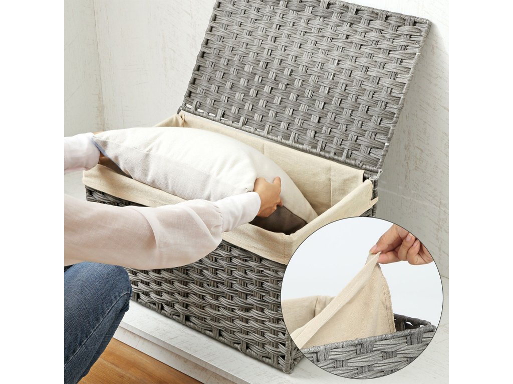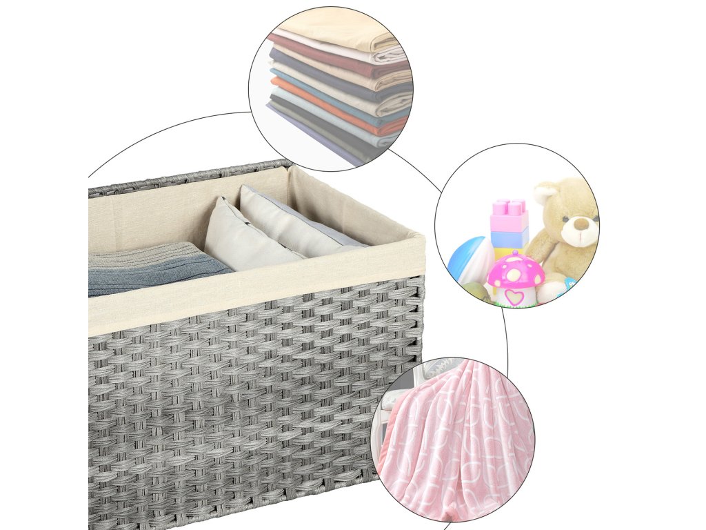 Úložný box v ratanovém stylu, vnitřní úložný koš, 65l, dekorativní koš s víkem, úchyty, úložný kufr, šedá.