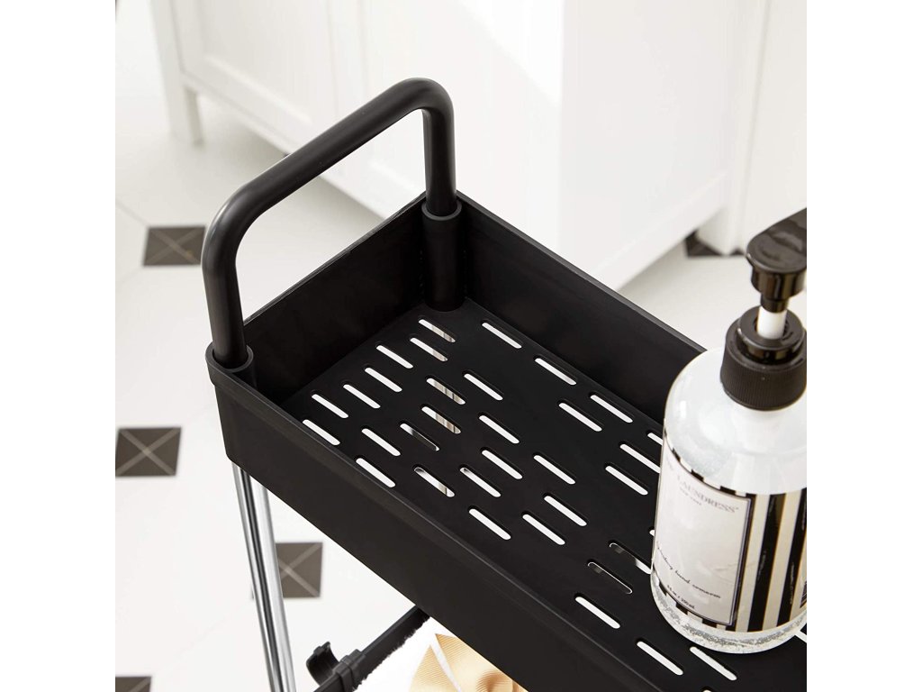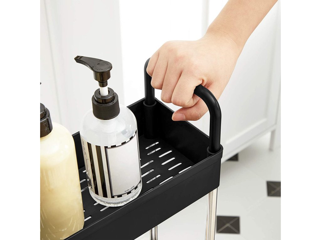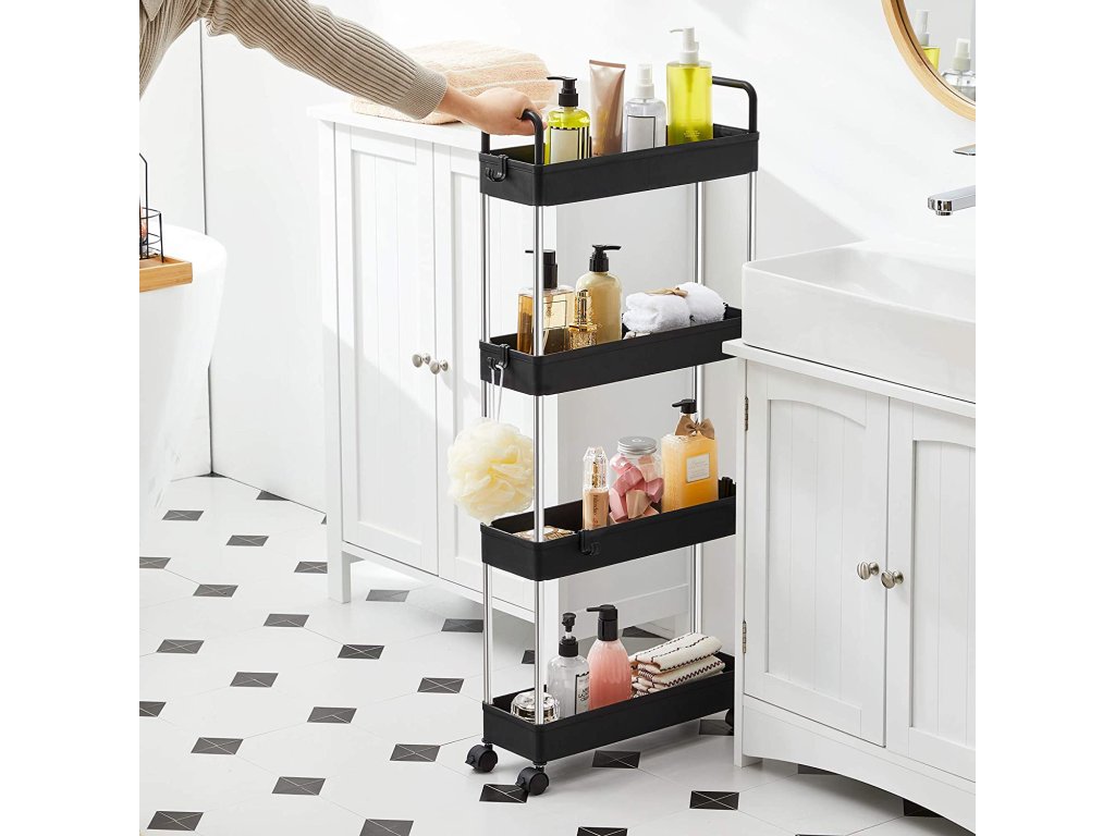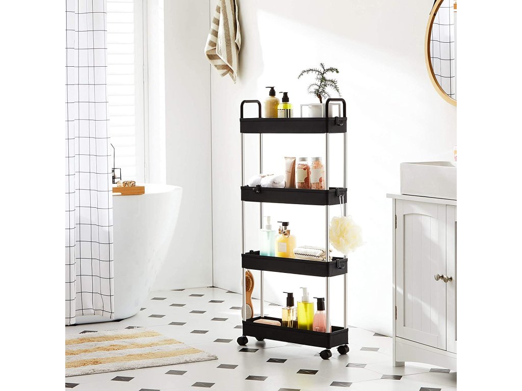 Úložný vozík, tenký vozík, 4-patrový kuchyňský úložný vozík, úzký koupelnový vozík s kolečky a madly, 40 x 13 x 93 cm, černý.